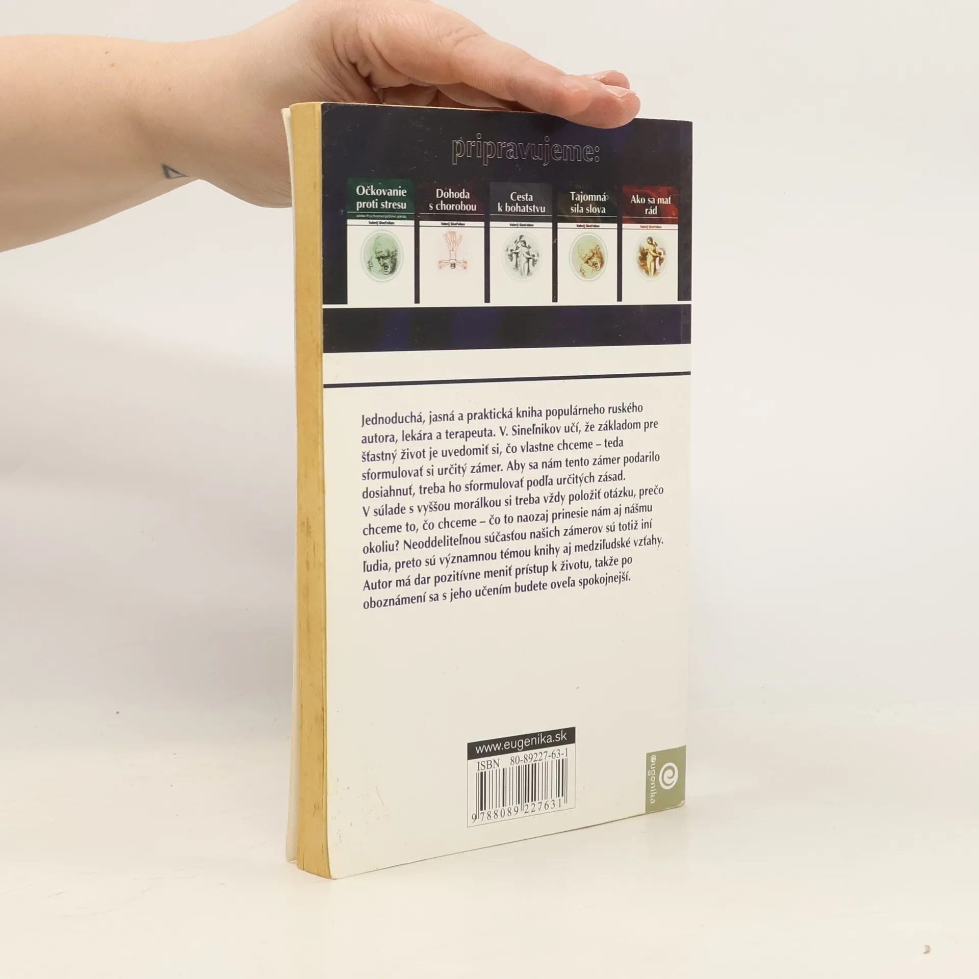 Jednoduchá, jasná a praktická kniha populárneho ruského autora, lekára a terapeuta. V. Sineľnikov učí, že základom pre šťastný život je uvedomiť si, čo vlastne chceme – teda sformulovať si určitý zámer. Aby sa nám tento zámer podarilo dosiahnuť, treba ho sformulovať podľa určitýchzásad. V súlade s vyššou morálkou si treba vždy položiť otázku, prečo chceme to, čo chceme – čo to naozaj prinesie nám aj nášmu okoliu? Neoddeliteľnou súčasťou našich zámerov sú totiž iní ľudia, preto sú významnou témou knihy aj medziľudské vzťahy. Autor má dar pozitívne meniť prístup k životu, takže po oboznámení sa s jeho učením budete oveľa spokojnejší.