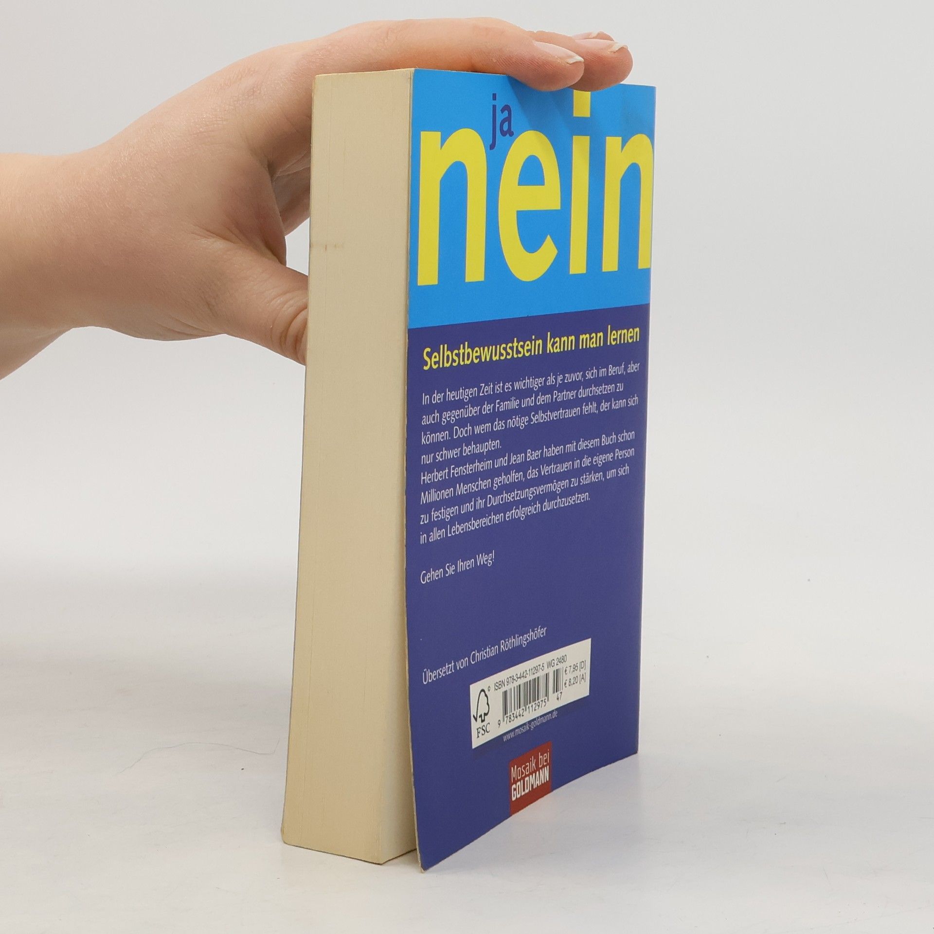 Seit Jahrzenten erfolgreich: das Standardwerk zum Thema Selbstbewusstsein Selbstsicherheit kann man lernen – mit dem Training des amerikanischen Psychotherapeuten Professor Herbert Fensterheim und der Journalistin Jean Baer. Das Programm, mit dem sie schon Millionen Menschen geholfen haben, demonstriert, wie man das Vertrauen in die eigene Person stärkt und sich durchsetzt – im Beruf, in der Liebe, im Familienkreis, in der Gesellschaft.