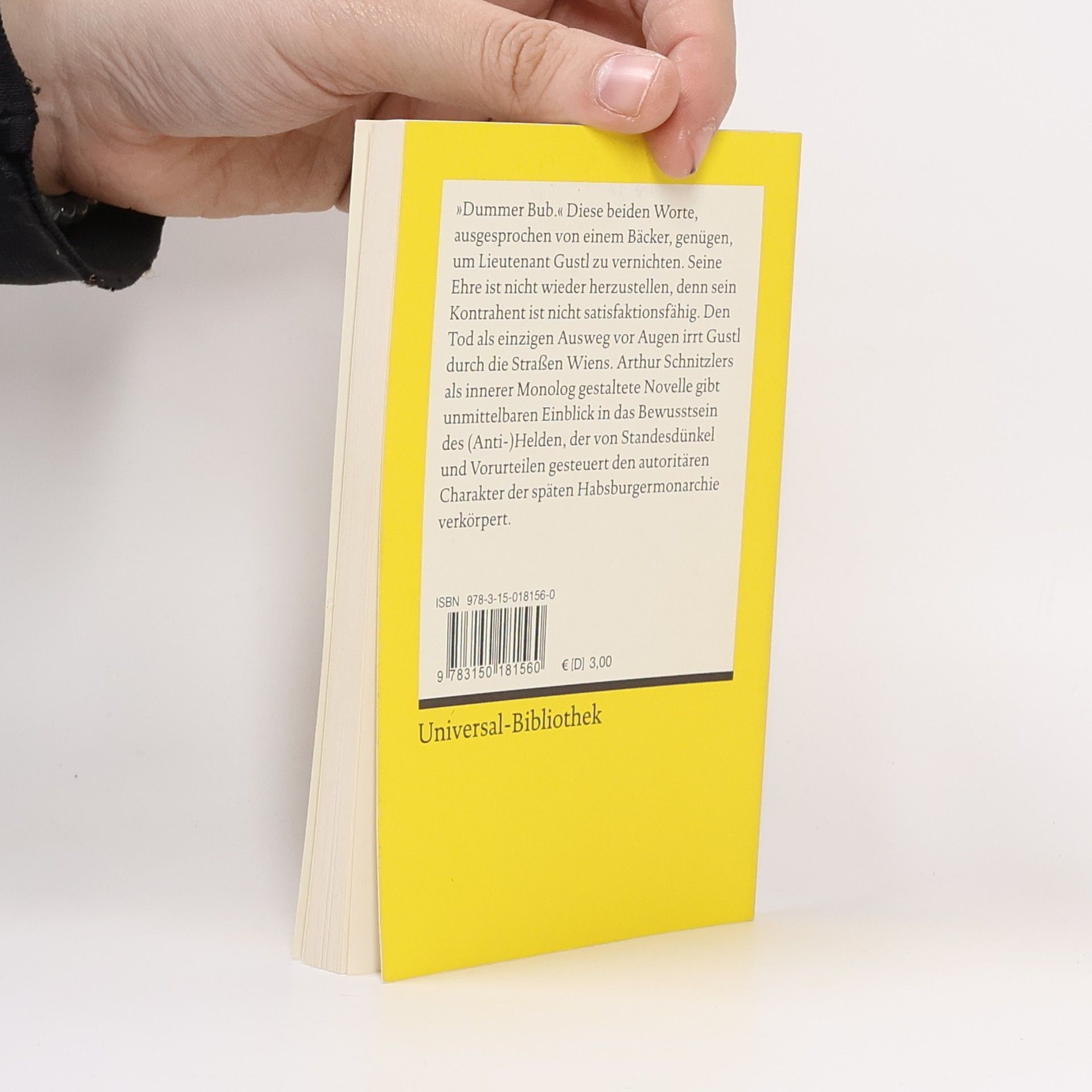»Dummer Bub.« Diese beiden Worte, ausgesprochen von einem Bäcker, genügen, um Lieutenant Gustl zu vernichten. Seine Ehre ist nicht wieder herzustellen, denn sein Kontrahent ist nicht satisfaktionsfähig. Den Tod als einzigen Ausweg vor Augen irrt Gustl durch die Straßen Wiens. Arthur Schnitzlers als innerer Monolog gestaltete Novelle gibt unmittelbaren Einblick in das Bewusstsein des (Anti-)Helden, der von Standesdünkel und Vorurteilen gesteuert den autoritären Charakter der späten Habsburgermonarchie verkörpert.