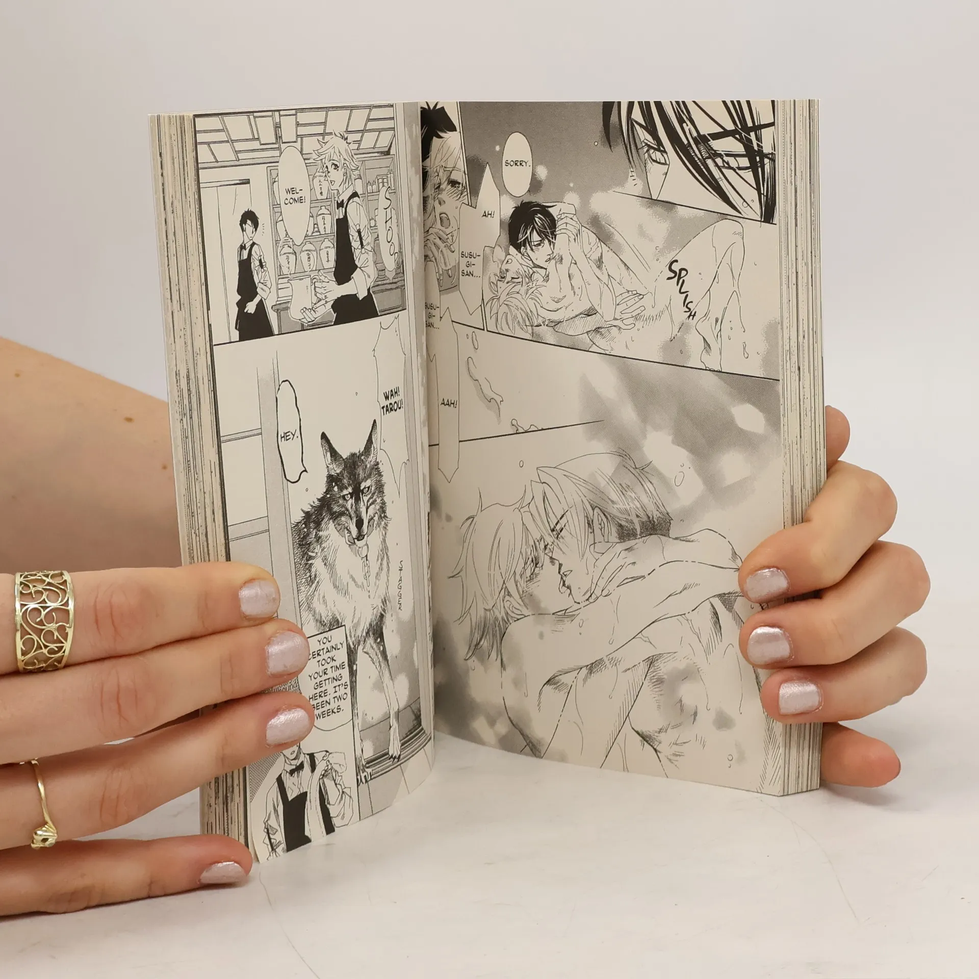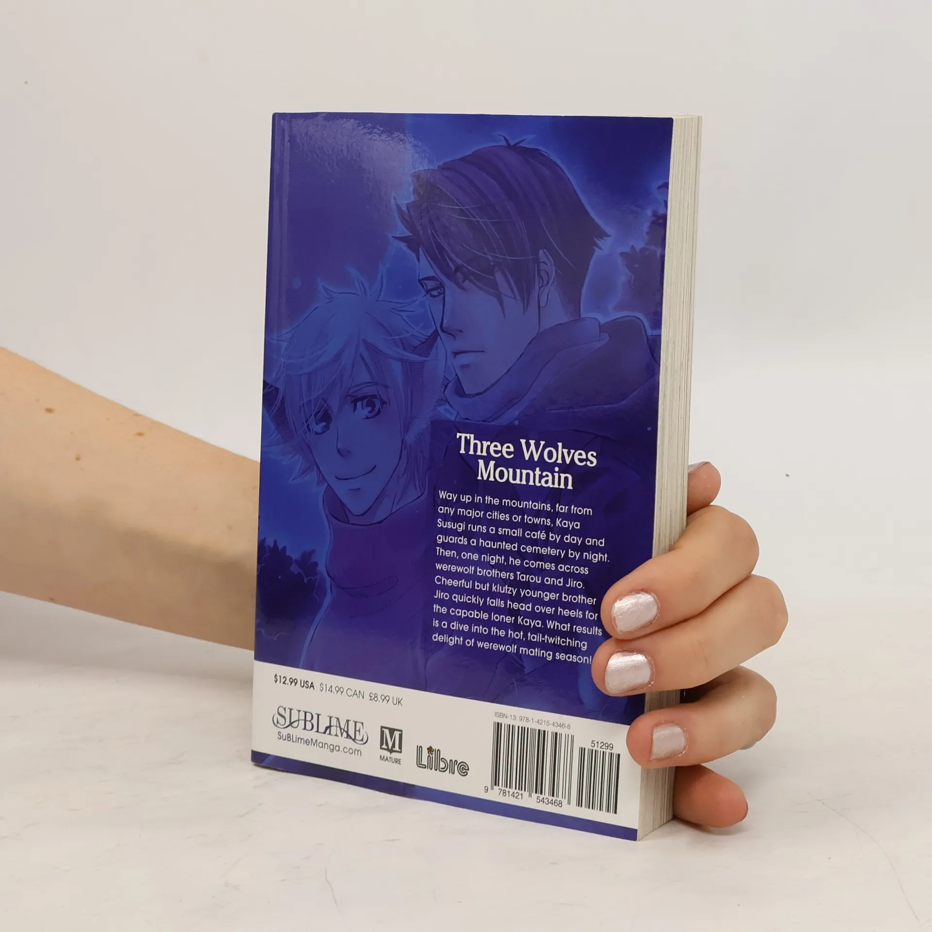 A “tail” of supernatural romance! Way up in the mountains, far from any major cities or towns, Kaya Susugi runs a small cafe by day and guards a haunted cemetery by night. Then, one night, he comes across werewolf brothers Taro and Jiro. Cheerful but klutzy younger brother Jiro quickly falls head over heels for the capable loner Kaya. What results is a dive into the hot, tail-twitching delight of werewolf mating season!