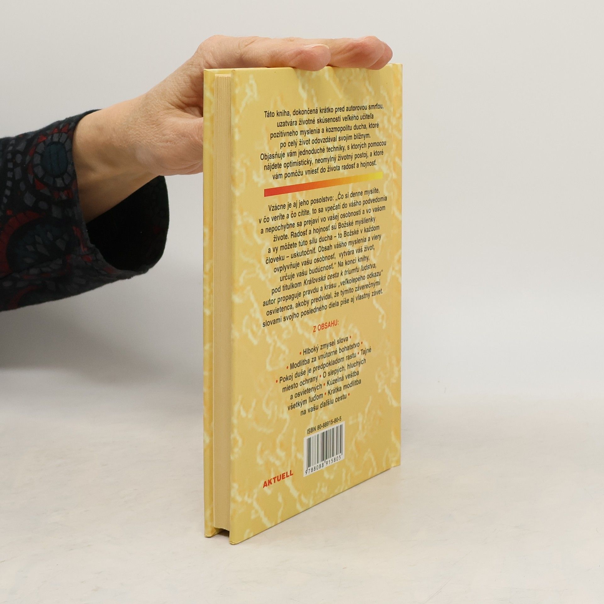 Táto kniha uzatvára životné skúsenosti veľkého učiteľa pozitívneho myslenia a kozmopolitu ducha, ktoré odovzdával svojim blížnym. Objasňuje jednoduché techniky, s ktorými nájdete optimistický a neomylný životný postoj, a ktoré vám pomôžu vniesť do života radosť a hojnosť. Vzácne je aj jeho posolstvo: „Čo si denne myslíte, v čo veríte a čo cítite, to sa vpečatí do vášho podvedomia a nepochybne sa prejaví vo vašej osobnosti a vo vašom živote."