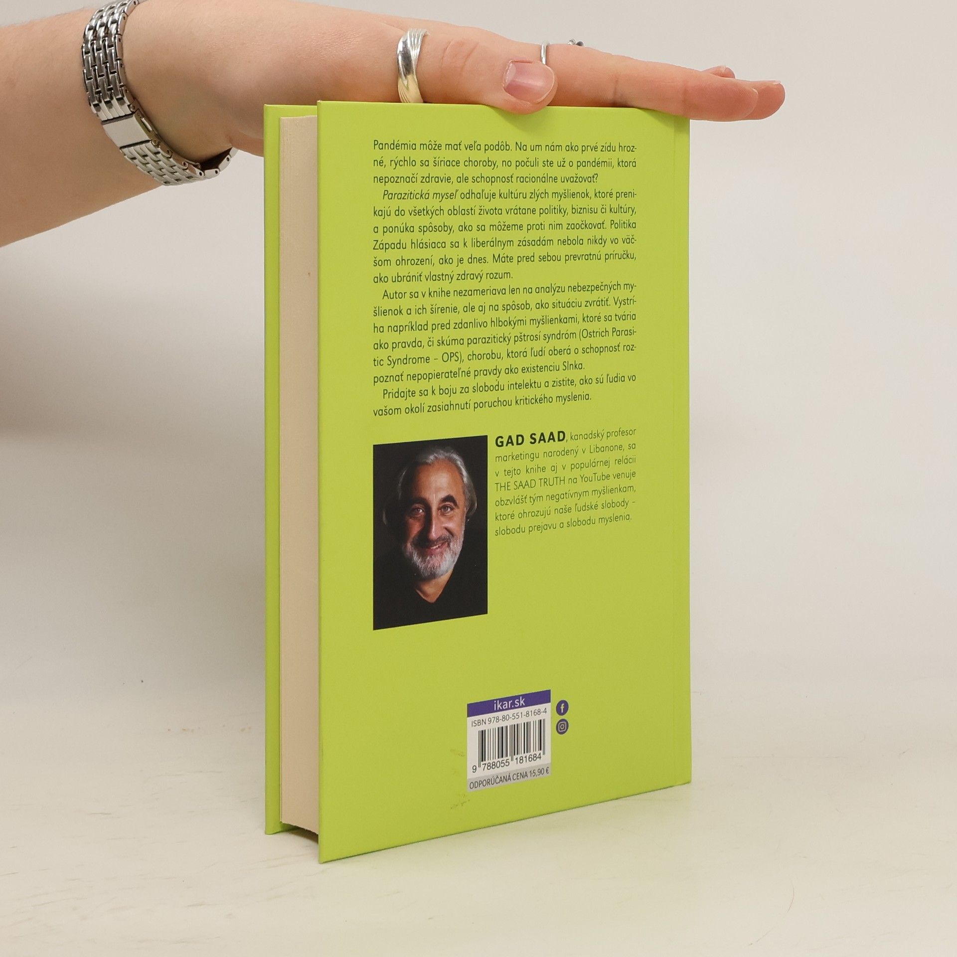 Pandémia môže mať veľa podôb. Na um nám ako prvé zídu hrozné, rýchlo sa šíriace choroby, no počuli ste už o pandémii, ktorá nepoznačí zdravie, ale schopnosť racionálne uvažovať? Kanadský psychológ Gad Saad, v knihe Parazitická myseľ odhaľuje kultúru zlých myšlienok, ktoré prenikajú do všetkých oblastí života vrátane politiky, biznisu či kultúry, a ponúka spôsoby, ako sa môžeme proti nim zaočkovať. V tejto knihe aj v populárnej relácii THE SAAD TRUTH na YouTube sa venuje obzvlášť tým negatívnym myšlienkam, ktoré ohrozujú naše základné ľudské slobody – slobodu prejavu a slobodu myslenia. Politika Západu hlásiaca sa k týmto liberálnym zásadám nebola nikdy vo väčšom ohrození, ako je dnes. Máte pred sebou prevratnú príručku, ako ubrániť vlastný zdravý rozum. Autor sa v knihe nezameriava len na analýzu nebezpečných myšlienok a ich šírenie, ale aj na spôsob, ako situáciu zvrátiť. Vystríha napríklad pred zdanlivo hlbokými myšlienkami, ktoré sa tvária ako pravda, či skúma parazitický pštrosí syndróm (Ostrich Parasitic Syndrome – OPS), chorobu, ktorá ľudí oberá o schopnosť rozpoznať nepopierateľné pravdy ako existenciu Slnka. Pridajte sa k boju za slobodu intelektu a zistite, ako sú ľudia vo vašom okolí zasiahnutí poruchou kritického myslenia.