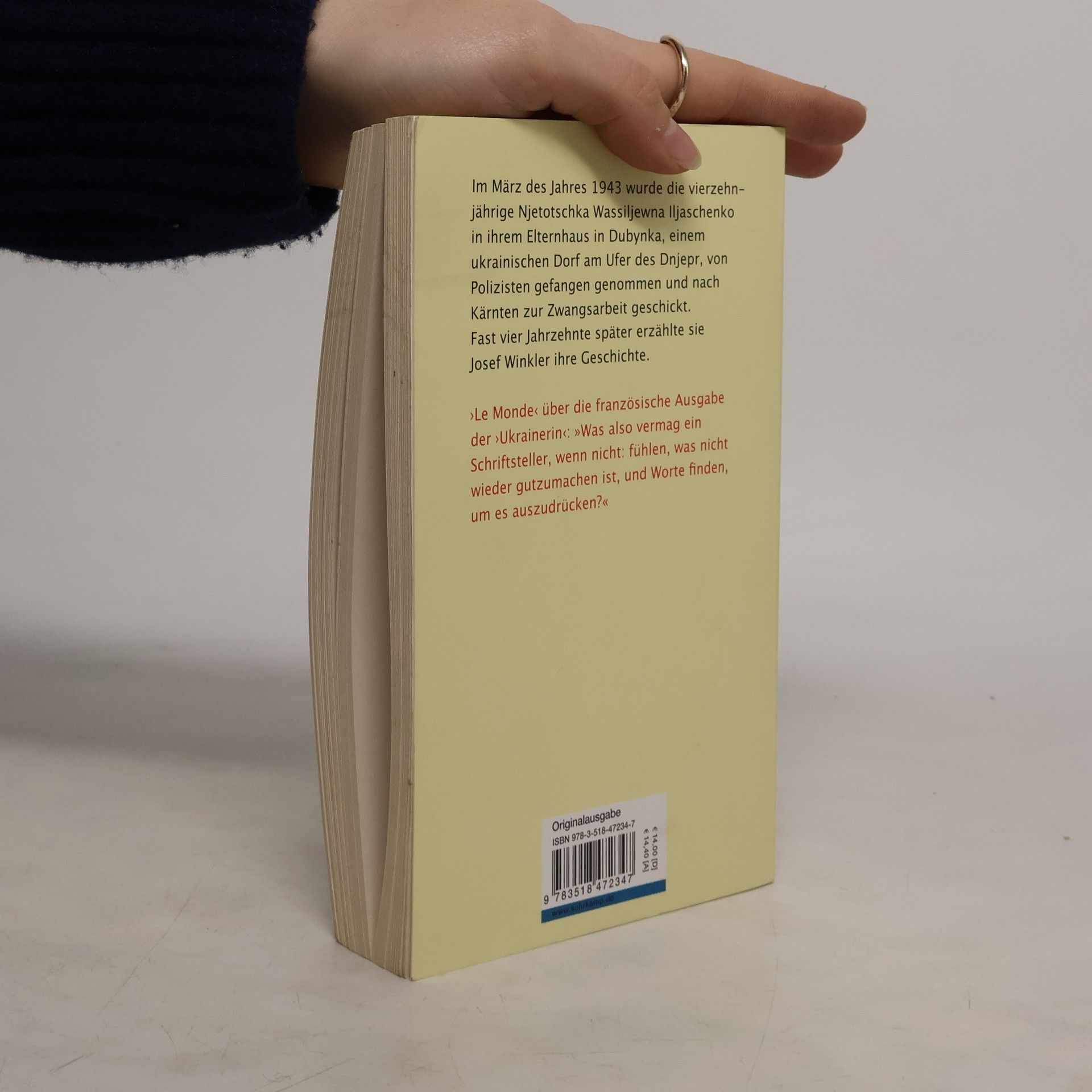 Nach einem längeren Aufenthalt in Wien zog sich Josef Winkler im Jahre 1981 auf einen Bauernhof in Kärnten zurück, um seinen Roman Muttersprache zu beenden. Dort fand er Quartier bei der Familie der Bergbäuerin Njetotschka Wassiljewna Iljaschenko, einer im März 1943 von Hitlers Schergen verschleppten Ukrainerin ‒ die ihm über ein Jahr lang ihre Lebensgeschichte erzählte. Die Bäuerin berichtet dem Autor vom Leben ihrer verzweifelt um die Existenz der Familie ringenden Mutter am Ufer des Dnjepr und von ihrer eigenen Kindheit während der Zeit der Kollektivierung und Hungersnot (Holodomor) im Dorf Dobenka, das später vom Stausee von Krementschug überflutet wurde. Sie erzählt von ihrer gewaltsamen Verschleppung aus der Ukraine zur Zwangsarbeit nach Kärnten, und sie berichtet von ihrem ersten Jahr auf dem Kärntner Bergbauernhof. Der Band erscheint mit einem Nachwort von Josef Winklers französischem Übersetzer Bernard Banoun sowie erstmals mit Briefen, die Hapka Davidowna Iljaschenko aus der Ukraine an ihre Tochter Njetotschka in Kärnten schrieb.