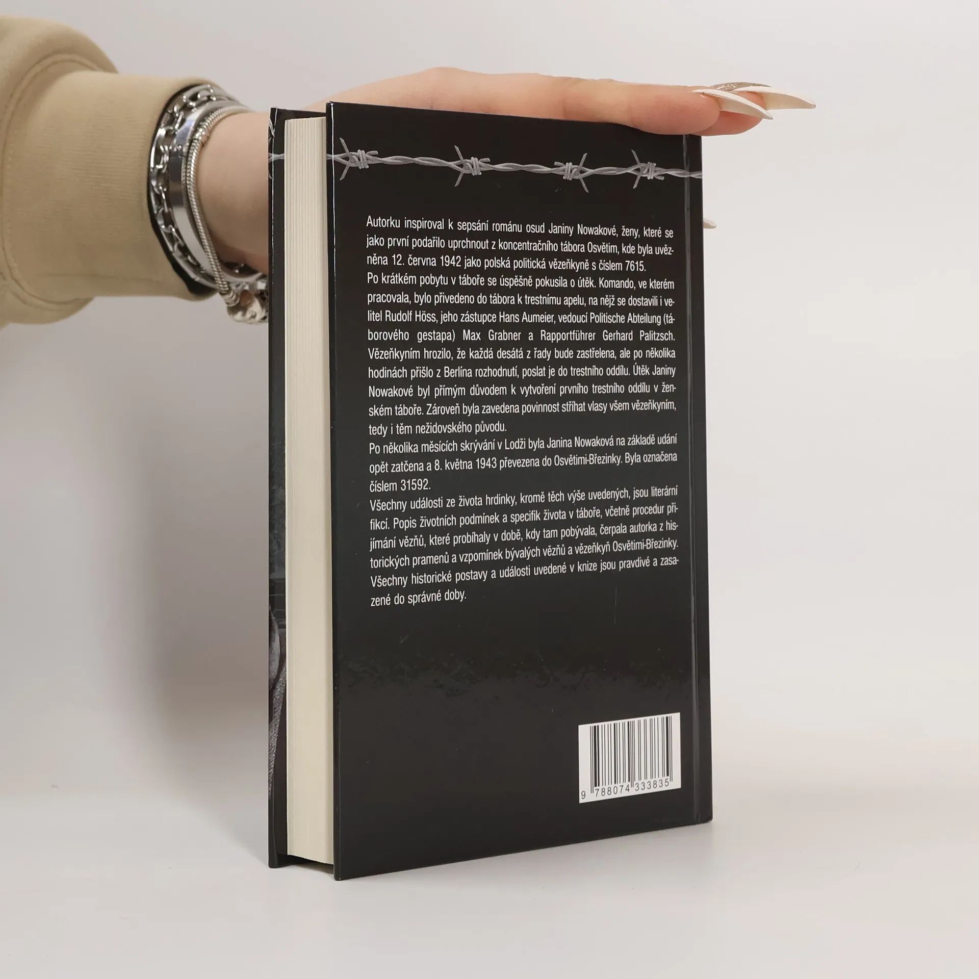 Román je volně inspirován osudem polské ženy, které se historicky jako první podařil útěk z koncentračního tábora Osvětim. Autorku inspiroval k sepsání románu osud Janiny Nowakové, ženy, které se jako první podařilo uprchnout z koncentračního tábora Osvětim, kde byla uvězněna 12. června 1942 jako polská politická vězeňkyně s číslem 7615. Po krátkém pobytu v táboře se úspěšně pokusila o útěk. Útěk Janiny Nowakové byl přímým důvodem k vytvoření prvního trestního oddílu v ženském táboře. Zároveň byla zavedena povinnost stříhat vlasy všem vězeňkyním, tedy i těm nežidovského původu. Po několika měsících skrývání v Lodži byla Janina Nowaková na základě udání opět zatčena a 8. května 1943 převezena do Osvětimi-Březinky. Nakladatelská anotace. Kráceno.