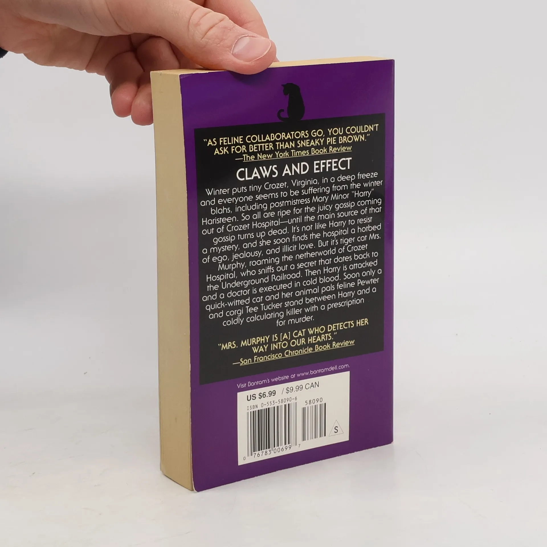 CLAWS AND EFFECTWinter puts tiny Crozet, Virginia, in a deep freeze and everyone seems to be suffering from the winter blahs, including postmistress Mary Minor “Harry” Haristeen. So all are ripe for the juicy gossip coming out of Crozet Hospital–until the main source of that gossip turns up dead. It’s not like Harry to resist a mystery, and she soon finds the hospital a hotbed of ego, jealousy, and illicit love.But it’s tiger cat Mrs. Murphy, roaming the netherworld of Crozet Hospital, who sniffs out a secret that dates back to the Underground Railroad. Then Harry is attacked and a doctor is executed in cold blood. Soon only a quick-witted cat and her animal pals feline Pewter and corgi Tee Tucker stand between Harry and a coldly calculating killer with a prescription for murder.
