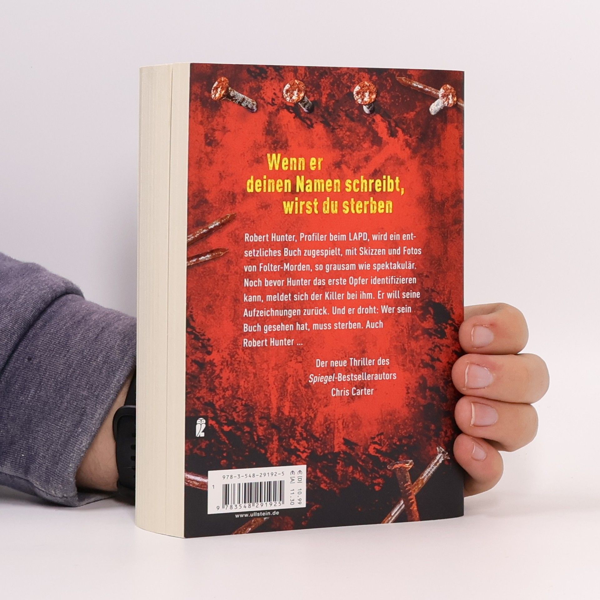 Der neue Thriller von Nr.-1-Bestsellerautor Chris Carter Taschendiebin Angela Wood hatte einen guten Tag. Sie gönnt sich einen Cocktail, als ihr in der Bar ein Gast auffällt, der sich rüpelhaft benimmt. Um ihm eine Lektion zu erteilen, stiehlt sie seine teure Ledertasche. Ein schwerer Fehler, die Tasche enthält nichts Wertvolles, nur ein kleines Notizbuch. Ein Albtraum beginnt. Das Buch enthält Skizzen und Fotos von 16 Folter-Morden. 16 Polaroids der Opfer, 16 DNA-Analysen. In Panik schickt Angela das Buch an das LAPD, wo Robert Hunter und Carlos Garcia sofort erkennen, dass der sadistische Täter ein Experte sein muss. Das ist ihr einziger Hinweis. Eine blinde Jagd beginnt, bis der Killer Hunter ein Ultimatum stellt. Der 11. Fall Robert Hunter und seinem Partner Garcia.