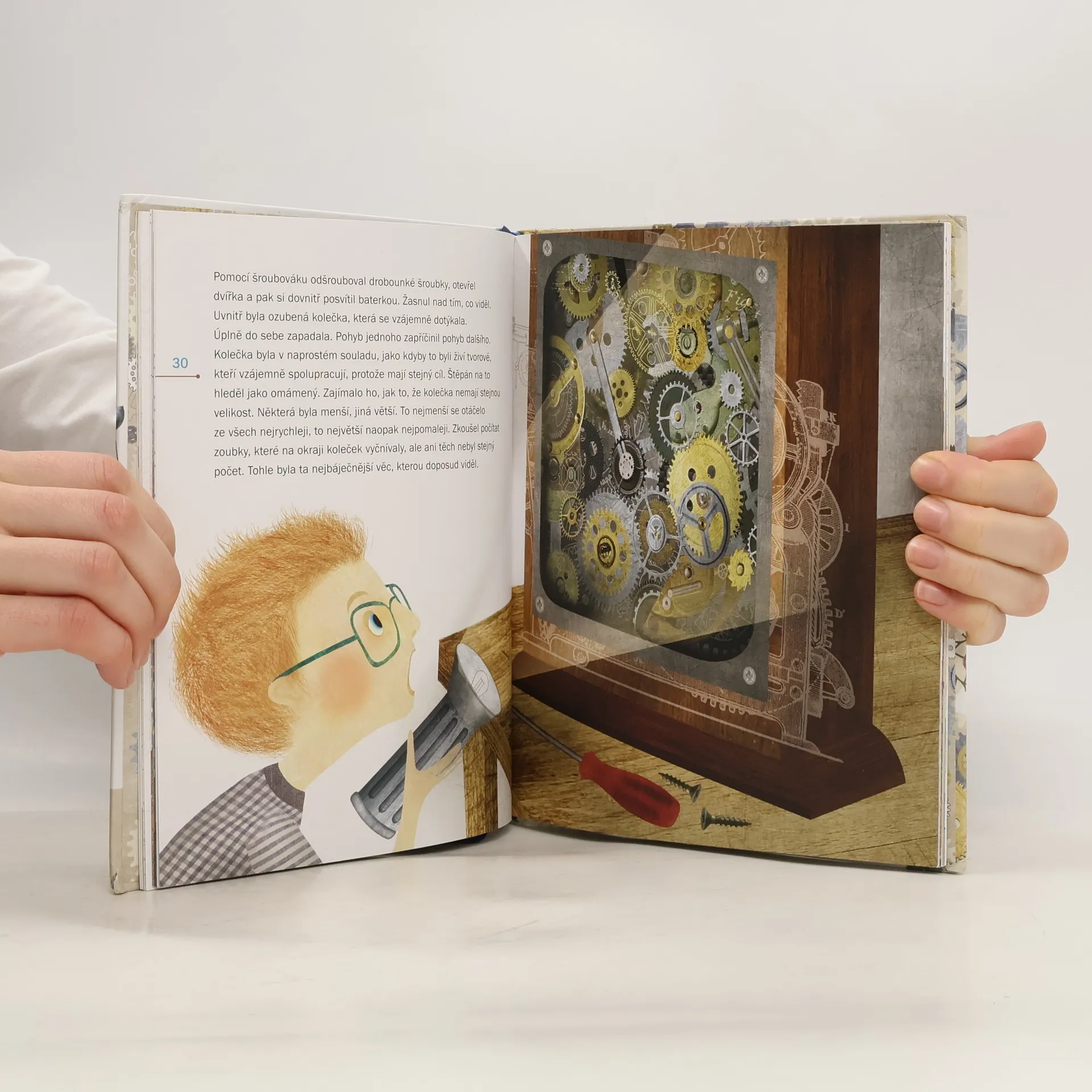 Štěpán je neobyčejně zvídavý kluk. Všechno ho zajímá, všemu chce přijít na kloub. Jakmile je v jeho dosahu nějaký přístroj, hned zkoumá, jak funguje a jak by se ho dalo využít. Na otázku, čím by chtěl být, bez váhání odpoví: „Budu vynálezcem!“ Co se stane, když se takový kluk ocitne sám v noci s velkými starožitnými hodinami? Jak fungují? A jaké tajemství se skrývá u prarodičů na půdě? Vezměte si šroubovák, hodinářské kukátko a probuďte ve svých dětech vynálezce. Kniha je určena pro předškolní děti nebo pro čerstvé školáky, kteří mají rádi stroje a přístroje a rádi si čtou s rodiči. Mimo jiné příběh o Štěpánovi dětem nenásilně a hravou formou osvětluje základní terminologii spojenou s určováním času (malá a velká ručička a jaký časový úsek ukazuje, celá hodina, časové úseky ciferníku atd.).