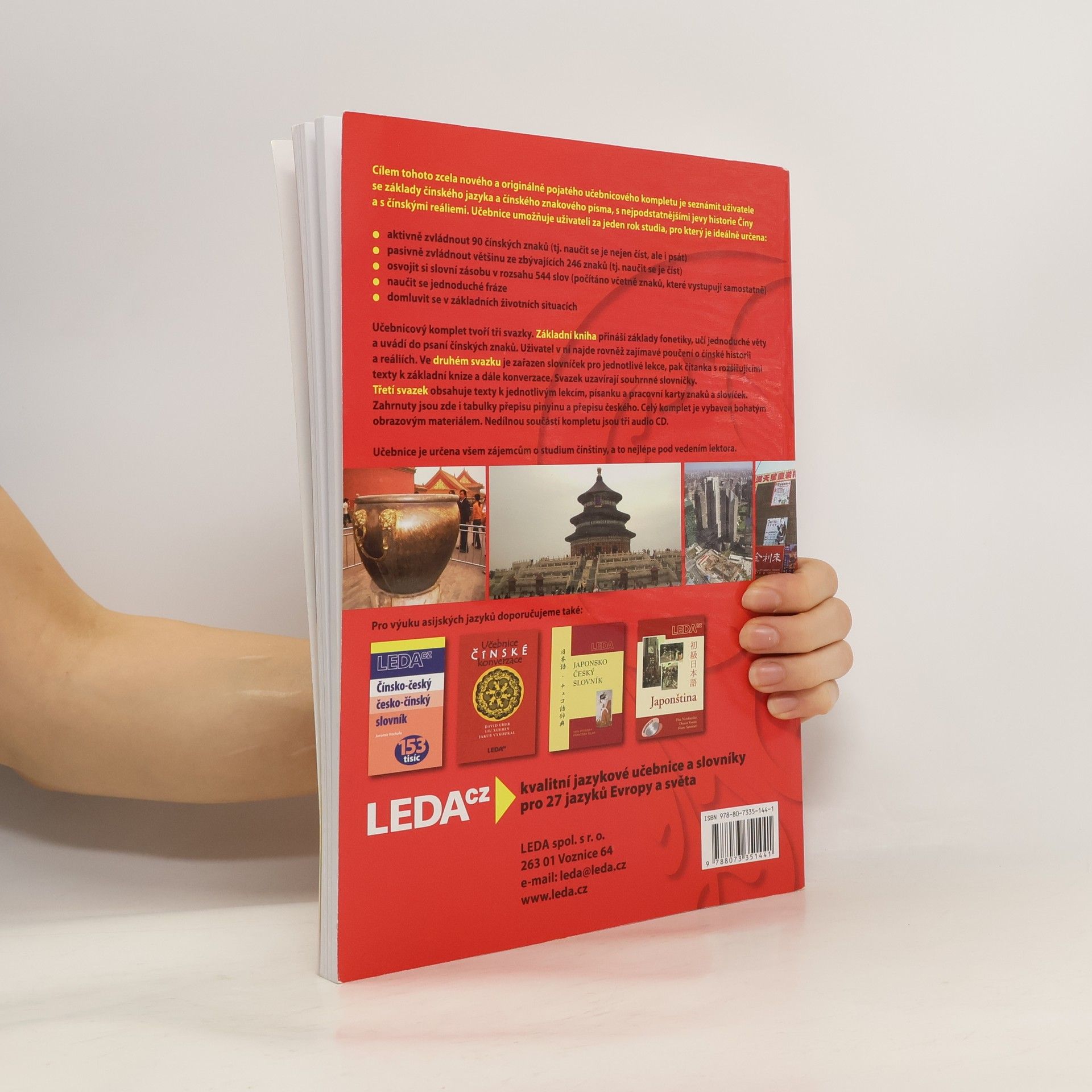 Tato nová učebnice čínštiny má seznámit uživatele se základy čínského jazyka a čínského znakového písma, s nejpodstatnějšími jevy historie Číny a s čínskými reáliemi. Umožňuje uživateli zvládnout aktivně 90 čínských znaků, pasivně zbývajících 246 znaků, osvojit si 544 slov,naučit se jednoduché fráze a domluvit se v základních životních situacích. Komplet obsahuje tři svazky. Základní kniha přináší základy fonetiky, učí jednoduché věty a uvádí do psaní čínských znaků. Ve druhém svazku je zařazen slovníček pro jednotlivé lekce, čítanka s rozšiřujícími texty k základní knize, konverzace a souhrnné slovníčky. Učebnice je určena všem zájemcům o studium čínštiny, a to nejlépe pod vedením lektora.