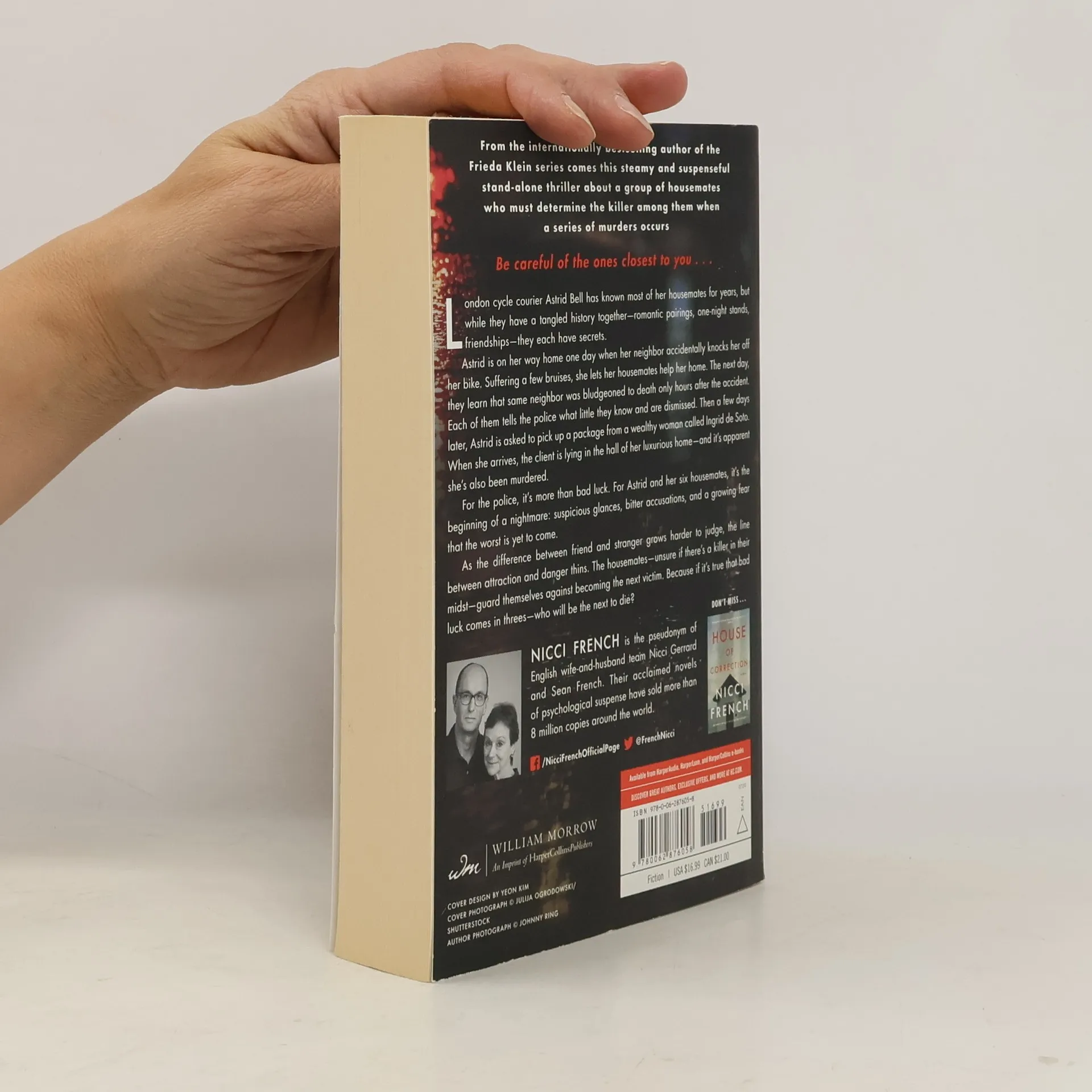 London cycle courier Astrid Bell has known most of her housemates for years, but while they have a tangled history together--romantic pairings, one-night stands, friendships--they each have secrets. Astrid is on her way home one day when her neighbor accidentally knocks her off her bike. Suffering a few bruises, her roommates help her home. The next day, they learn that same neighbor was bludgeoned to death only hours after the accident. Each of them tells the police what little they know and are dismissed. Then a few days later, Astrid is asked to pick up a package from a wealthy woman called Ingrid de Soto. When she arrives, the client is lying in the hall of her luxurious home--and it's apparent she's also been murdered. For the police, it's more than bad luck. For Astrid and her six housemates, it's the beginning of a nightmare: suspicious glances, bitter accusations, and a growing fear that the worst is yet to come. As the difference between friend and stranger grows harder to judge, the line between attraction and danger thins. The housemates--unsure if there's a killer in their midst--guard themselves against becoming the next victim. Because if it's true that bad luck comes in threes--who will be the next to die?