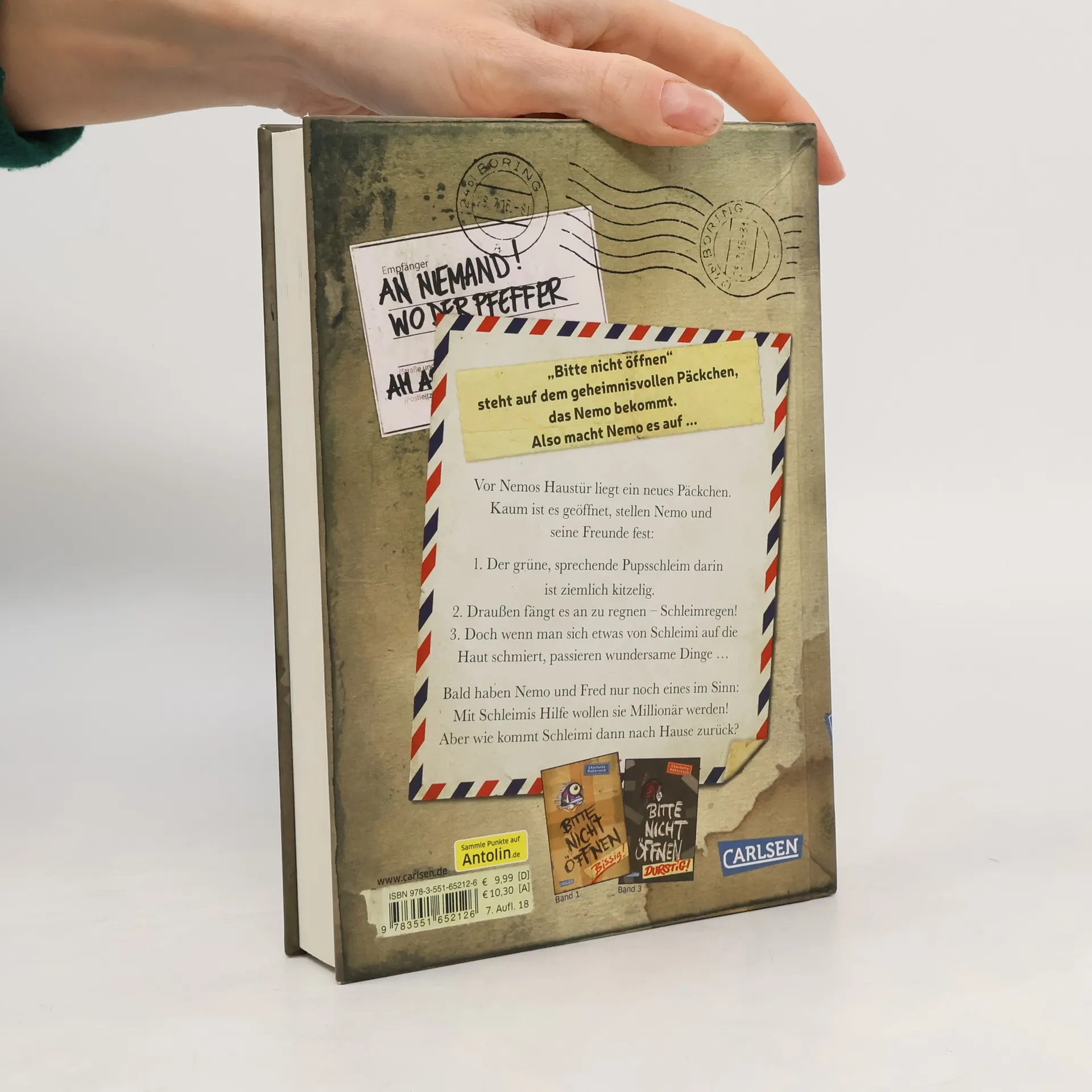 \"Bitte nicht öffnen!\" steht auf dem geheimnisvollen Päckchen, das Nemo bekommt. Also macht Nemo es auf ... BAND 2: Vor Nemos Haustür liegt ein neues Päckchen. Kaum ist es geöffnet, stellen Nemo und seine Freunde fest: 1. Der grüne, sprechende Pupsschleim darin ist ziemlich kitzelig. 2. Draußen fängt es an zu regnen – Schleimregen! 3. Doch wenn man sich etwas von Schleimi auf die Haut schmiert, passieren wundersame Dinge … Bald haben Nemo und Fred nur noch eines im Sinn: Mit Schleimis Hilfe wollen sie Millionär werden! Aber wie kommt Schleimi dann zurück nach Hause? Nach dem Kinderbuch-Bestseller-Erfolg von Band 1 nun endlich da: ein neues lustiges und turbulentes Abenteuer rund um Schule, Freundschaft und ein verlorenes Wesen, das nach Hause will! Voller überraschender Wendungen, Sprachwitz und mit vielen Bildern vom unverwechselbaren Fréderic Bertrand. Das perfekte Buch für Jungs und Mädchen - und ihre Eltern!