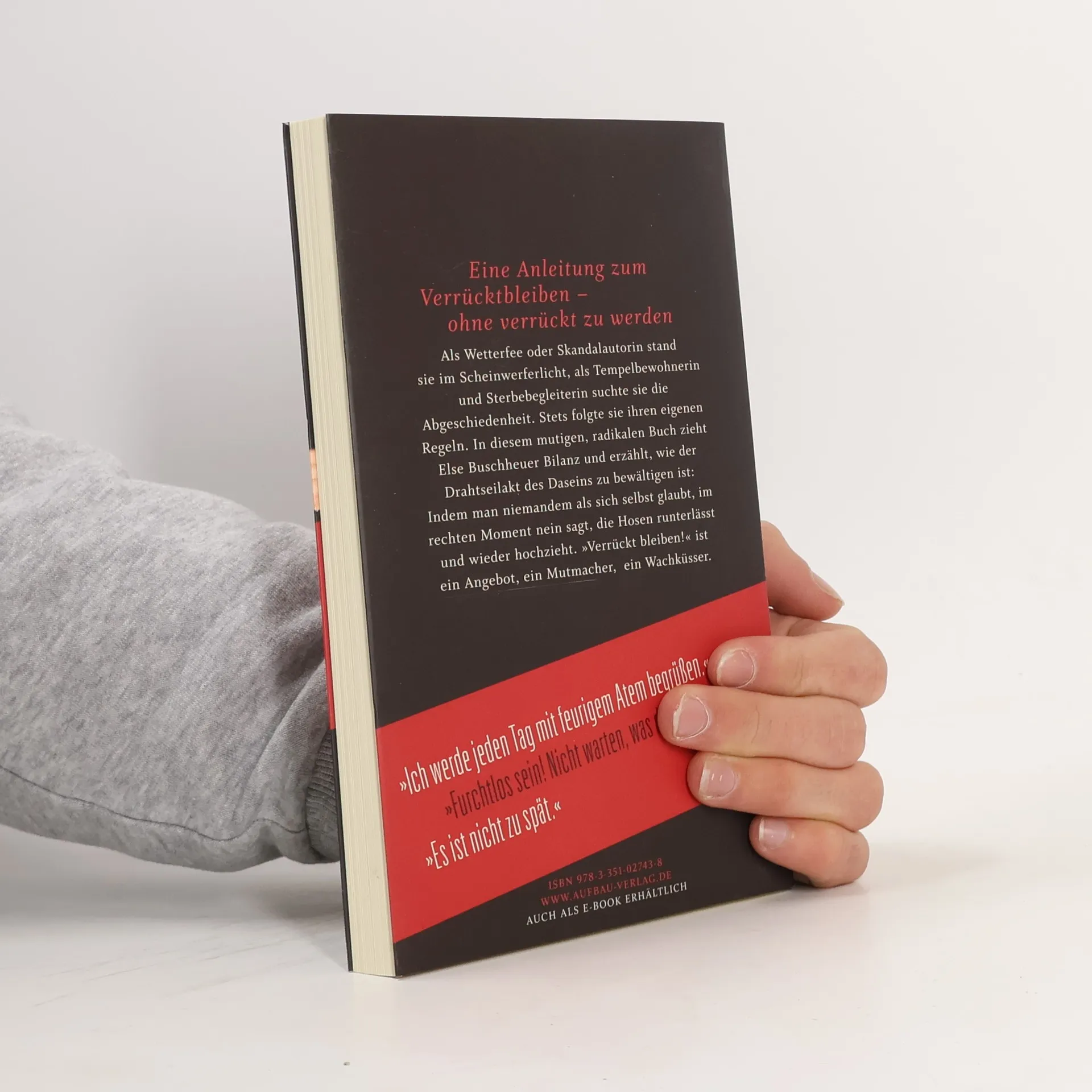 'Verrückt bleiben!' ist ein autobiographischer Ratgeber, ein sehr persönliches Buch, das den Leser an Else Buschheuers Schicksal teilhaben lässt. Naseweis und weise erklärt sie uns, wie der Drahtseilakt Leben zu bewältigen sei: Indem man selber denkt, sich von seinen Besitztümern befreit, hinfällt, wieder aufsteht, niemandem als sich selbst glaubt, im rechten Moment nein sagt, die Hosen runterlässt und wieder hochzieht. Ihr Buch ist ein Pamphlet wider die Lebensplanung, eine Ode an die Unzulänglichkeit, ein Mutmacher, ein Wachküsser, eine Anleitung zum Verrücktbleiben - ohne verrückt zu werden.