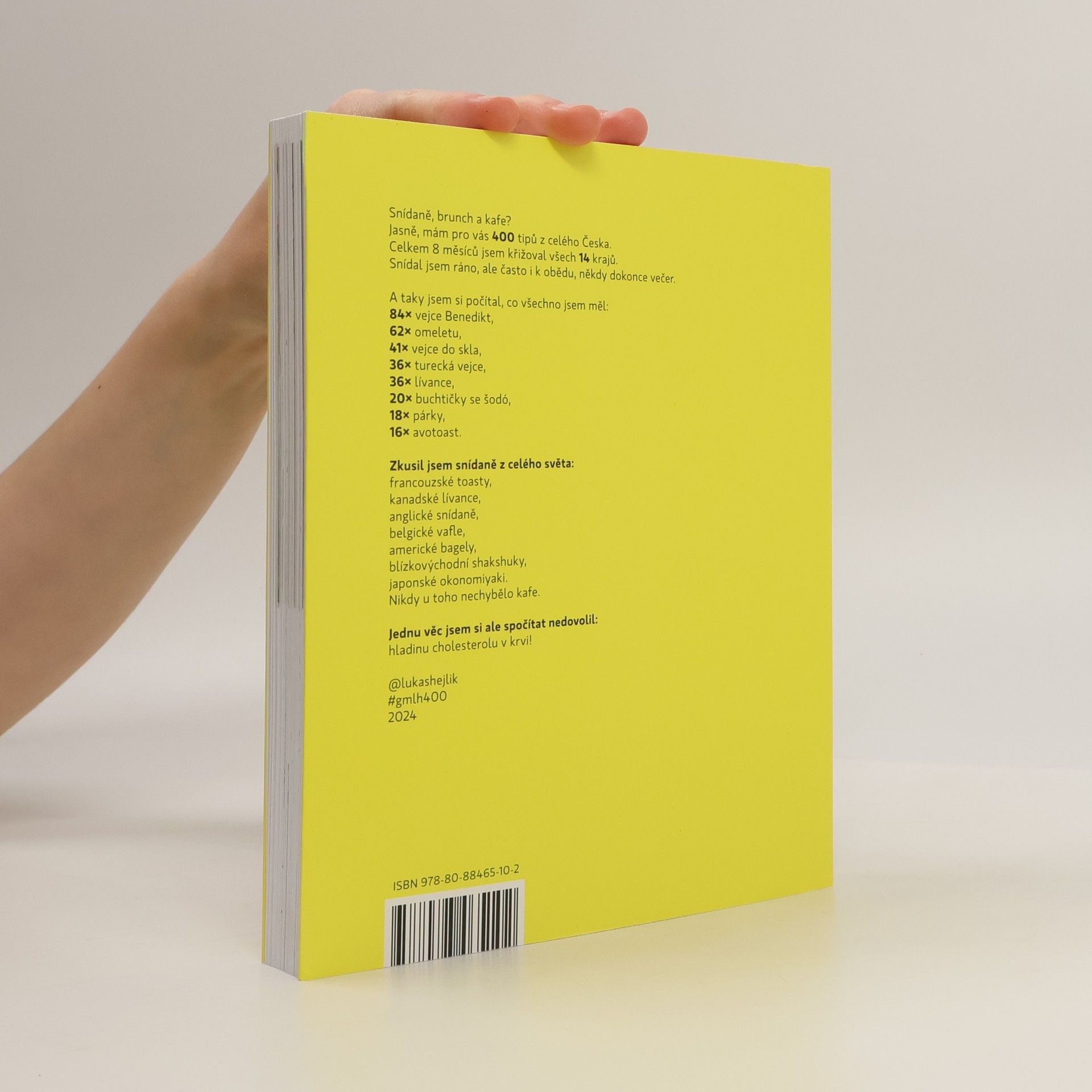 Čtvrtá knížka Gastromapy je žloutkově žlutá! Lukáš Hejlík přináší 400 tipů ze všech regionů Česka. Na svých cestách si počítal, co kde snídal. Vejce Benedikt měl v 84 podnicích, zkusil 62 omelet, 41krát to byla vejce do skla. Máloco mělo poslední dobou takový nástup jako turecká vejce, ta otestoval na 36 místech. Tolikrát si dal mimochodem i lívance. Celkem 20krát to byly buchtičky s krémem, 18krát párky a 16krát avotoast. Často to byly jen obložené chleby, sendviče nebo toasty. Procestoval v Česku celý svět a zkusil anglické snídaně, francouzské toasty, kanadské lívance, belgické vafle, bagely z Ameriky, shakshuku z Blízkého východu nebo japonské okonomiyaki. Nezapomínal ani na fanoušky sladké snídaně, jedl palačinky, žemlovky, kaše ovesné, rýžové i krupicové. Pokaždé u toho bylo kafe. Také přesně ví, kolik za všechny ty snídaně a brunche utratil. Ale jednu věc si spočítat nenechal - hladinu cholesterolu v krvi.