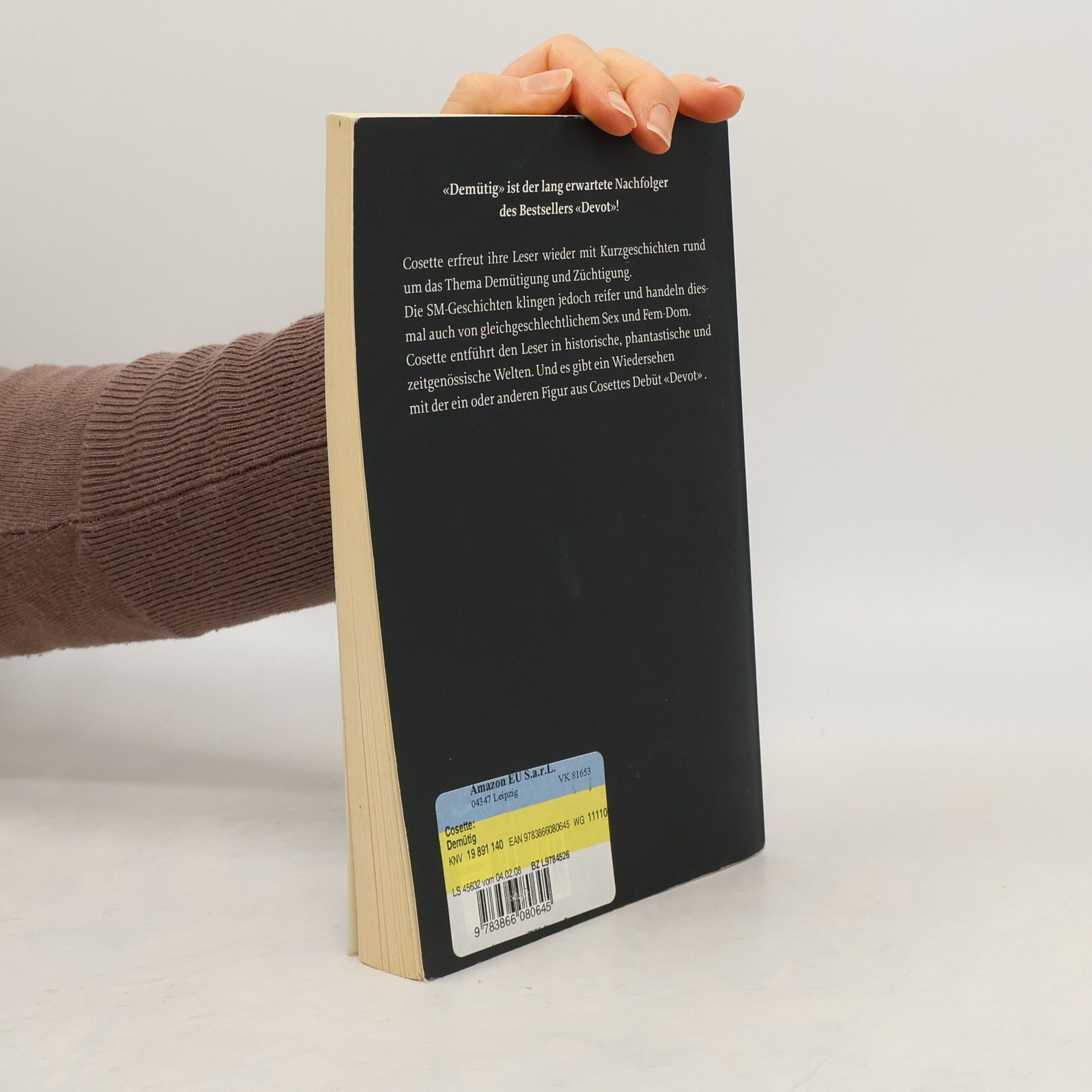 Cosette erfreut die Leser wieder mit Kurzgeschichten rund um das Thema Erniedrigung, Demütigung und Züchtigung. Ihre SM-Geschichten klingen reifer, die Szenarien heißer und der Genuß ist für Autorin und Leser gleichermaßen Maxime. Auch in diesem Kurzgeschichtenband entführt Cosette den Leser in historische, phantastische und zeitgenössische Welten. Und alle, die sich bei 'Devot' fragten, was aus Topaz L‘Esclave wurde, finden in Cosettes neuestem Werk die lang ersehnte Antwort! Insgesamt sieben Geschichten beweisen eindrücklich, dass Cosette zu den besten zeitgenössischen SM-Autorinnen gehört. Kaum eine versteht es so geschickt wie sie, einen spannenden Plot und abgründige Fantasien zu einer in höchstem Maße erregenden Geschichte zu verquicken. 'Demütig' ist der lang erwartete Nachfolger des Bestsellers 'Devot', der es 2006 in die Top 30 der meist verkauften Erotikbücher bei Amazon geschafft hat.