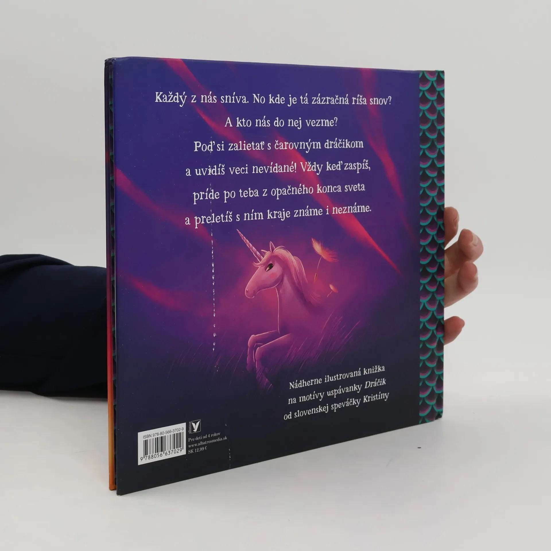 Každý z nás sníva. No kde je tá zázračná ríša snov? A kto nás do nej vezme? Poď si zalietať s čarovným dráčikom a uvidíš veci nevídané! Vždy keď zaspíš, príde po teba z opačného konca sveta a preletíš s ním kraje známe i neznáme. Nádherne ilustrovaná knižka na motívy uspávanky Dráčik od slovenskej speváčky Kristíny.