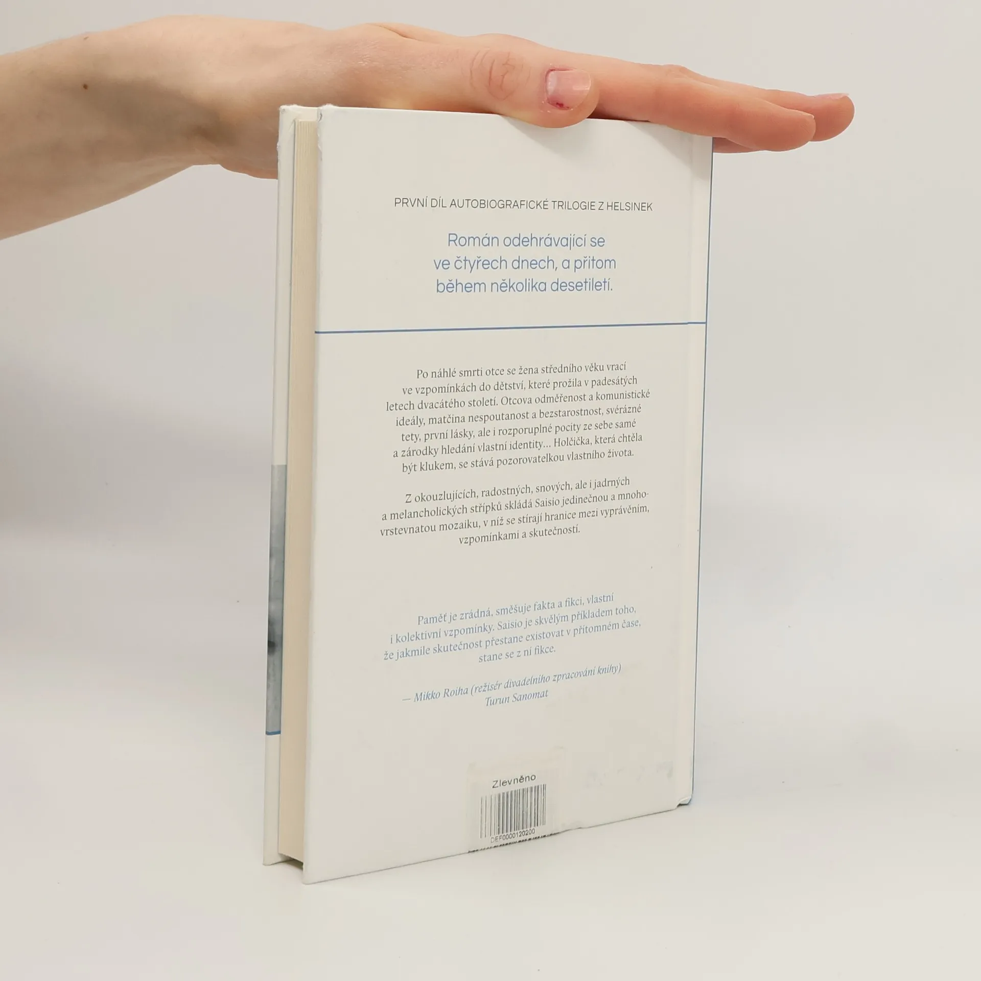 První díl autobiografické trilogie z Helsinek. Román odehrávající se ve čtyřech dnech, a přitom během několika desetiletí. Po náhlé smrti otce se žena středního věku vrací ve vzpomínkách do dětství, které prožila ve čtyřicátých a padesátých letech dvacátého století. Otcova odměřenost a komunistické ideály, matčina nespoutanost a bezstarostnost, svérázné tety, první lásky, ale i rozporuplné pocity ze sebe samé a zárodky hledání vlastní identity. Holčička, která chtěla být klukem, se stává pozorovatelkou vlastního života. Z okouzlujících, radostných, snových, ale i jadrných a melancholických střípků skládá Saisio jedinečnou a mnohovrstevnatou mozaiku, v níž se stírají hranice mezi vyprávěním, vzpomínkami a skutečností.