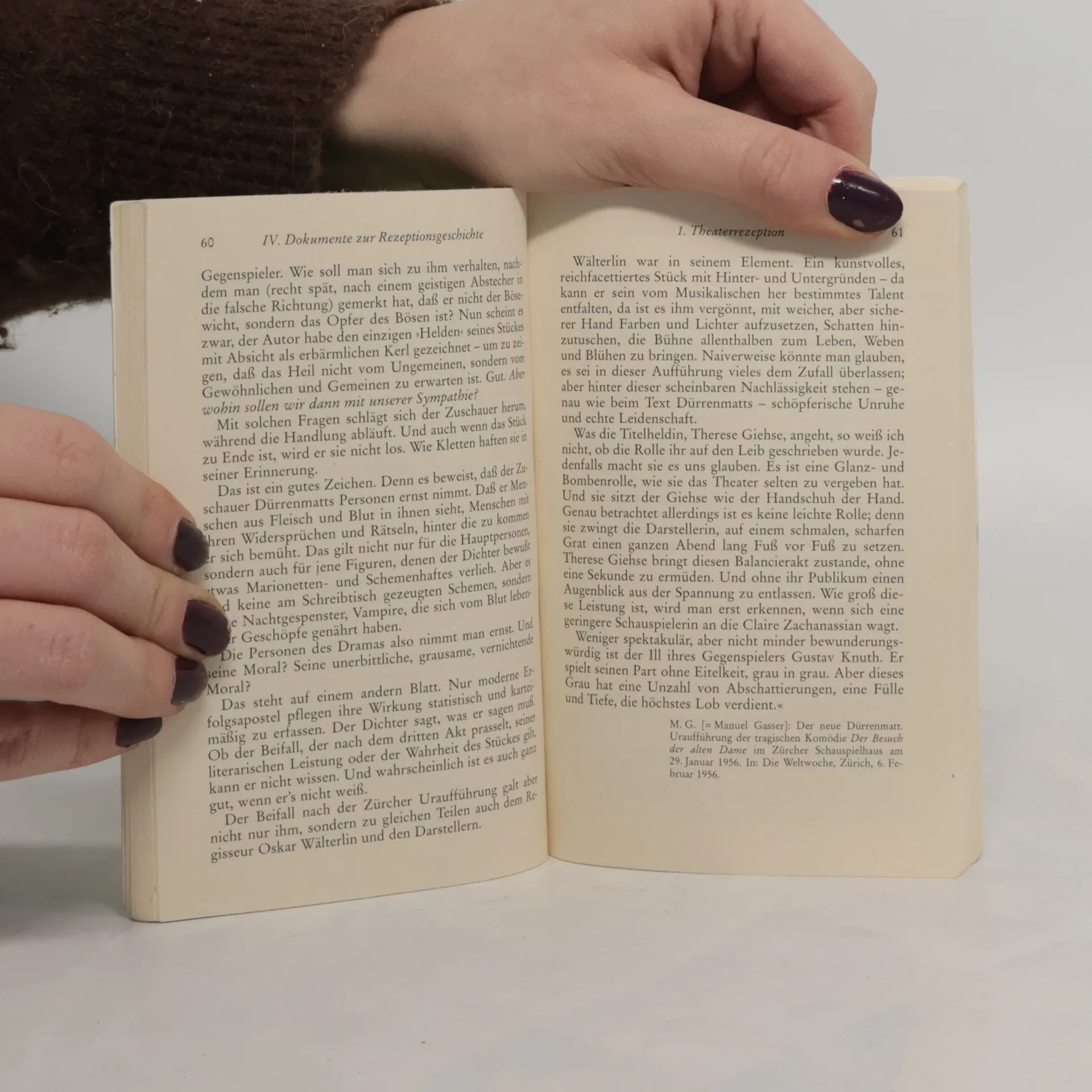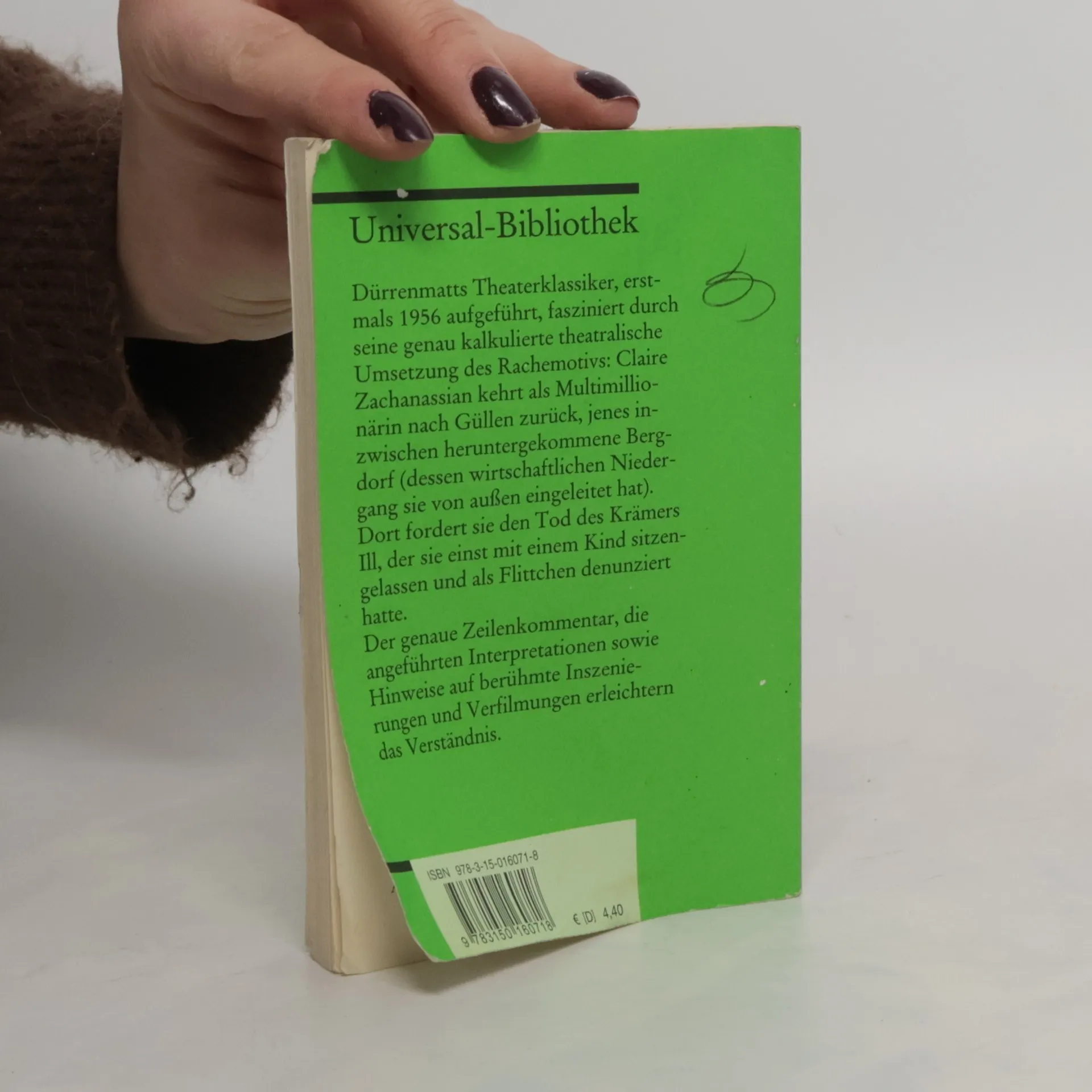 Dürrenmatts Theaterklassiker, erstmals 1956 aufgeführt, fasziniert durch seine genau kalkulierte theatralische Umsetzung des Rachemotivs: Claire Zachanassian kehrt als Multimillionärin und alte Frau nach Güllen zurück, jenes inzwischen heruntergekommene Bergdorf (dessen wirtschaftlichen Niedergang sie von außen eingeleitet hat). Dort fordert sie den Tod des Krämers Ill, der sie einst mit einem Kind sitzen gelassen und sie als Flittchen denunziert hatte. Der genaue Zeilenkommentar, die angeführten Interpretationen sowie z. B. die Hinweise auf die zahlreichen, berühmten Verfilmungen erleichtern dem Leser das Verständnis dieses wichtigen Stückes.