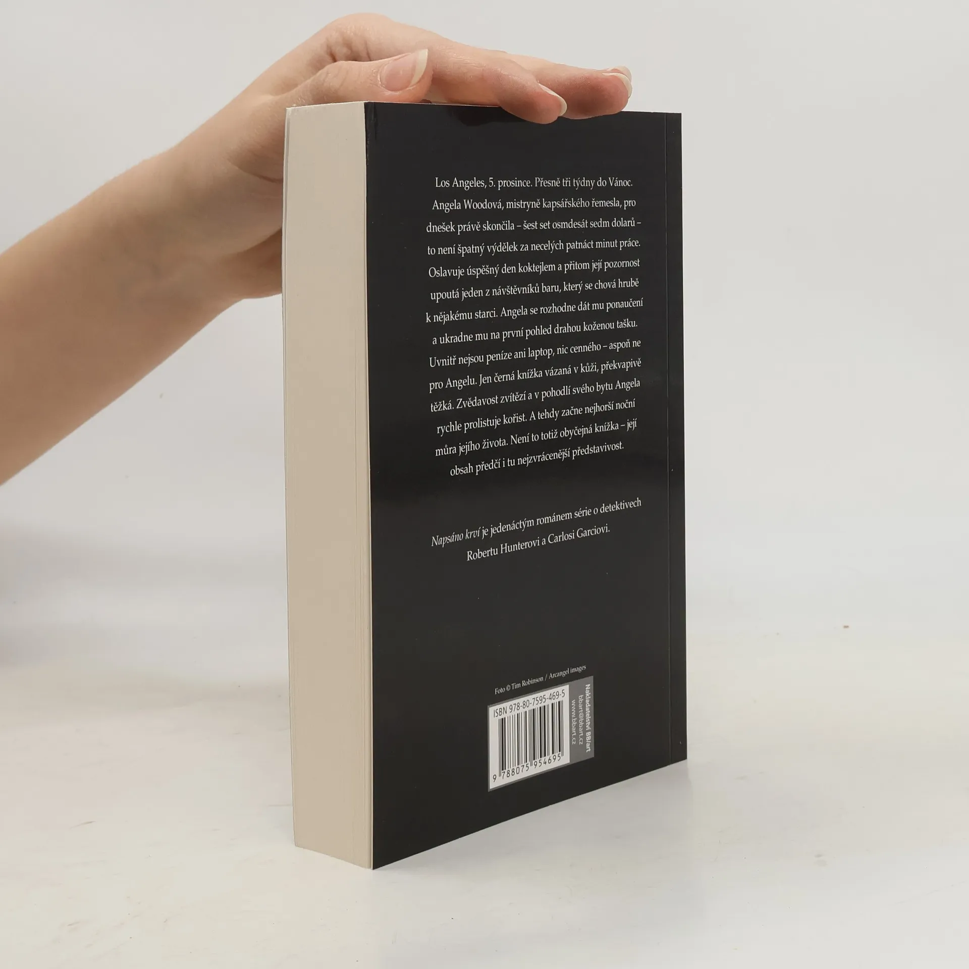 Když si napíše vaše jméno, je to rozsudek smrti… Los Angeles, 5. prosince. Přesně tři týdny do Vánoc. Angela Woodová, mistryně kapsářského řemesla, pro dnešek právě skončila – šest set osmdesát sedm dolarů – to není špatný výdělek za necelých patnáct minut práce. Oslavuje úspěšný den koktejlem a přitom její pozornost upoutá jeden z návštěvníků baru, který se chová hrubě k nějakému starci. Angela se rozhodne dát mu ponaučení a ukradne mu na první pohled drahou koženou tašku. Uvnitř nejsou peníze ani laptop, nic cenného – aspoň ne pro Angelu. Jen černá knížka vázaná v kůži, překvapivě těžká. Zvědavost zvítězí a v pohodlí svého bytu Angela rychle prolistuje kořist. A tehdy začne nejhorší noční můra jejího života. Není to totiž obyčejná knížka – její obsah předčí i tu nejzvrácenější představivost. Napsáno krví je jedenáctým románem série o detektivech Robertovi Hunterovi a Carlosi Garciovi.