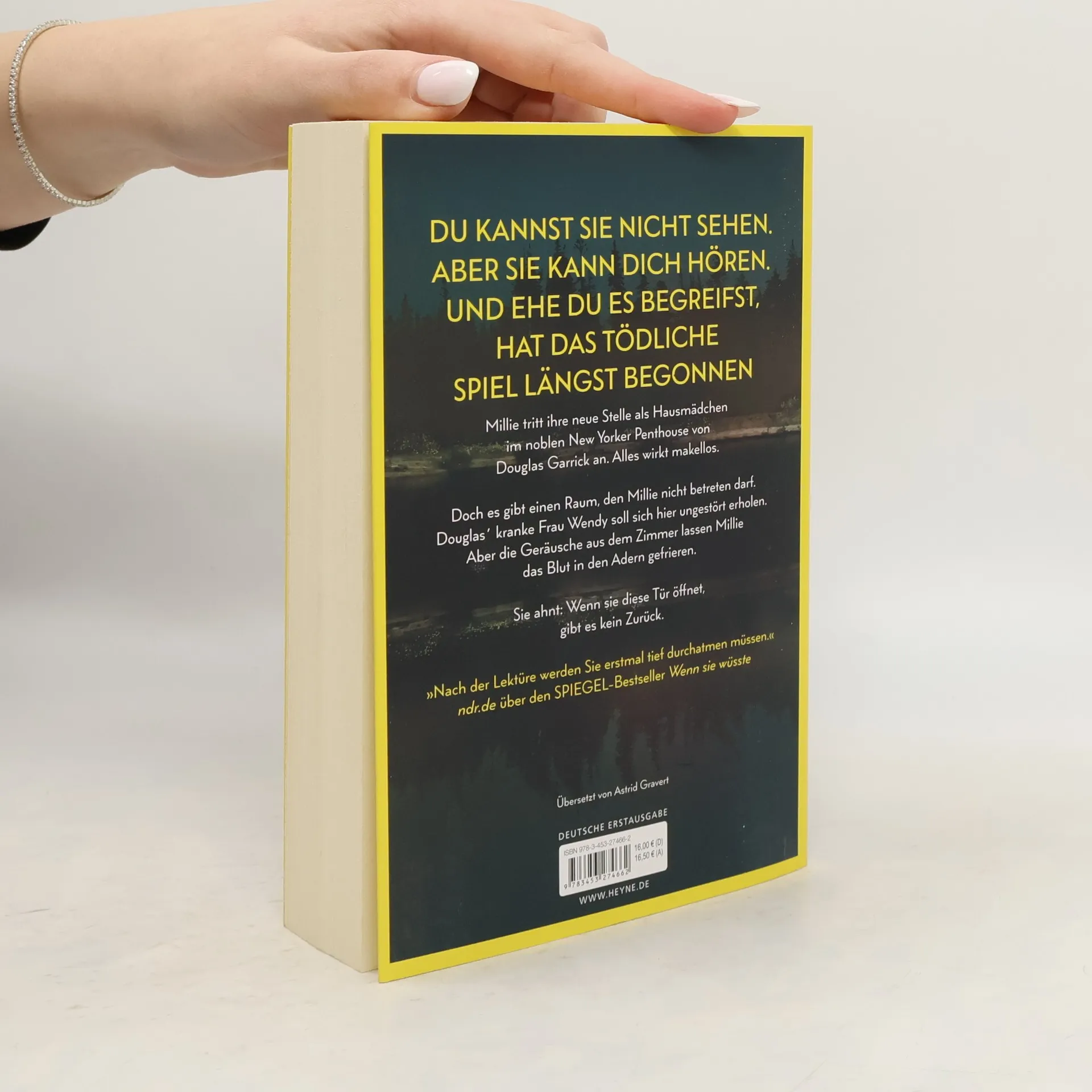 Du kannst sie nicht sehen. Aber sie kann dich hören. Und ehe du es begreifst, hat das tödliche Spiel längst begonnen Millie Calloway hat einen neuen Job. Um sich ihr Studium zu finanzieren, hilft sie einem reichen Paar aus Manhattan im Haushalt. Ihr Arbeitgeber Douglas Garrick wirkt nett, und zum Glück stellt er ihr nicht zu viele Fragen zu ihrer Vergangenheit. Doch warum darf Millie nicht mit seiner Frau Wendy sprechen? Was bedeuten das Weinen, das sie aus dem verschlossenen Zimmer hört, und die Blutflecke auf Wendys Kleidung? Ist Douglas in Wahrheit nicht der fürsorgliche Ehemann, der er vorgibt zu sein? Millie weiß nur eins: Sie muss Wendy helfen. Auch wenn sie damit riskiert, dass ihr dunkelstes Geheimnis doch noch ans Licht kommt.
