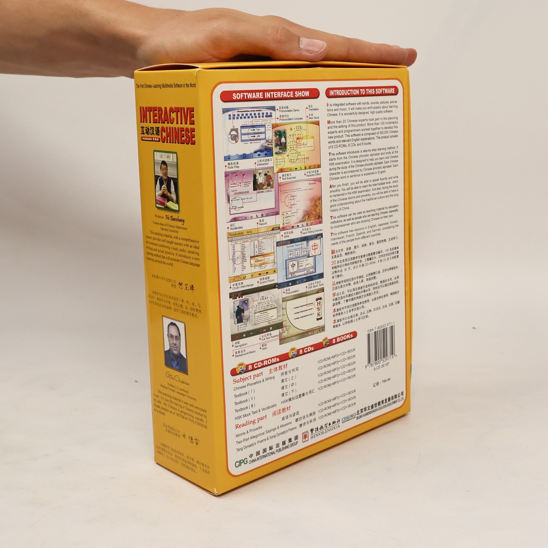 Containing: 8 CD-ROMs (+MP3) 8 CDs 8 BOOKs It is integrated software with words, sounds, pictures, animations and music. It will make you enthusiastic about learning Chinese. It is wonderfully designed, high quality software. More than 20 Chinese experts took part in the planning and the editing of this product. More than 100 multimedia experts and programmers worked together to develop this new product. This software is composed of 300,000 Chinese words and relevant English expIanations. This product consists of 8 CD ROMs, 8 CDs and 8 books. This software introduces a step by step learning method. It starts from the Chinese phonetic alphabet and ends at the HSK examination. It is designed to help you learn oral Chinese during the study of the Chinese phonetic alphabet. Each Chinese character is accompanied by Chinese phonetíc aIphabet. Each Chinese word or sentence is expIained in English. After you finish, you will be able to speak fluenfly and write smoothIy.You will be able to reach the intermediate level, which is mentioned in the HSK examination. And also, during the study of the Chinese idioms and proverbs, you will be able to have a good understanding about the traditional culture and the long history of China. This software can be used as teaching material by education institutions, as well as people who are learningChinese, especially by businessmen who are studyíng Chinese on their own.