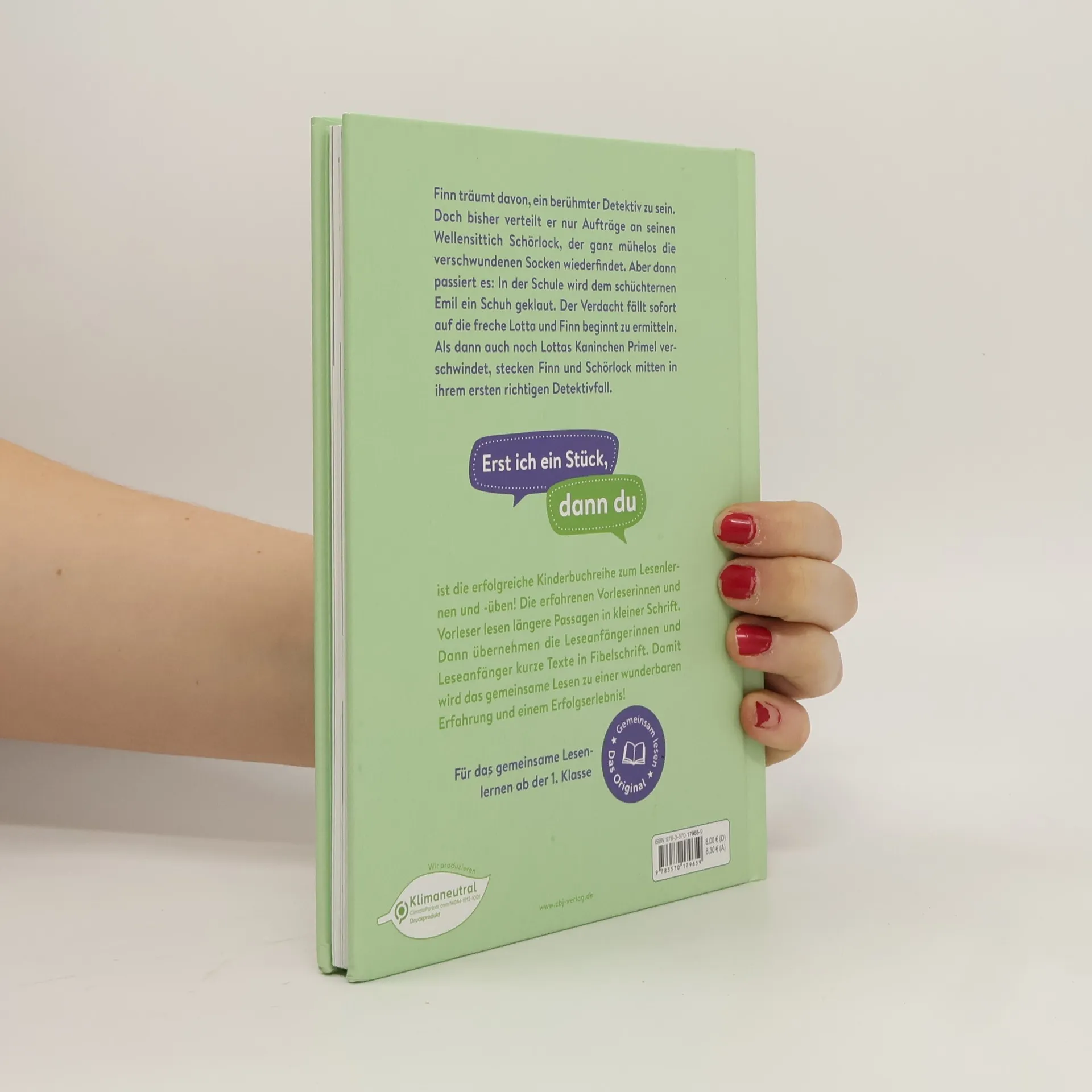 Die erfolgreiche Kinderbuchreihe mit bewährtem Konzept für das gemeinsame Lesenlernen und -üben Finn träumt davon, ein berühmter Detektiv zu sein. Doch bisher verteilt er nur Aufträge, nämlich an seinen Wellensittich Schörlock, der mühelos verschwundene Socken wiederfindet. Aber dann passiert es: In der Schule wird ausgerechnet dem schüchternen Emil während des Sportunterrichts ein Schuh geklaut. Der Verdacht fällt sofort auf Lotta, das frechste Mädchen der ganzen Schule, und Finn beginnt zu ermitteln. Als dann auch noch Lottas Kaninchen Primel verschwindet, stecken Finn und Schörlock mitten in ihrem ersten richtigen Detektivfall. Wenn das Lesen für Leseanfänger noch mühsam ist, heißt es in vielen Familien: »Lass uns gemeinsam lesen. Erst ich ein Stück, dann du. Wir wechseln uns ab.« Deswegen ist unsere beliebte Erstleser-Reihe »Erst ich ein Stück, dann du« speziell für das gemeinsame Lesen konzipiert: * Leseabschnitte für die erfahrenen Vorleser*innen und die Leseanfänger*innen wechseln sich ab * längere Passagen für Vorleser*innen in kleiner Schrift * kurze Texte für Leseanfänger*innen in Fibelschrift So macht gemeinsames Lesenlernen Spaß! Ausstattung: Mit fbg. Illustrationen
