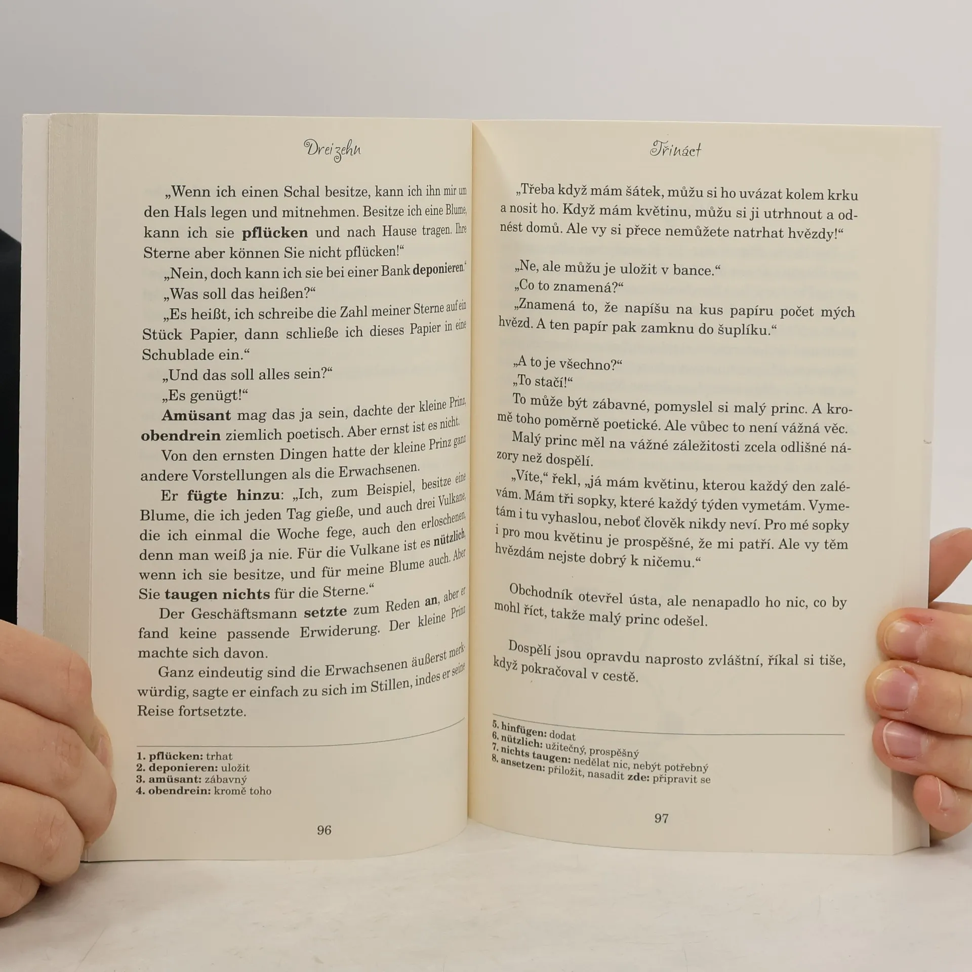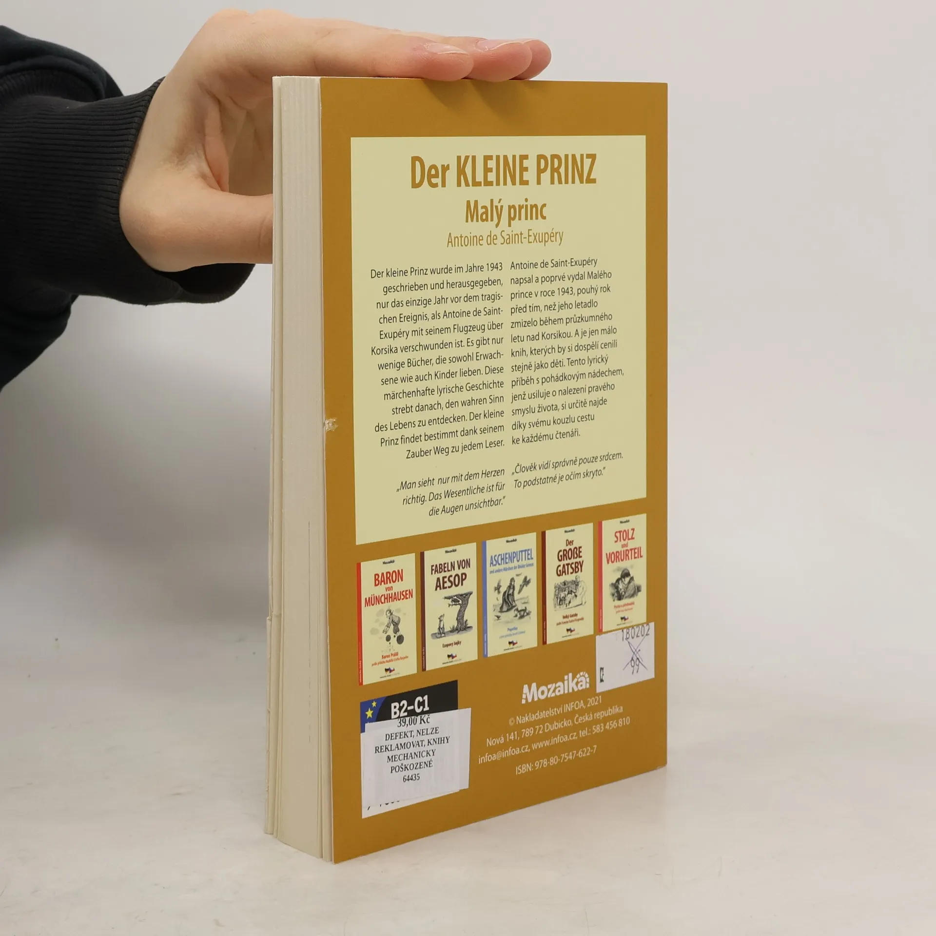 Antoine de Saint-Exupéry napsal a poprvé vydal Malého prince v roce 1943, pouhý rok před tím, než jeho letadlo zmizelo během průzkumného letu nad Korsikou. A je jen málo knih, kterých by si dospělí cenili stejně jako děti. Tento lyrický příběh s pohádkovým nádechem, jenž usiluje o nalezení pravého smyslu života, si určitě najde díky svému kouzlu cestu ke každému čtenáři. „Člověk vidí správně pouze srdcem. To podstatné je očím skryto.” Německo - český zrcadlový text pro mírně a středně pokročilé Antoine de Saint-Exupéry schrieb und veröffentlichte The Little Prince 1943, nur ein Jahr bevor sein Flugzeug während eines Aufklärungsfluges über Korsika verschwand. Und es gibt nur wenige Bücher, die Erwachsene so schätzen würden wie Kinder. Diese lyrische Geschichte mit einem märchenhaften Touch, die den wahren Sinn des Lebens finden will, wird dank ihres Charmes sicherlich ihren Weg zu jedem Leser finden. "Man sieht nur mit dem Herzen richtig. Das Wesentliche ist unsichtbar. “ Deutsch - Tschechischer Spiegeltext für Fortgeschrittene.