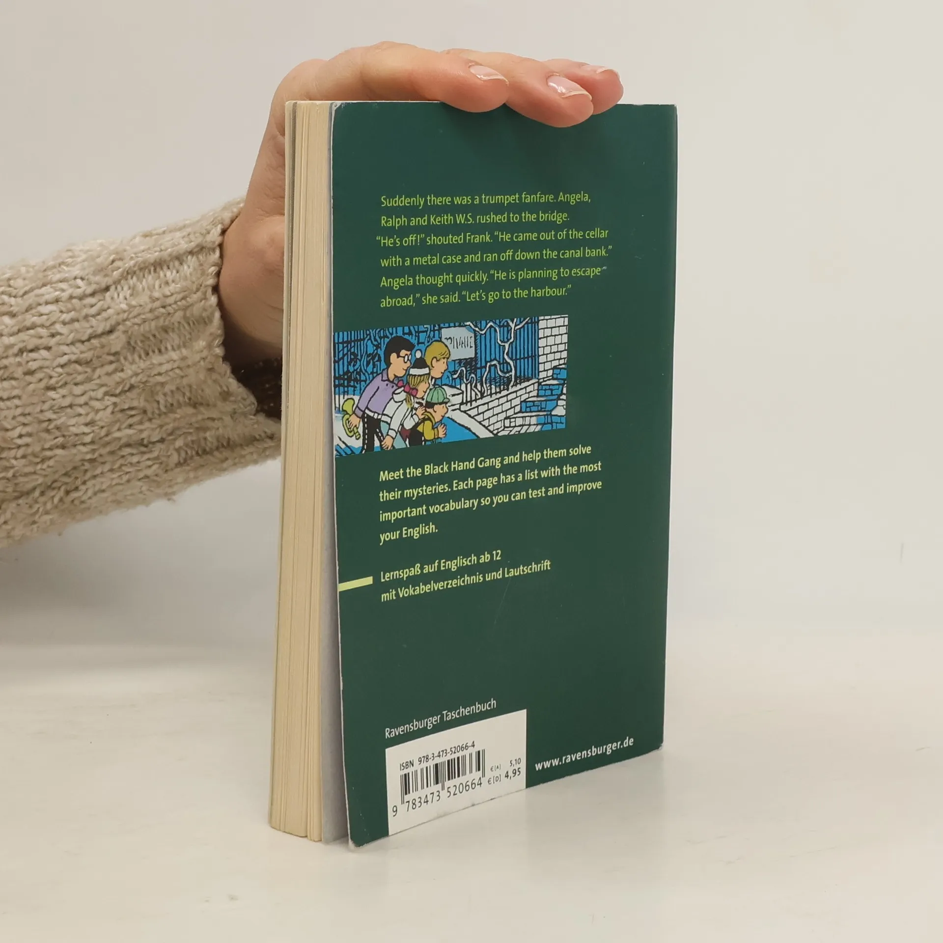 Let’s go to Canal St No. 49, climb the 72 creaky steps until you reach the “Airport”, which is directly beneath the pigeonry. Here, the members of The Black Hand Gang meet regularly after school. In the gang there´s the boss Felix, always carrying a trumpet, the intelligent Adele, Rollo wearing his favourite striped pullover and Kiki w. s. with his companion the squirrel. These master detectives are always busy as their main aim is to suss out all the crooks and bandits of their town. And now they are looking for a new member to join their gang. What about you? Wie in der Originalausgabe „Die Abenteuer der schwarzen Hand“ kannst du auch in der englischen Ausgabe mithilfe der in den Bildern versteckten Hinweise die Freunde bei der Auflösung der Kriminalfälle unterstützen und dabei deine Englischkenntnisse testen – denn auf jeder Seite befindet sich eine Liste mit den wichtigsten Vokabeln. So macht Englisch lernen Spaß! Weitere spannende Rätselkrimis aus dem Ravensburger Verlag: „Schnapp den Dieb!“ „Meisterdetektiv Sherlock Bones“