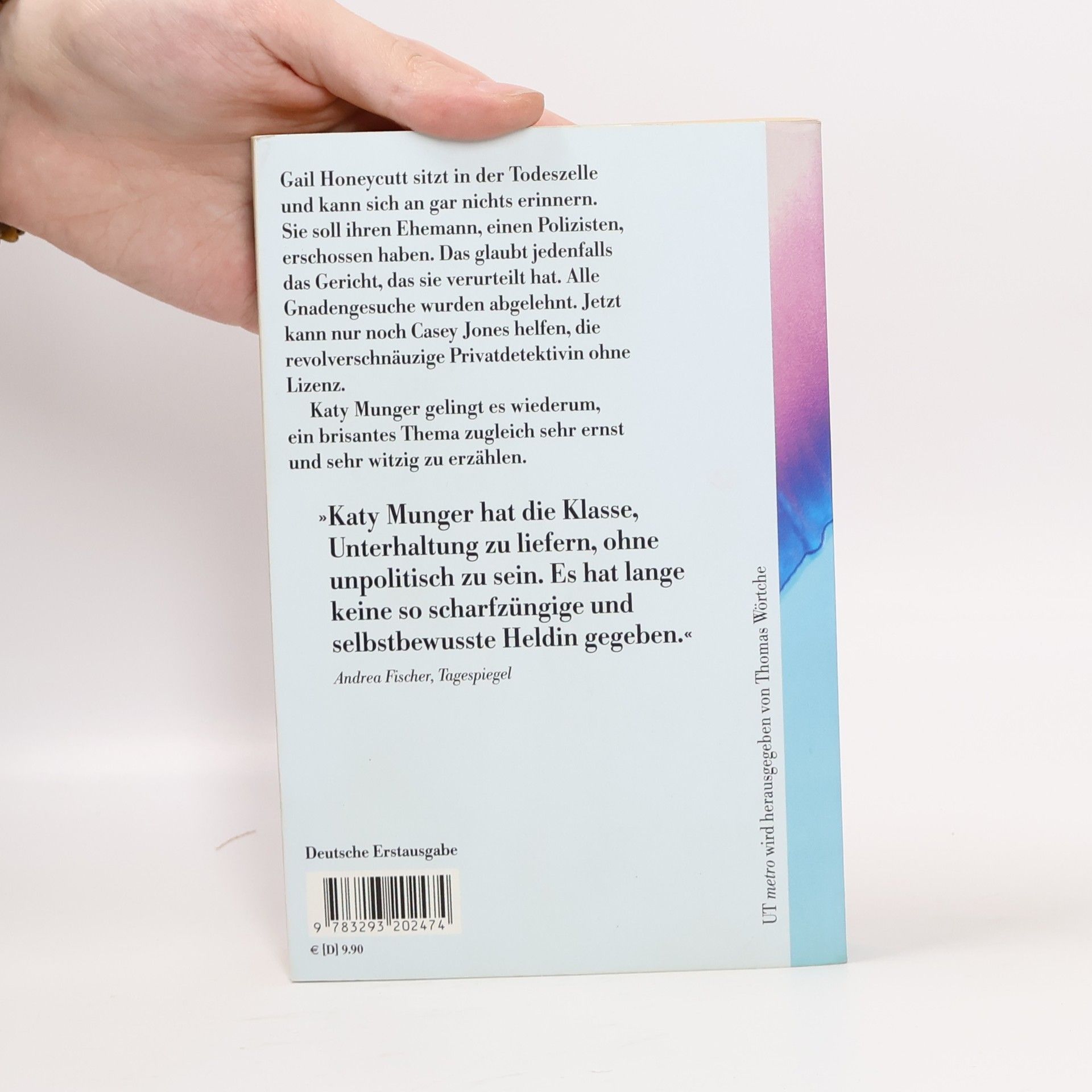 Gail Honeycutt sitzt in der Todeszelle und kann sich an gar nichts erinnern. Sie soll ihren Ehemann, einen Polizisten, erschossen haben. Das glaubt jedenfalls das Gericht, das sie verurteilt hat. Alle Gnadengesuche wurden abgelehnt. Jetzt kann nur noch Casey Jones helfen, die revolverschnäuzige Privatdetektivin ohne Lizenz. Kaum rollt sie den Fall wieder auf, gibt es weitere Tote. Und ihr Chef, der fette Bobby Dee, tyrannisiert derweil ein ganzes Krankenhaus. Katy Munger gelingt es, ein brisantes Thema zugleich sehr ernst und sehr witzig zu erzählen.