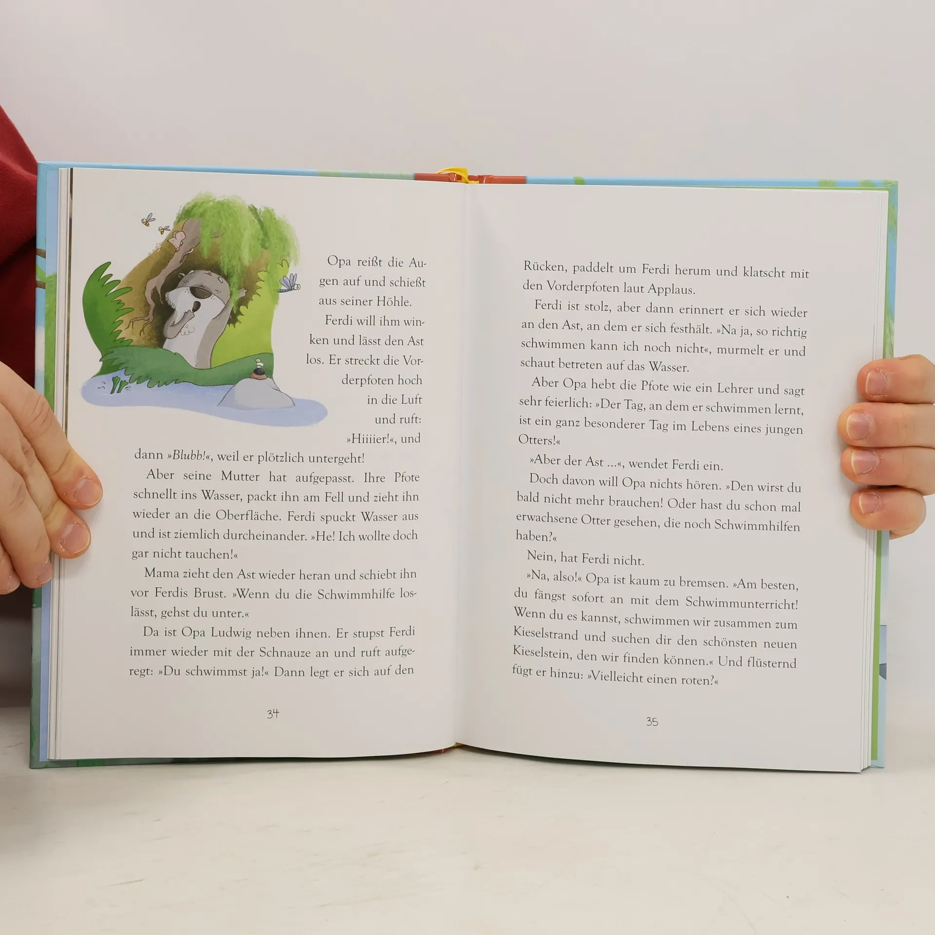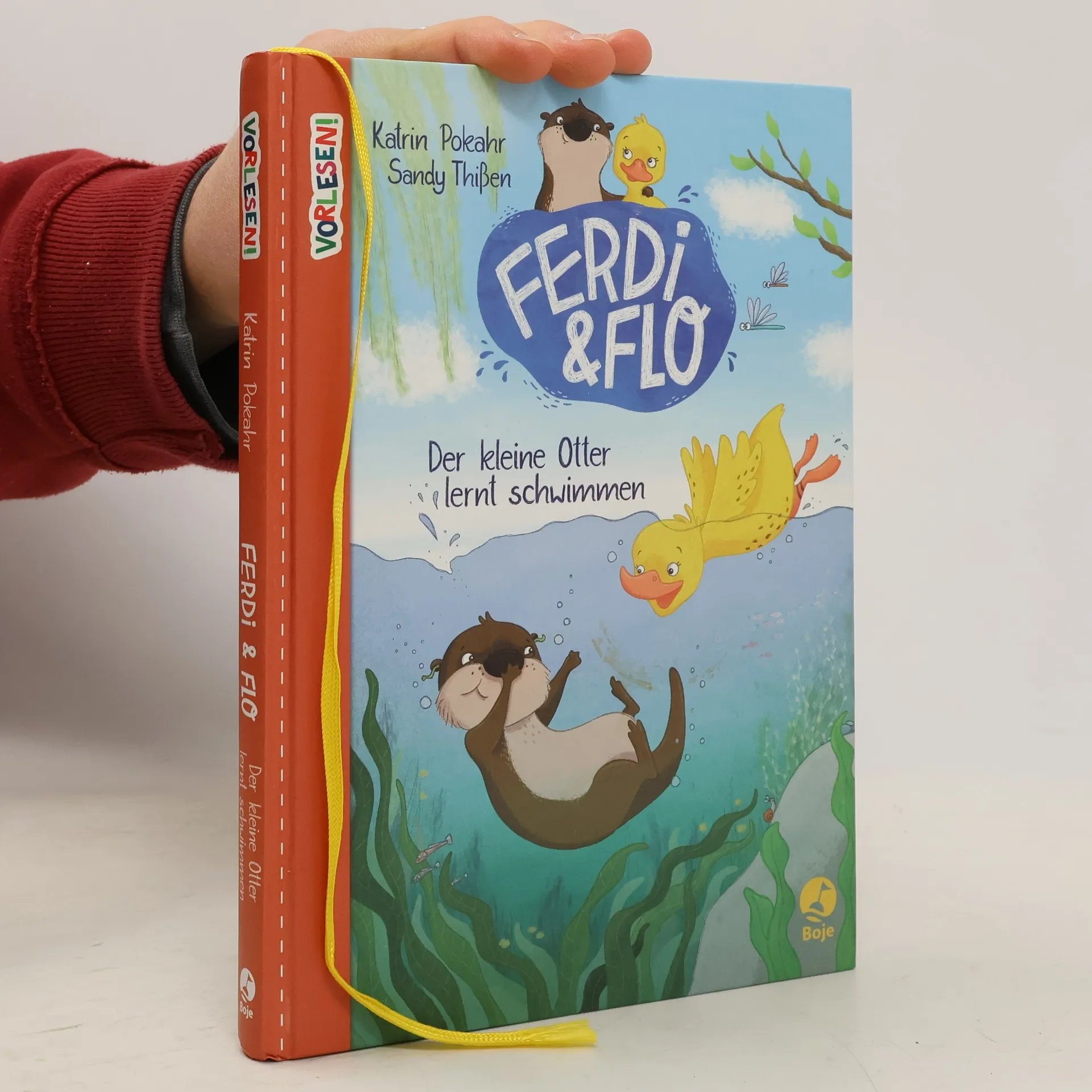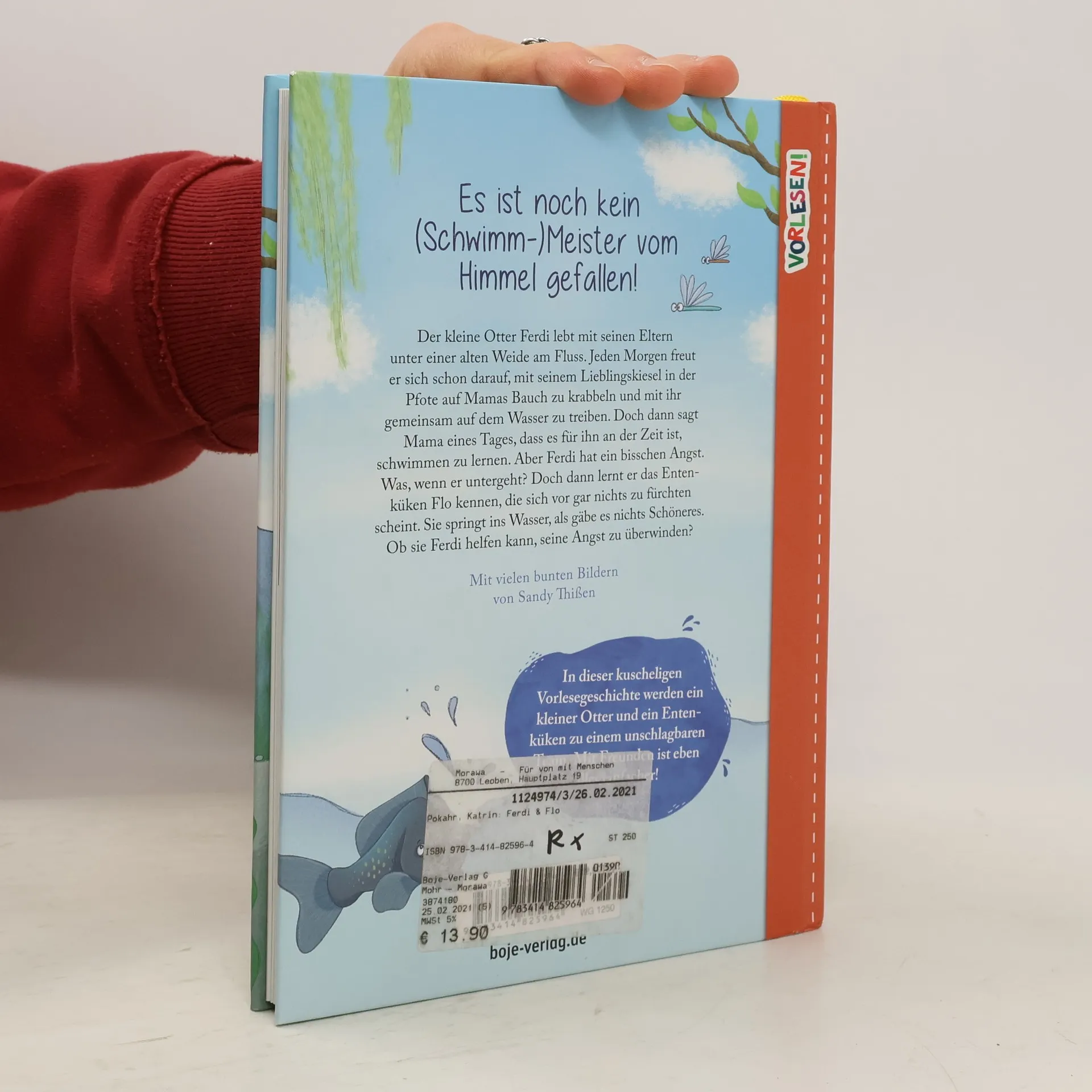 In dieser kuscheligen Vorlesegeschichte werden ein kleiner Otter und ein Entenküken zu einem unschlagbaren Team.Der kleine Otter Ferdi lebt mit seinen Eltern unter einer alten Weide am Fluss. Jeden Morgen freut er sich schon darauf, mit seinem Lieblingskiesel in der Pfote auf Mamas Bauch zu krabbeln und mit ihr gemeinsam auf dem Wasser zu treiben. Doch dann sagt Mama eines Tages, dass es für ihn an der Zeit ist, schwimmen zu lernen. Aber Ferdi hat ein bisschen Angst. Was, wenn er untergeht? Doch dann lernt er das Entenküken Flo kennen, die sich vor gar nichts zu fürchten scheint. Sie springt ins Wasser, als gäbe es nichts Schöneres. Ob sie Ferdi helfen kann, seine Angst zu überwinden?Besonders liebevoll gestaltet:- Eintragfeld am Anfang des Buches, zur Erinnerung an eine besondere Vorlesesituation- Viele bunte Bilder von Sandy Thißen, die zum Zuhören und Entdecken einladen- Hübsches Lesebändchen- Süße Sticker, die vorne ins Buch geklebt werden können, um den Lesefortschritt sichtbar zu machen- Wichtige Themen kinderleicht erzählt: vom Mutigsein, Schwimmenlernen und FreundefindenDieses Buch ist auf Antolin gelistet.