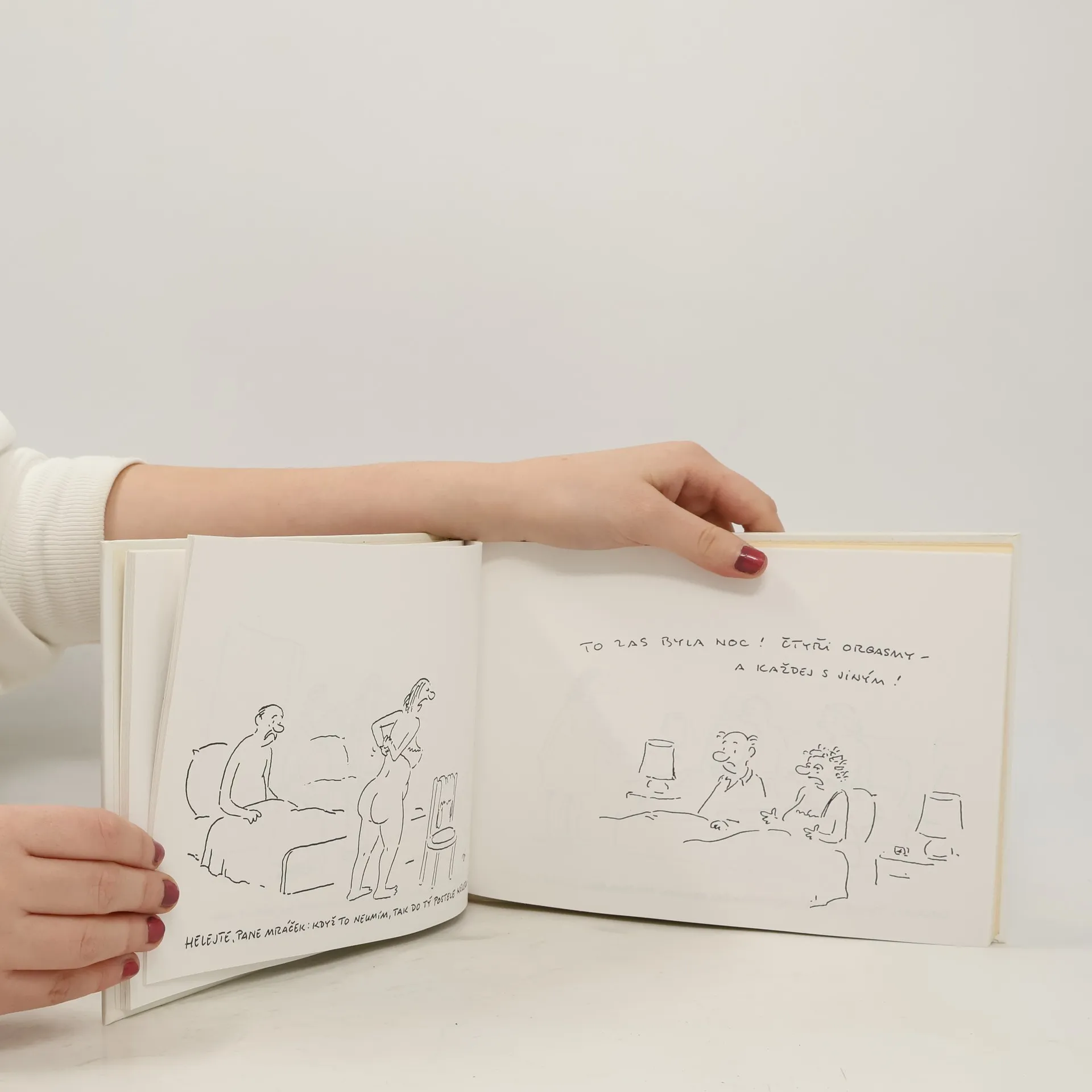Kniha kreslených ostřejších vtipů známého výtvarníka Vladimíra Jiránka na téma partnerské vztahy a sex. Ilustrace černobílé celostránkové.
