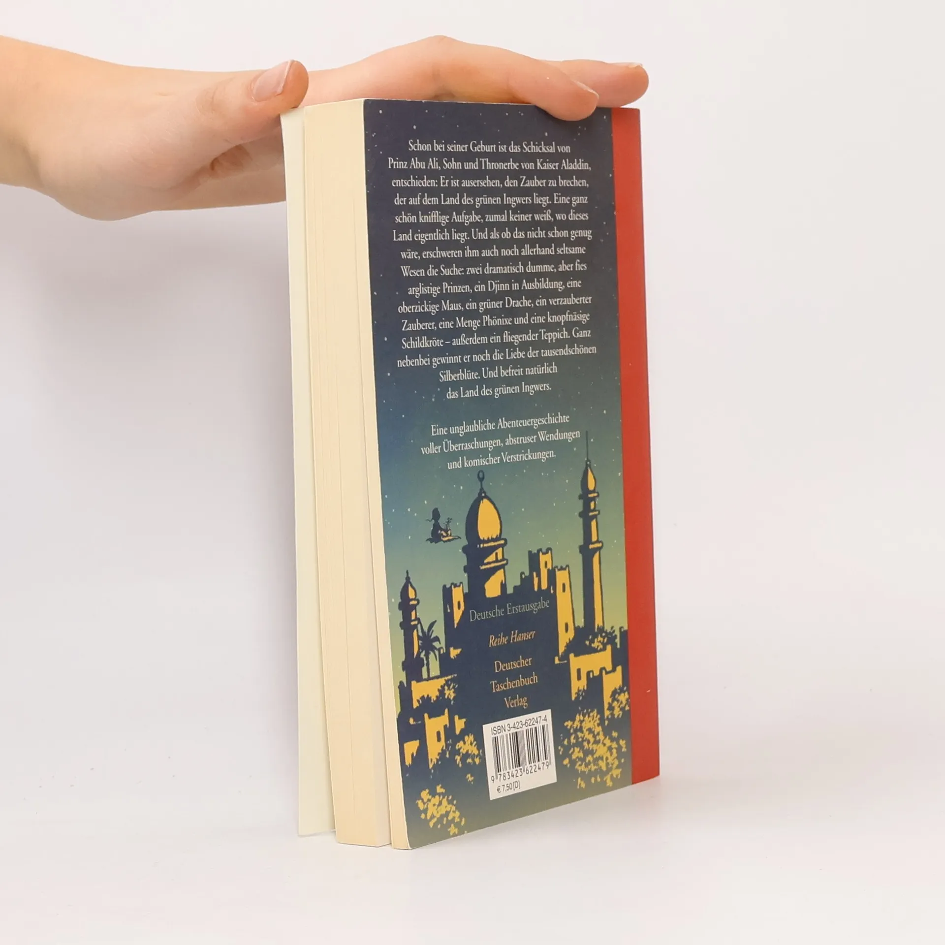 Eine unglaubliche Abenteuergeschichte voller Überraschungen, abstruser Wendungen und komischer Verstrickungen Aufregung am Hof von Kaiser Aladdin: Prinz Abu Ali, Sohn und Thronerbe, ist ausersehen, den Zauber auf dem Land des grünen Ingwer liegt, zu brechen. Auf seiner Mission trifft er allerlei Gestalten: einen Baby-Djinn, eine zickige Zaubermaus, einen grünen Drachen, den verzauberten Zauberer, die knopfnäsige Schildkröte und zwei wirkliche ganz schlimme schurkenhafte Prinzen. Das Herz der tausenschönen Silberblüte zu erobern, ist da zwar eine der schwersten Aufgaben, aber auch die schönste.