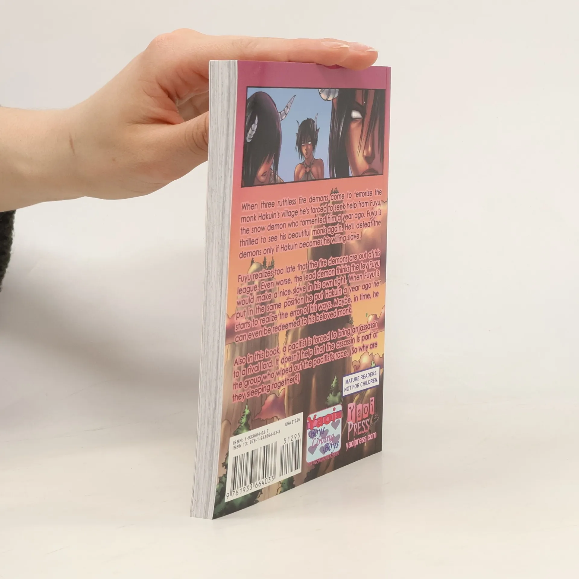 When three ruthless fire demons come to terrorize the monk Hakuin's village he's forced to seek help from Fuyu, the snow demon who tormented him a year ago. Fuyu is thrilled to see his beautiful monk again. He'll defeat the demons only if Hakuin becomes his willing slave. Fuyu realizes too late that the fire demons are out of his league. Even worse, the lead demon thinks the fey Fuyu would make a nice slave in his own right. When Fuyu is put in the same position he put Hakuin a year ago he starts to realize the error of his ways. Maybe, in time, he can even be redeemed to his beloved monk. Also, a pacifist is forced to bring an assassin to a rival lord. It doesn't help that the assassin is part of the group who wiped out the pacifist's race. So why are they sleeping together?
