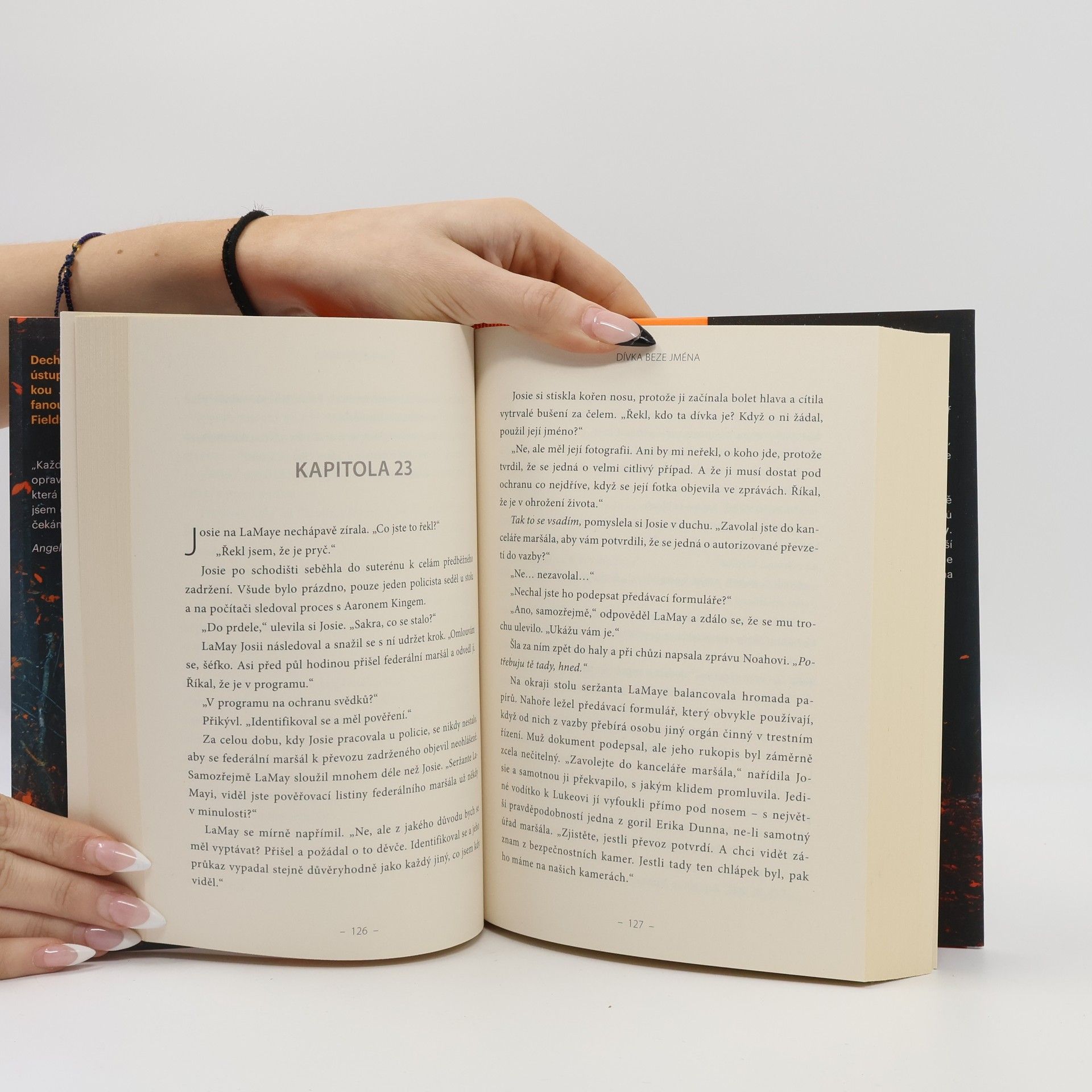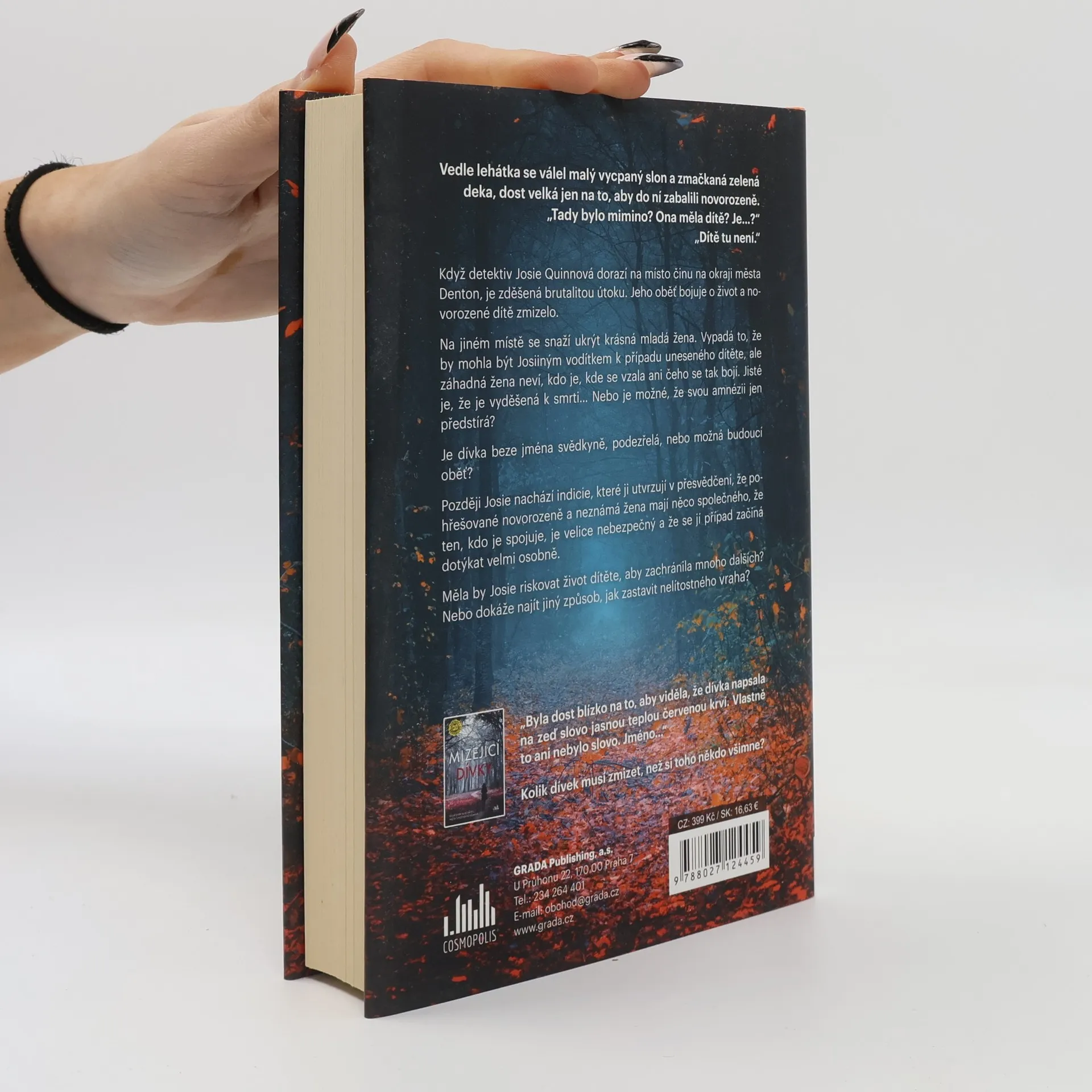 Vedle lehátka se válel malý vycpaný slon a zmačkaná zelená deka, dost velká jen na to, aby do ní zabalili novorozeně. „Tady bylo mimino? Ona měla dítě? Je…?“ „Dítě tu není.“ Když detektiv Josie Quinnová dorazí na místo činu na okraji města Denton, je zděšená brutalitou útoku. Jeho oběť bojuje o život a novorozené dítě zmizelo. Na jiném místě se snaží ukrýt krásná mladá žena. Vypadá to, že by mohla být Josiiným vodítkem k případu uneseného dítěte, ale záhadná žena neví, kdo je, kde se vzala ani čeho se tak bojí. Jisté je, že je vyděšená k smrti… Nebo je možné, že svou amnézii jen předstírá? Je dívka beze jména svědkyně, podezřelá, nebo možná budoucí oběť? Později Josie nachází indicie, které ji utvrzují v přesvědčení, že pohřešované novorozeně a neznámá žena mají něco společného, že ten, kdo je spojuje, je velice nebezpečný a že se jí případ začíná dotýkat velmi osobně. Měla by Josie riskovat život dítěte, aby zachránila mnoho dalších? Nebo dokáže najít jiný způsob, jak zastavit nelítostného vraha?