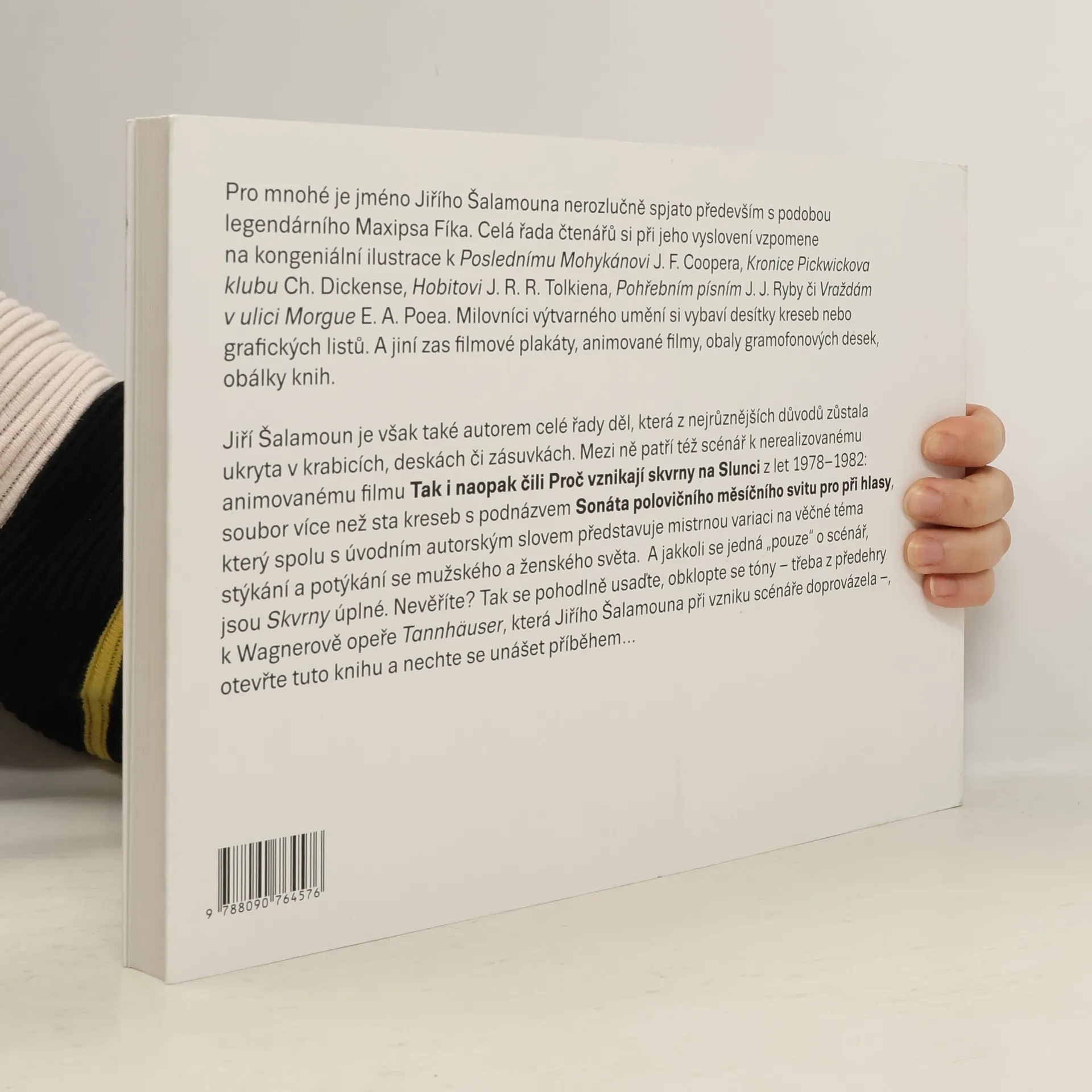 Jiří Šalamoun je autorem celé řady děl, která z nejrůznějších důvodů zůstala ukryta v krabicích, deskách či zásuvkách. Mezi ně patří též scénář k nerealizované animovanému filmu Tak i naopak čili Proč vznikají skvrny na Slunci z let let 1978 - 1972. Soubor více než sta kreseb spodnázvem Sonáta polovičního měsíčního svitu pro při hlasy, který spolu s úvodním autorským slovem představuje mistrnou variaci na věčné téma stýkání a potýkání se mužského a ženského světa. A jakkoli se jedná "pouze" o scénář, jsou Skvrny úplné. Nevěříte? Tak se pohodlně usaďte, obklopte se tóny - třeba z předehry k Wagnerově opeře Tannhäuser, která Jiřího Šalamouna při vzniku scénáře doprovázela -,otevřte tuto knihu a nechte se unášet příběhem... Na manželské lože s plným obsazením otevřeným oknem dopadající měsíční svit probudí nejprve snové já manžela a vytáhne ho oknem do noci...