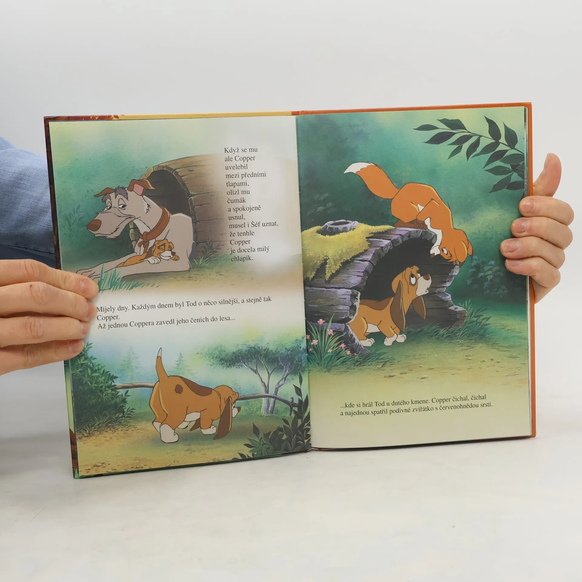 Opuštěný lišáček Tod, kterého se ujala vdova Tweedová, si brzy našel u sousedů nerozlučného kamaráda, štěňátko Coppera. Celé dny spolu dováděli, hráli si a skotačili. Copper byl ale lovecký pes a když vyrostl, o lišákovo přátelství už nestál a začal ho dokonce pronásledovat. Pak se však oba utkali s nebezpečným grizzlym...