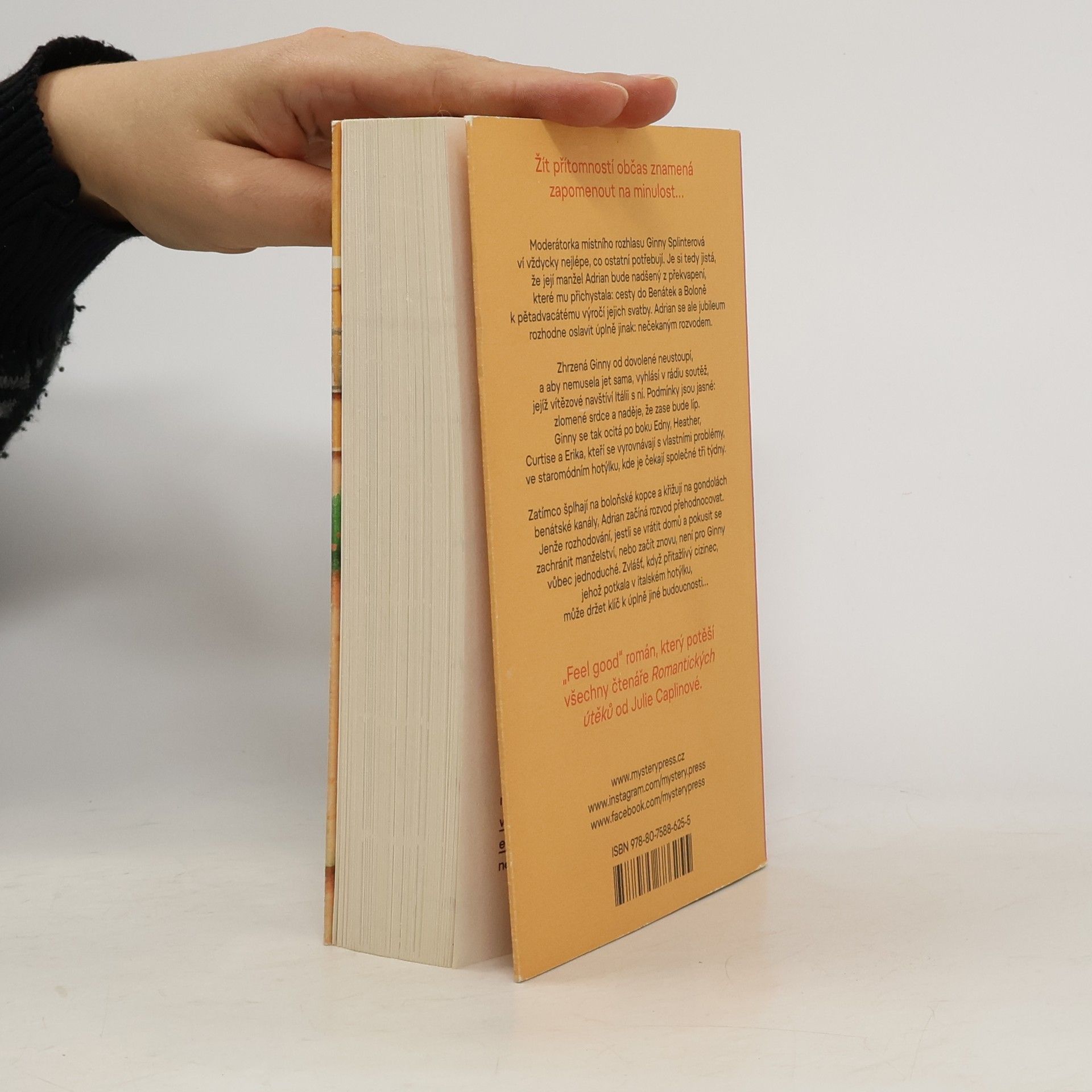Ženský román britské autorky o vyrovnání se s minulostí a nových začátcích. Moderátorka místního rozhlasu Ginny Splinterová ví vždycky nejlépe, co ostatní potřebují. Je si tedy jistá, že její manžel Adrian bude nadšený z překvapení, které mu přichystala: cesty do Benátek a Boloně k pětadvacátému výročí jejich svatby. Adrian se ale jubileum rozhodne oslavit úplně jinak: nečekaným rozvodem. Zhrzená Ginny od dovolené neustoupí, a aby nemusela jet sama, vyhlásí v rádiu soutěž, jejíž vítězové navštíví Itálii s ní. Podmínky jsou jasné: zlomené srdce a naděje, že zase bude líp. Ginny se tak ocitá po boku Edny, Heather, Curtise a Erika, kteří se vyrovnávají s vlastními problémy, ve staromódním hotýlku, kde je čekají společné tři týdny. Nakladatelská anotace. Kráceno.