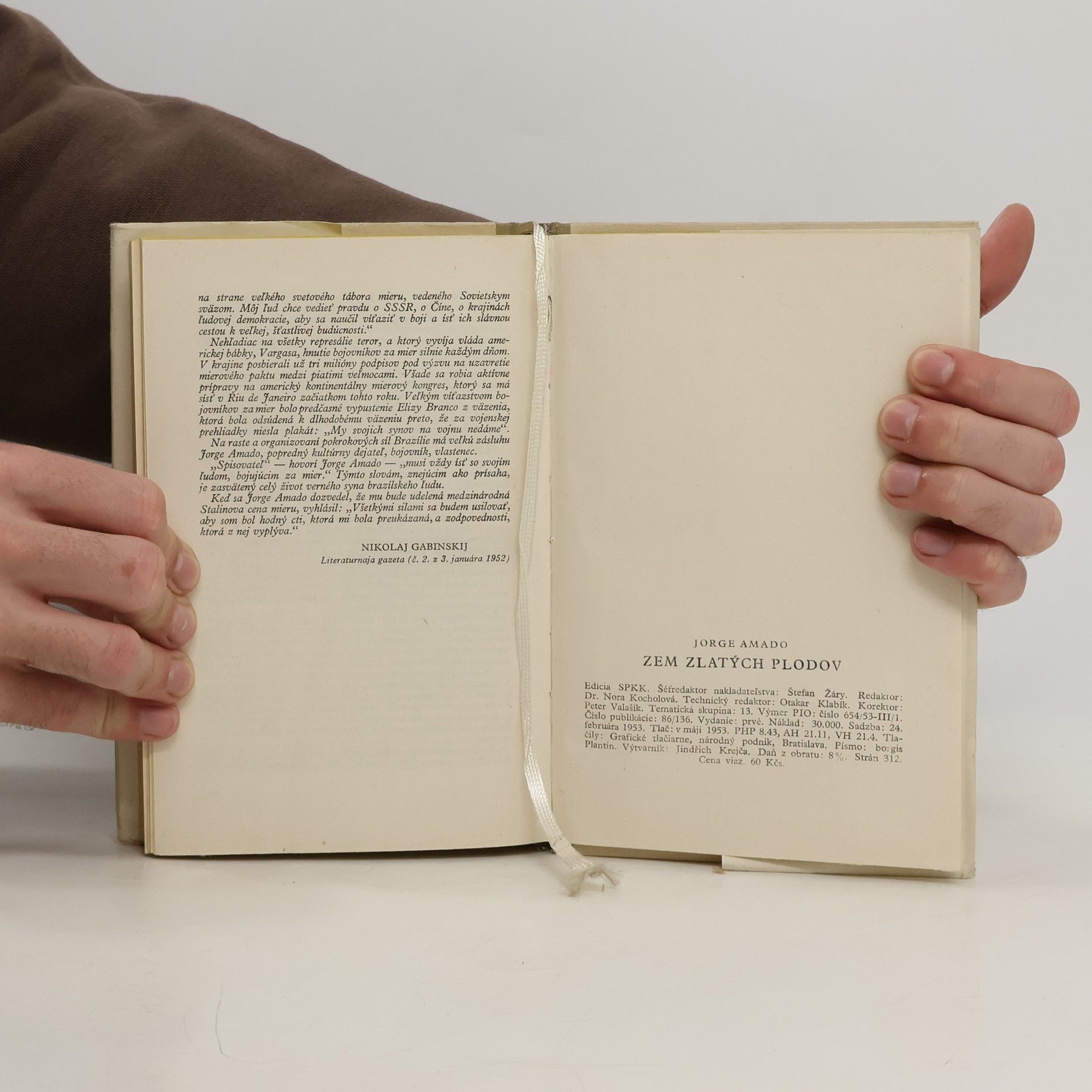 Jorge Amado, známy pokrokový brazílsky spisovateľ, nie je slovenským čitateľom neznámy. Román Zem zlatých plodov je už tretím románom, ktorý sa v preklade dostáva do rúk slovenských čitateľov, a to ako posledný sväzok dramatickej románovej epopeje o kakau, po románoch Zeme nekonečné a Cesty hladu. Román Zem zlatých plodov je pokračovaním románu Zeme nekonečné. Nadväzuje na osudy feudálnych pánov, ktorí v období imperializmu strácajú svoje krvou a vraždami vydobyté zeme a tieto prechádzajú do rúk ešte dravších a neludskejších, do rúk kapitalistických vývozcov. Súbežne s osudmi majiteľov plantáží predstavuje nám autor osudy tých, ktorým by po práve mala patriť zem, lebo na nej pracujú — robotníkov na kakaových fazendách. Život týchto robotníkov- „nádenníkov“ je opísaný priam otriasajúco. Zmena v majiteľoch pozemkov, prevzatie plantáží vývozcami, nič nemení na neľudskej biede týchto ľudí. Nemožno sa preto diviť, keď do opisu ukrutnej biedy týchto moderných otrokov autor miestami vplieta až naturalistické pasáže. Lež román sa nekončí bezútešne. Amado v tomto románe umelecky pravdivo predstavuje zahnívanie kapitalizmu vo svojej vlasti a naznačuje záblesky svitania sveta nového, socialistického. I keď tu niet ústredného hrdinu, čitateľovi je od prvej chvíle jasné, na strane koho sú všetky sympatie autorove.