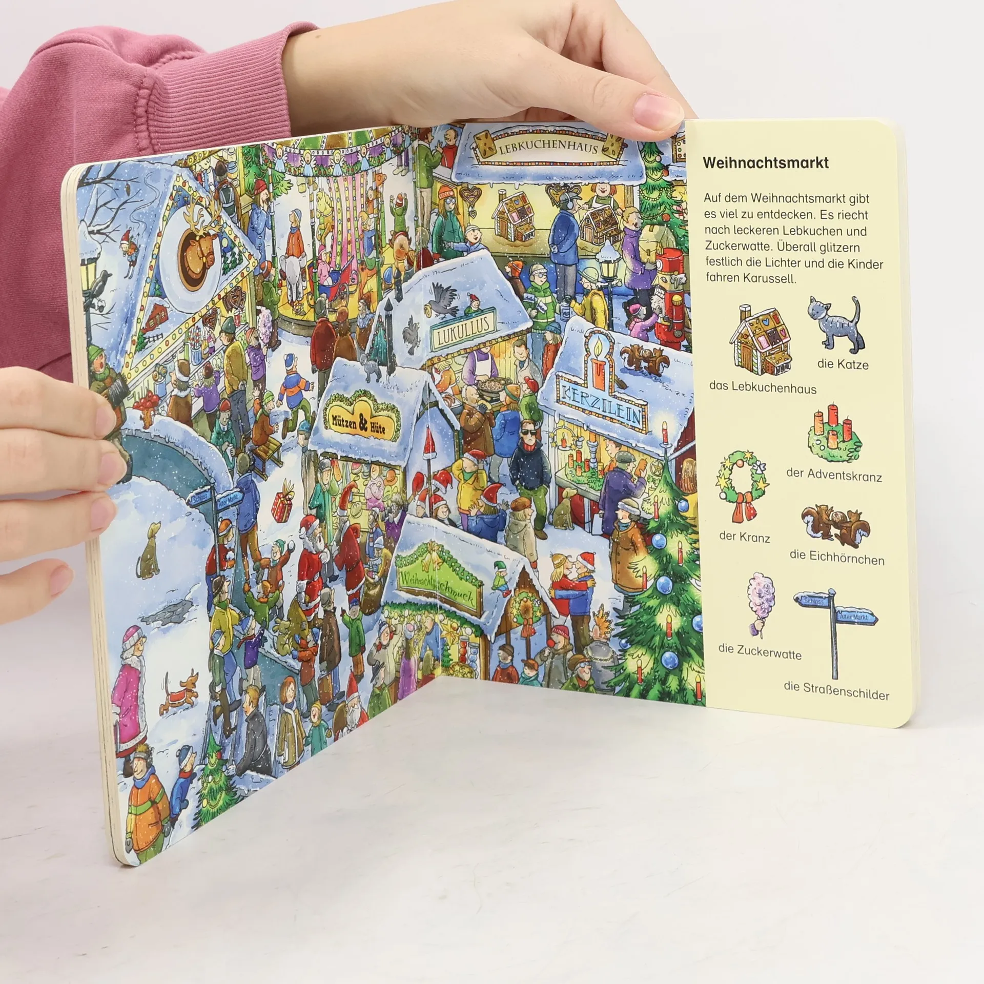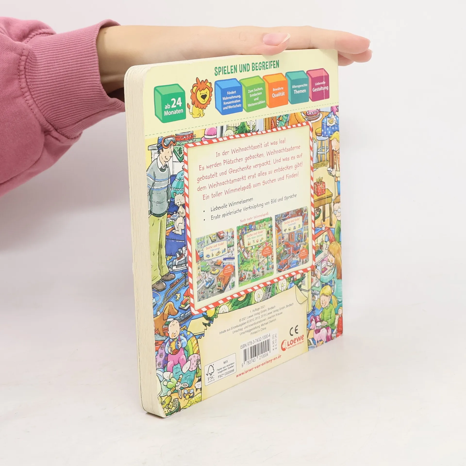 Das Buch ist bei deiner Buchhandlung vor Ort und bei vielen Online-Buchshops erhältlich! Ein toller Wimmelspaß zum Suchen und Finden! In der Weihnachtszeit ist was los! Es werden Plätzchen gebacken, Weihnachtssterne gebastelt und Geschenke verpackt. Und was es auf dem Weihnachtsmarkt erst alles zu entdecken gibt! - Liebevolle Wimmelszenen - Erste spielerische Verknüpfung von Bild und Sprache - Fördert Wahrnehmung, Konzentration und Wortschatz - Zum Suchen, Entdecken und Weitererzählen Ein Pappbilderbuch zum Thema Weihnachten und Winter für Kinder ab 2 Jahren , das in wimmeligen Bildern zum Entdecken und Wiedererkennen einlädt und so den Spracherwerb unterstützt.