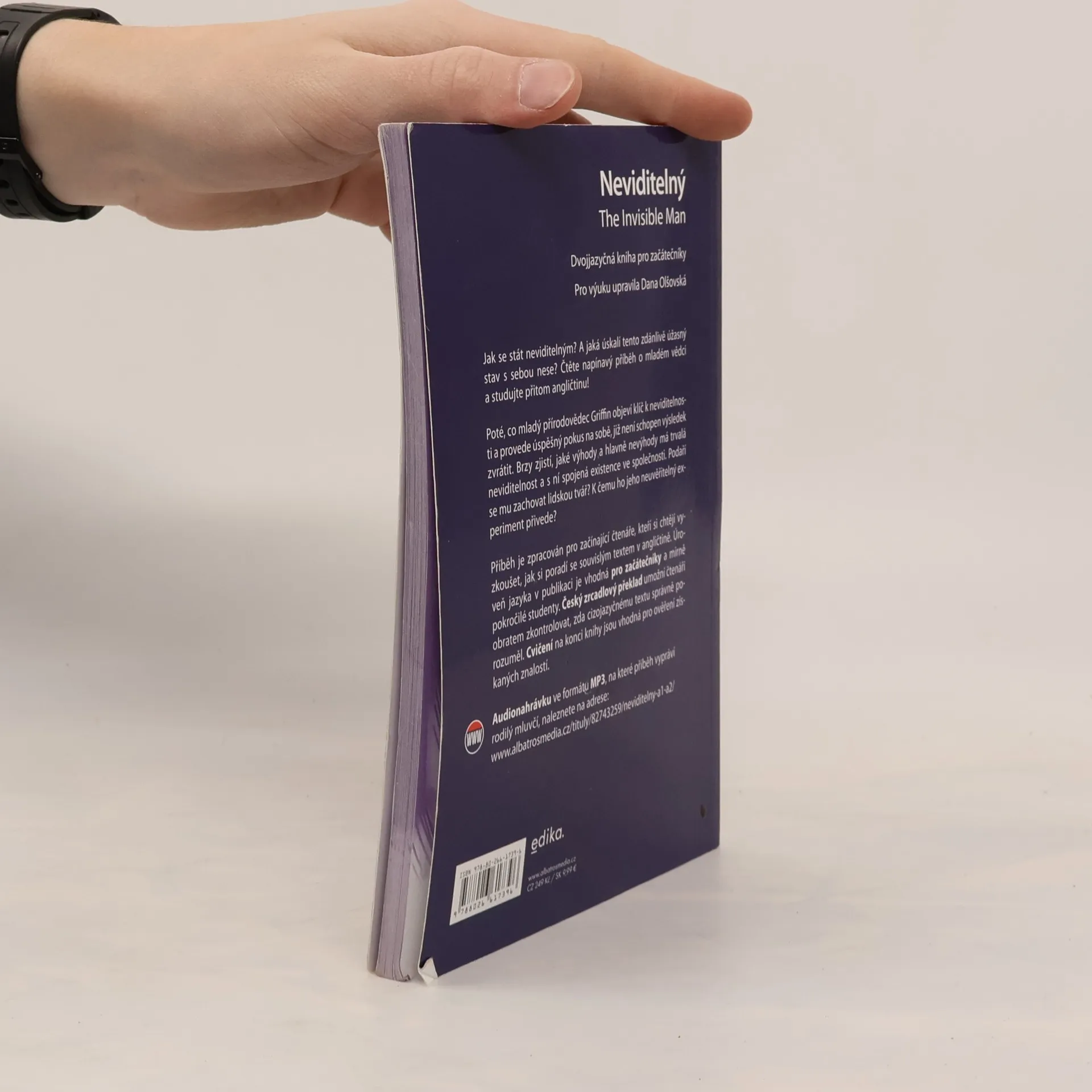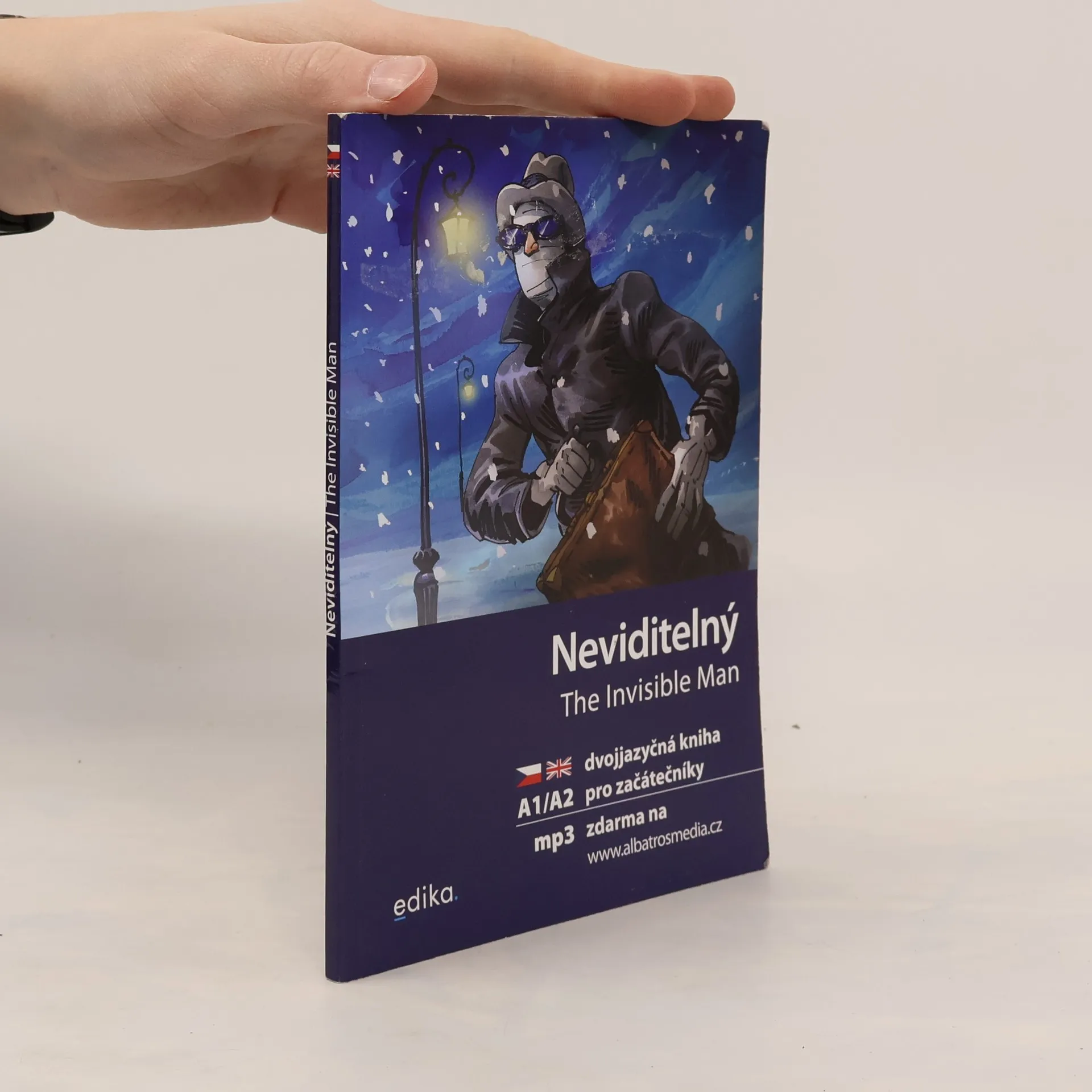 Zjednodušené dvojjazyčné převyprávění klasického fantastického románu H.G. Wellse, doplněné cvičeními a odkazem na MP3 nahrávku anglického textu. Určeno začátečníkům v angličtině.Román líčí příběh nadaného fyzika, který objevil metodu zprůsvitnění hmoty, a objevil tak princip neviditelnosti. Provede pokus sám na sobě a prochází řadou nesnází, které jeho neviditelnost zapříčiní, zároveň ale chápe, jak nesmírná moc se mu jeho objevem dostala do rukou. Rozhodne se zneužít svého vynálezu k tomu, aby ovládal lidstvo - jeho tragédií však je, že nepočítá s lidskou solidaritou proti teroru. Zahyne jako vyvrženec lidské společnosti v honbě, kterou na něj ohrožení spoluobčané uspořádali. Námět klasického fantastického příběhu zde byl převyprávěn zjednodušeným jazykem, doplněn zrcadlovým českým překladem, několika cvičeními a odkazem na MP3 nahrávku anglického textu v podání rodilého mluvčího. Celek je cvičným textem pro začínající angličtináře.