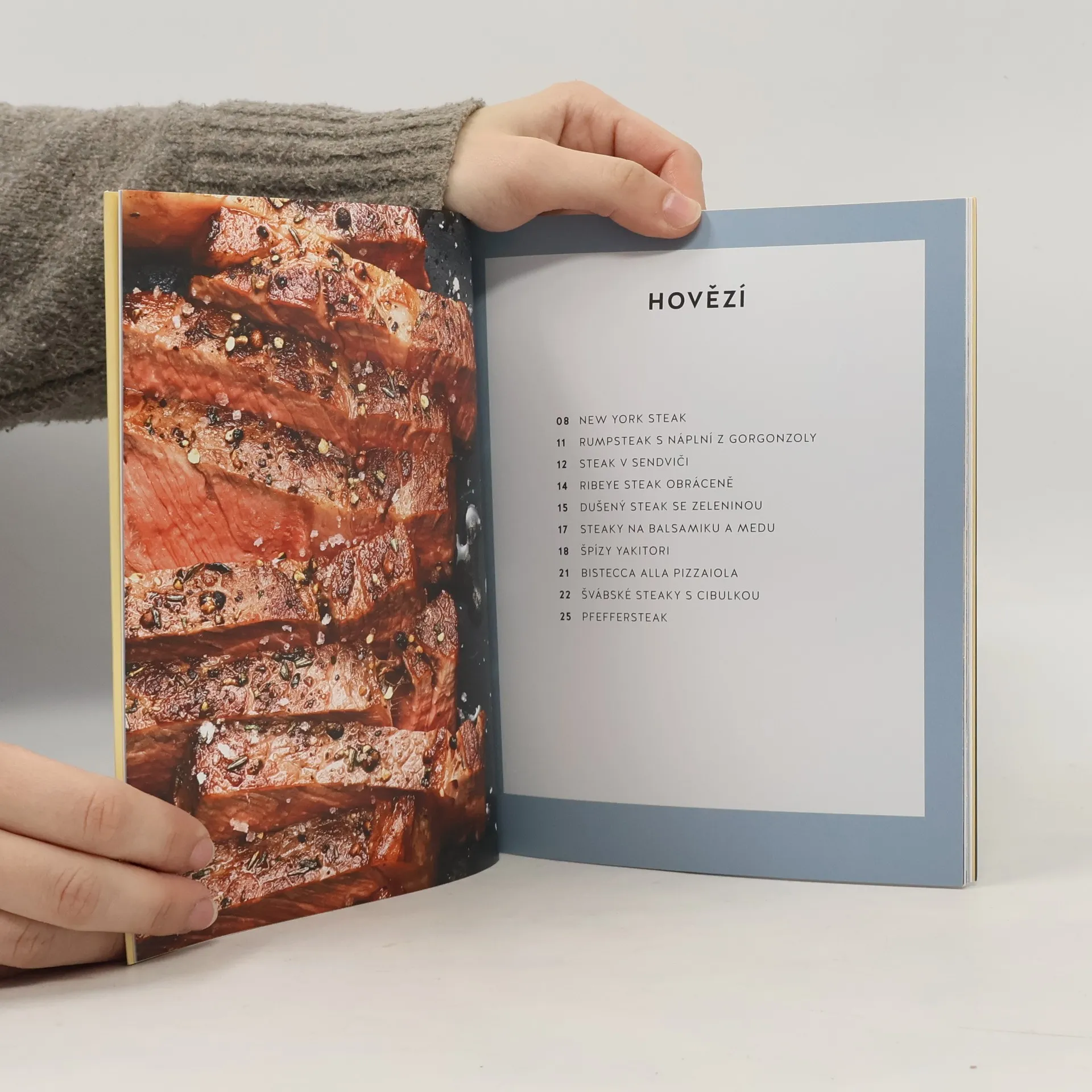 Rozmanité recepty a návody na přípravu hovězích, vepřových, jehněčích, zvěřinových i drůbežích steaků.