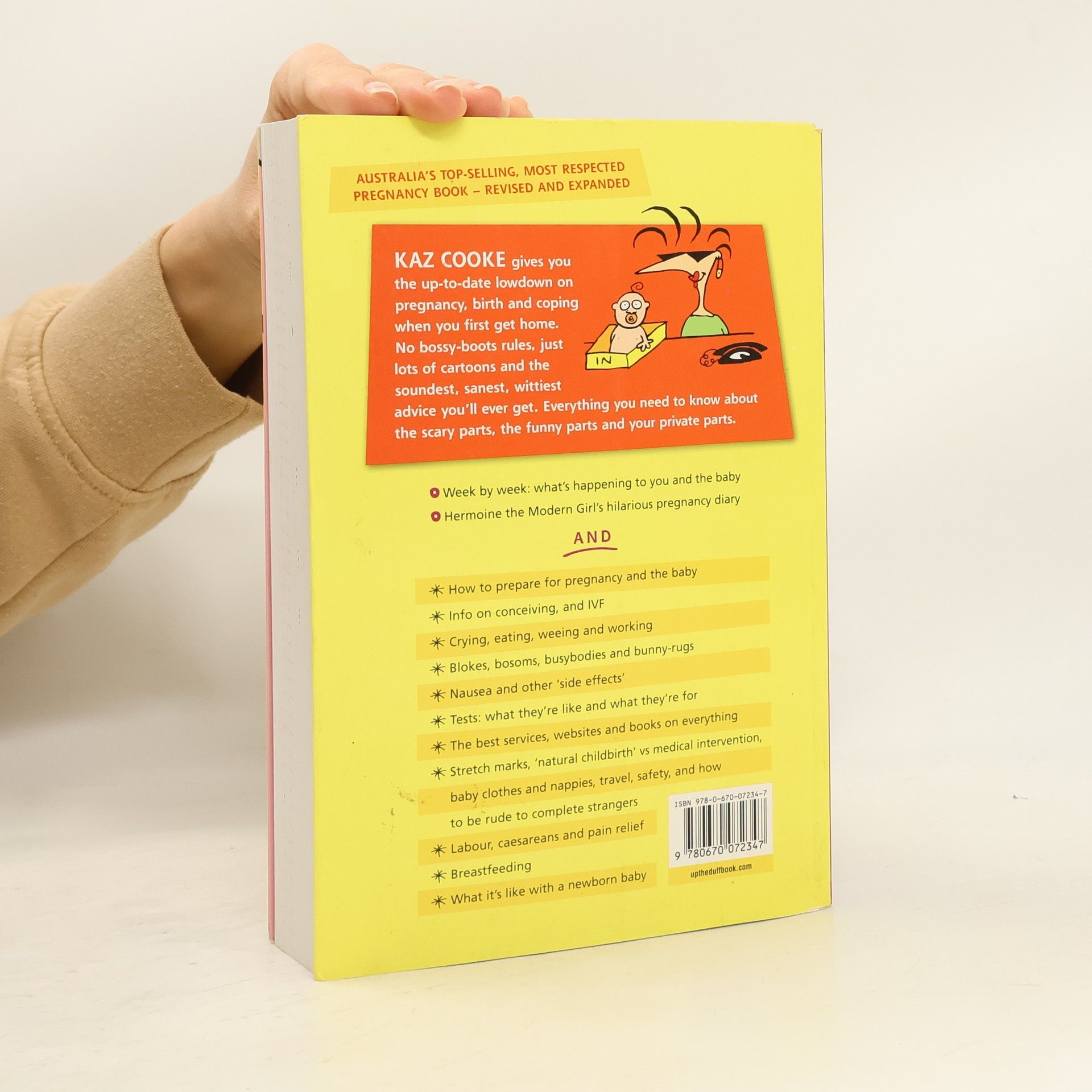 AUSTRALIA'S TOP-SELLING, MOST RESPECTED PREGNANCY BOOK -REVISED AND EXPANDED Updated 2015 For more visit uptheduffbook.com.au KAZ COOKE gives you the up-to-date lowdown on pregnancy, birth and coping when you first get home. No bossy-boots rules, just lots of cartoons and the soundest, sanest, wittiest advice you'll ever get. Everything you need to know about the scary parts, the funny parts and your private parts. Week by week: what's happening to you and the baby Hermoine and the Modern Girl's hilarious pregnancy diary AND How to prepare for pregnancy and the baby Info on conceiving, and IVF Crying, eating, weeing and working Blokes, bosoms, busybodies and bunny-rugs Nausea and other 'side effects' Tests: what they're like and what they are for The best services, websites and books on everything Stretch marks, 'natural childbirth' vs medical intervention, baby clothes and nappies, travel, safety, and how to be rude to complete strangers Labour, caesareans and pain relief Breastfeeding What it's like with a newborn baby