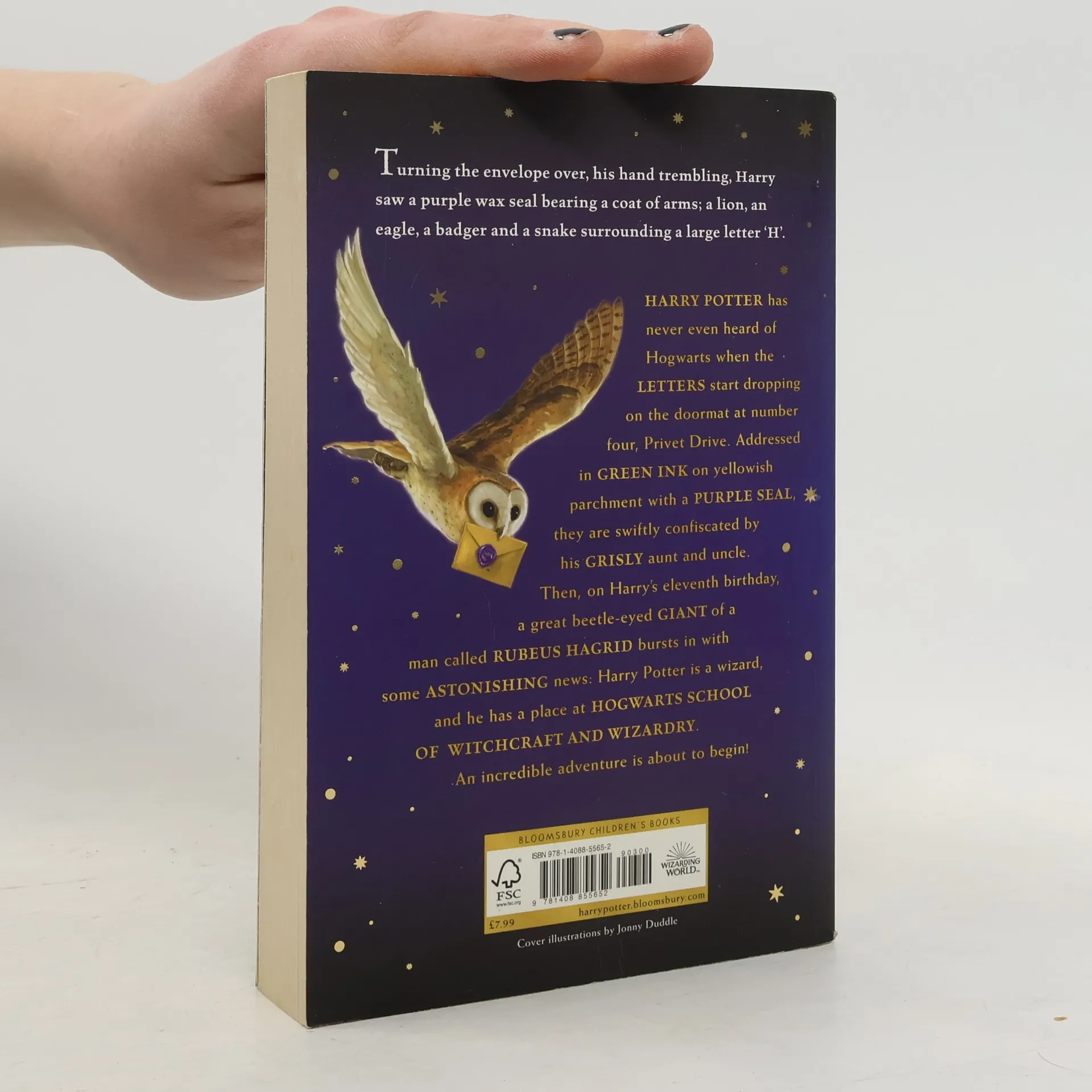 Harry Potter has never even heard of Hogwarts when the letters start dropping on the doormat at number four, Privet Drive. Addressed in green ink on yellowish parchment with a purple seal, they are swiftly confiscated by his grisly aunt and uncle. Then, on Harry's eleventh birthday, a great beetle-eyed giant of a man called Rubeus Hagrid bursts in with some astonishing news: Harry Potter is a wizard, and he has a place at Hogwarts School of Witchcraft and Wizardry. An incredible adventure is about to begin!These new editions of the classic and internationally bestselling, multi-award-winning series feature instantly pick-up-able new jackets by Jonny Duddle, with huge child appeal, to bring Harry Potter to the next generation of readers. It's time to PASS THE MAGIC ON .