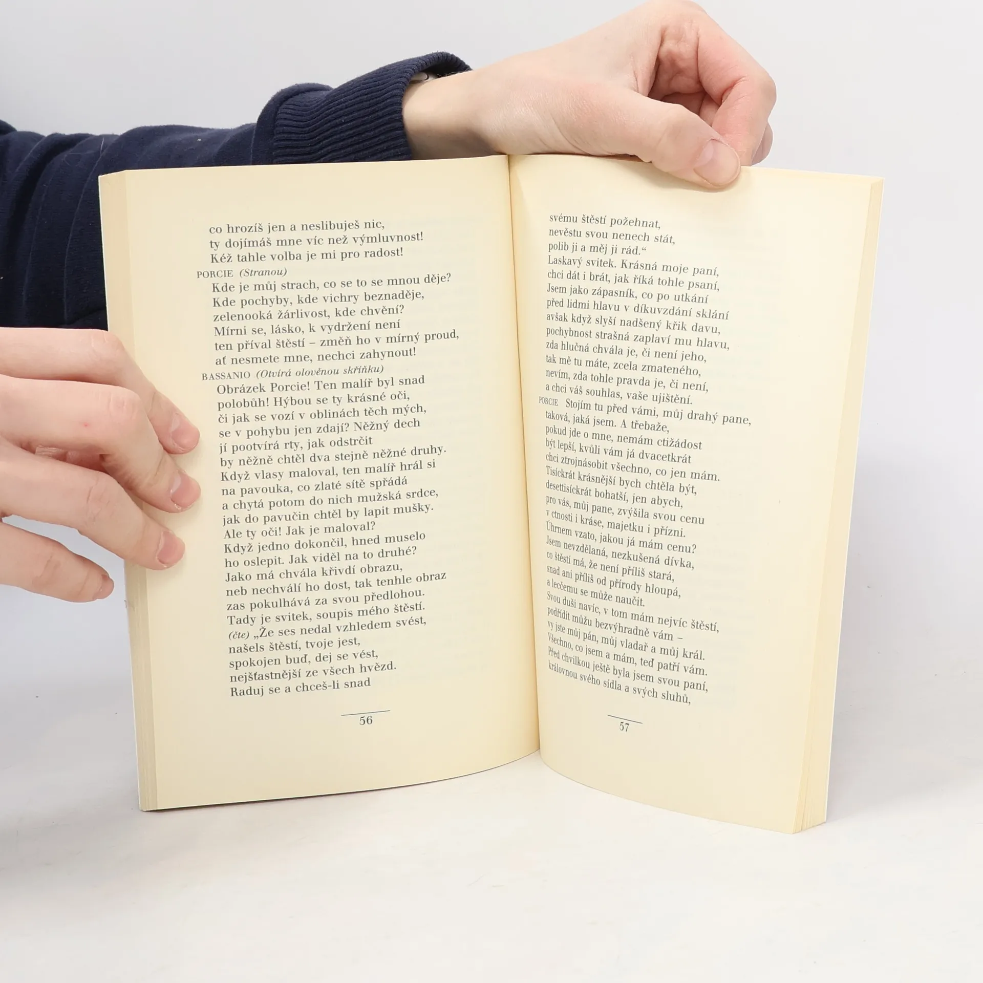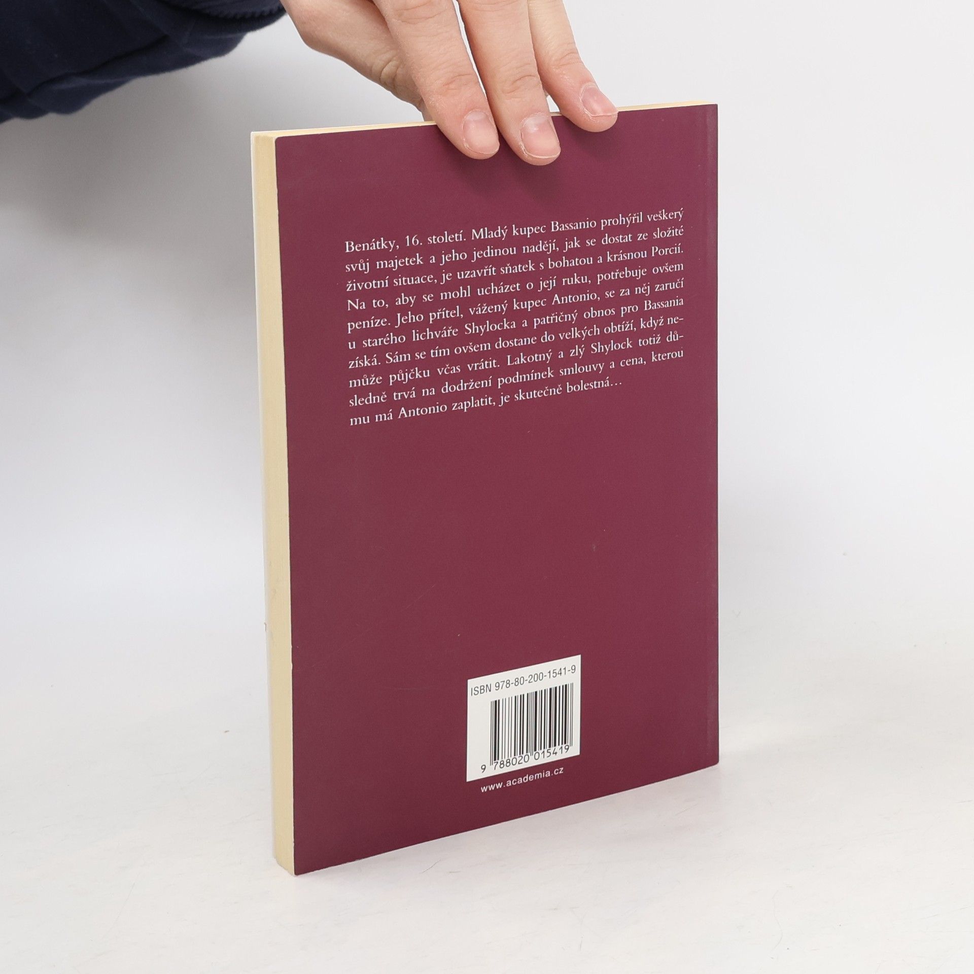 Benátky, 16. století. Mladý kupec Bassanio prohýřil veškerý svůj majetek a jeho jedinou nadějí, jak se dostat ze složité životní situace, je uzavřít sňatek s bohatou a krásnou Porcií. Na to, aby se mohl ucházet o její ruku, potřebuje ovšem peníze. Jeho přítel, vážený kupec Antonio, se za něj zaručí u starého lichváře Shylocka a patřičný obnos pro Bassania získá. Sám se tím ovšem dostane do velkých obtíží, když nemůže půjčku včas vrátit. Lakotný a zlý Shylock totiž důsledně trvá na dodržení podmínek smlouvy a cena, kterou mu má Antonio zaplatit, je skutečně bolestná… Přeložil Martin Hilský. Vydavatel: Academia - Praha