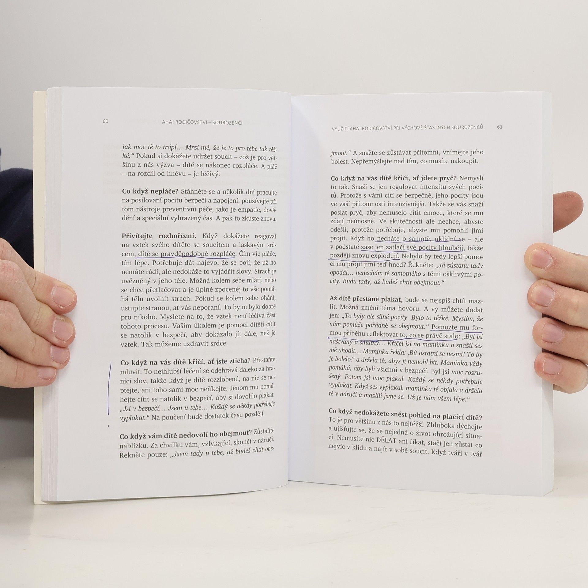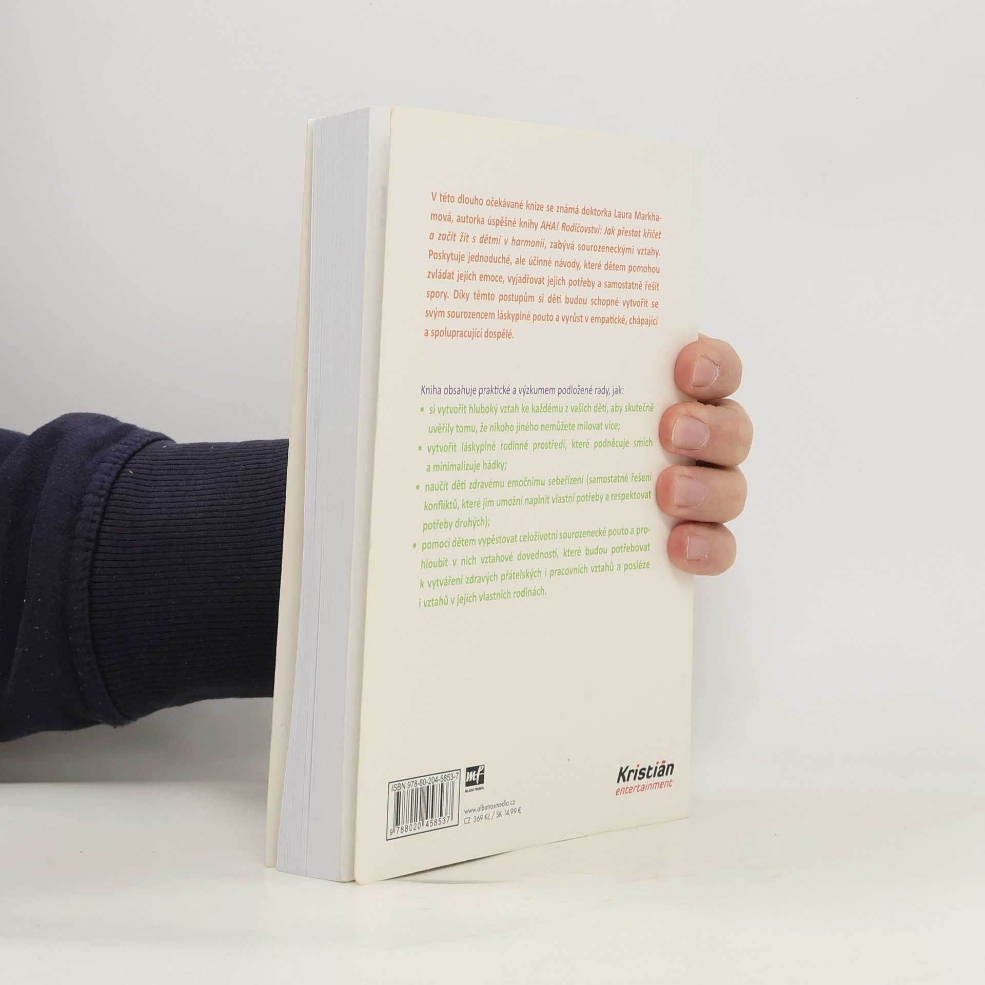 Jak zabránit sporům mezi sourozenci a vychovat z nich přátele na celý život. V této dlouho očekávané knize se známá doktorka Laura Markhamová, autorka úspěšné knihy AHA! Rodičovství: Jak přestat křičet a začít s dětmi žít v harmonii, zabývá sourozeneckými vztahy. Poskytuje jednoduché, ale účinné návody, které dětem pomohou zvládat jejich emoce, vyjadřovat jejich potřeby a samostatně řešit spory. Díky těmto postupům si děti budou schopné vytvořit se svým sourozencem láskyplné pouto a vyrůst v empatické, chápající a spolupracující dospělé. Kniha obsahuje praktické a výzkumem podložené rady, jak: - si vytvořit hluboký vztah ke každému z vašich dětí, aby skutečně uvěřily tomu, že nikoho jiného nemůžete milovat více; - vytvořit láskyplné rodinné prostředí, které podněcuje smích a minimalizuje hádky; - naučit děti zdravému emočnímu sebeřízení (samostatné řešení konfliktů, které jim umožní naplnit vlastní potřeby a respektovat potřeby druhých); - pomoci dětem vypěstovat celoživotní sourozenecké pouto a prohloubit v nich vztahové dovednosti, které budou potřebovat k vytváření zdravých přátelských i pracovních vztahů a posléze i vztahů v jejich vlastních rodinách.