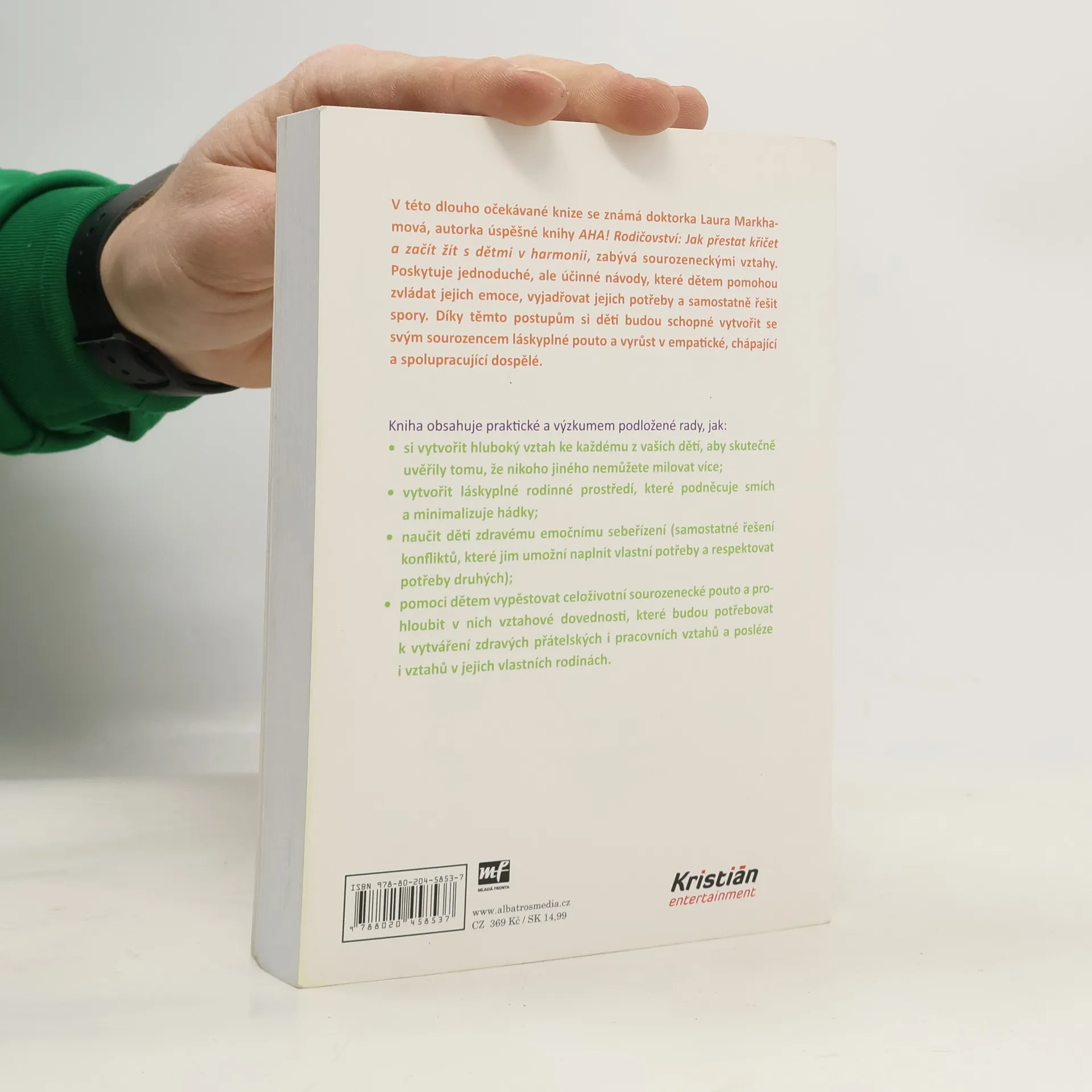 Jak zabránit sporům mezi sourozenci a vychovat z nich přátele na celý život. V této dlouho očekávané knize se známá doktorka Laura Markhamová, autorka úspěšné knihy AHA! Rodičovství: Jak přestat křičet a začít s dětmi žít v harmonii, zabývá sourozeneckými vztahy. Poskytuje jednoduché, ale účinné návody, které dětem pomohou zvládat jejich emoce, vyjadřovat jejich potřeby a samostatně řešit spory. Díky těmto postupům si děti budou schopné vytvořit se svým sourozencem láskyplné pouto a vyrůst v empatické, chápající a spolupracující dospělé. Kniha obsahuje praktické a výzkumem podložené rady, jak: - si vytvořit hluboký vztah ke každému z vašich dětí, aby skutečně uvěřily tomu, že nikoho jiného nemůžete milovat více; - vytvořit láskyplné rodinné prostředí, které podněcuje smích a minimalizuje hádky; - naučit děti zdravému emočnímu sebeřízení (samostatné řešení konfliktů, které jim umožní naplnit vlastní potřeby a respektovat potřeby druhých); - pomoci dětem vypěstovat celoživotní sourozenecké pouto a prohloubit v nich vztahové dovednosti, které budou potřebovat k vytváření zdravých přátelských i pracovních vztahů a posléze i vztahů v jejich vlastních rodinách.