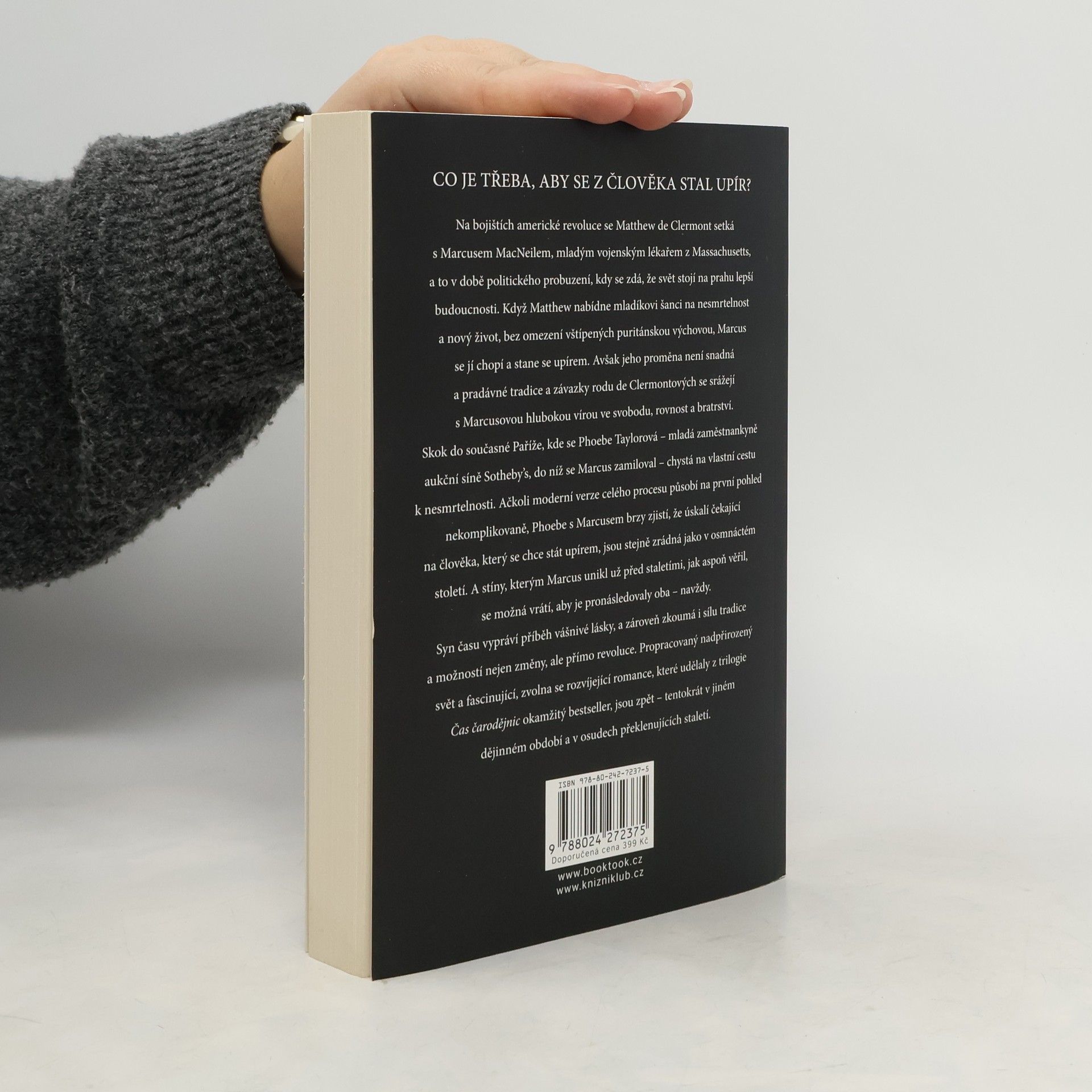 Co je třeba, aby se z člověka stal upír? Na bojištích americké revoluce se Matthew de Clermont setká s Marcusem MacNeilem, mladým vojenským lékařem z Massachusetts, a to v době politického probuzení, kdy se zdá, že svět stojí na prahu lepší budoucnosti. Když Matthew nabídne mladíkovi šanci na nesmrtelnost a nový život, bez omezení vštípených puritánskou výchovou, Marcus se jí chopí a stane se upírem. Avšak jeho proměna není snadná a pradávné tradice a závazky rodu de Clermontových se srážejí s Marcusovou hlubokou vírou ve svobodu, rovnost a bratrství. Skok do současné Paříže, kde se Phoebe Taylorová – mladá zaměstnankyně aukční síně Sotheby’s, do níž se Marcus zamiloval – chystá na vlastní cestu k nesmrtelnosti. Ačkoli moderní verze celého procesu působí na první pohled nekomplikovaně, Phoebe s Marcusem brzy zjistí, že úskalí čekající na člověka, který se chce stát upírem, jsou stejně zrádná jako v osmnáctém století. A stíny, kterým Marcus unikl už před staletími, jak aspoň věřil, se možná vrátí, aby je pronásledovaly oba – navždy. Syn času vypráví příběh vášnivé lásky, a zároveň zkoumá i sílu tradice a možností nejen změny, ale přímo revoluce. Propracovaný nadpřirozený svět a fascinující, zvolna se rozvíjející romance, které udělaly z trilogie Čas čarodějnic okamžitý bestseller, jsou zpět – tentokrát v jiném dějinném období a v osudech překlenujících staletí.