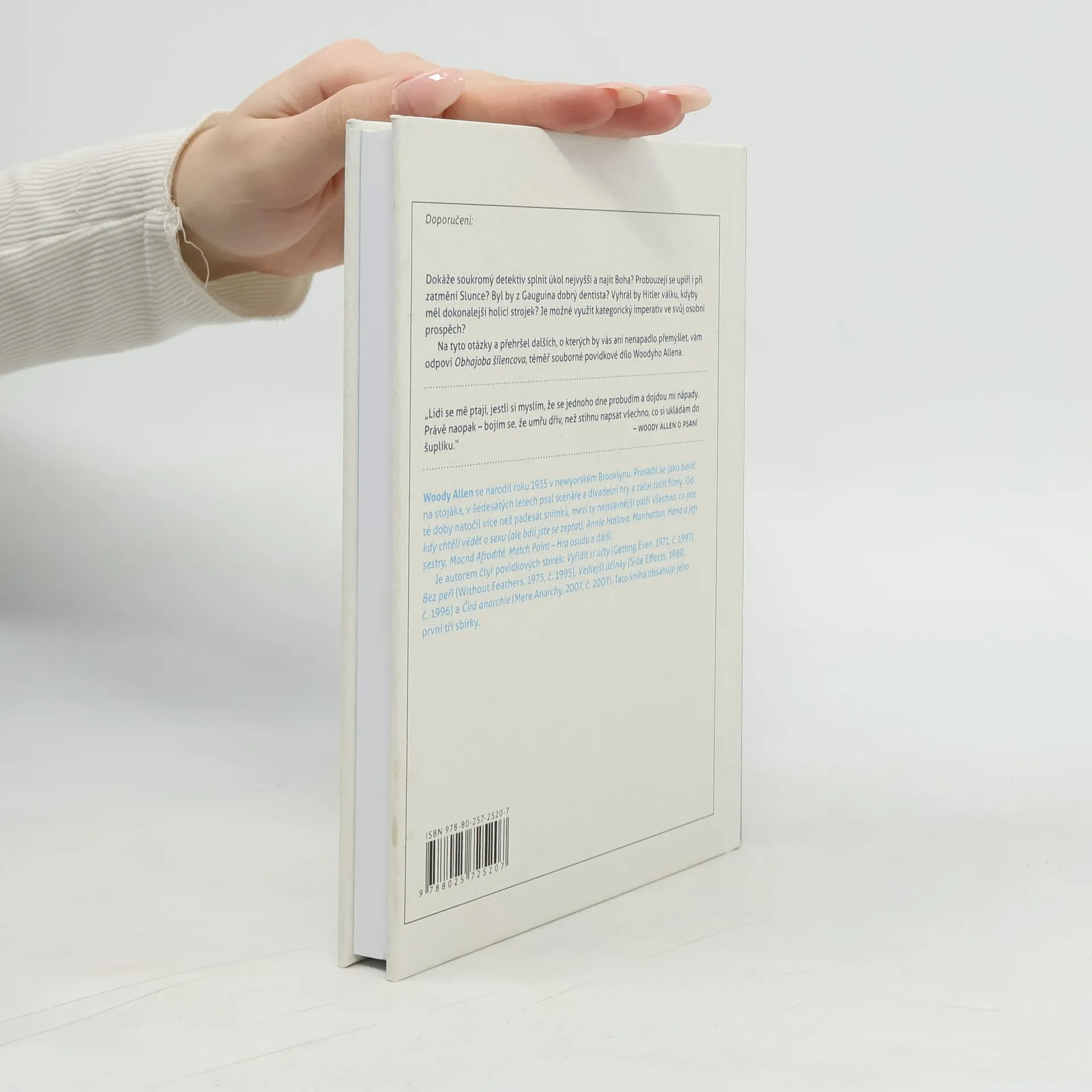 „Opět jsem se pokusil spáchat sebevraždu. Tentokrát jsem si navlhčil nos a strčil jej do zástrčky. Naneštěstí nastal zkrat a pouze jsem vykopl ledničku. Stále posedlý myšlenkou na smrt, ustavičně přemítám. Jestlipak je posmrtný život? Pokud ano, rozmění mi tam dvacku?“ V Obhajobě šílencově, téměř souborném vydání povídkového díla Woodyho Allena (obsahuje sbírky Vyřídit si účty, Bez peří a Vedlejší účinky) narazíte nejen na šílenou filozofii, ale též filozofické šílení. Je to totéž? A jak to poznat? Jak se vyrovnat s géniem, který pod vámi neustále podtrhává sesli? Obhajoba šílencova potěší každého fanouška Woodyho Allena. A koho nepotěší, ten je prostě šílenec.