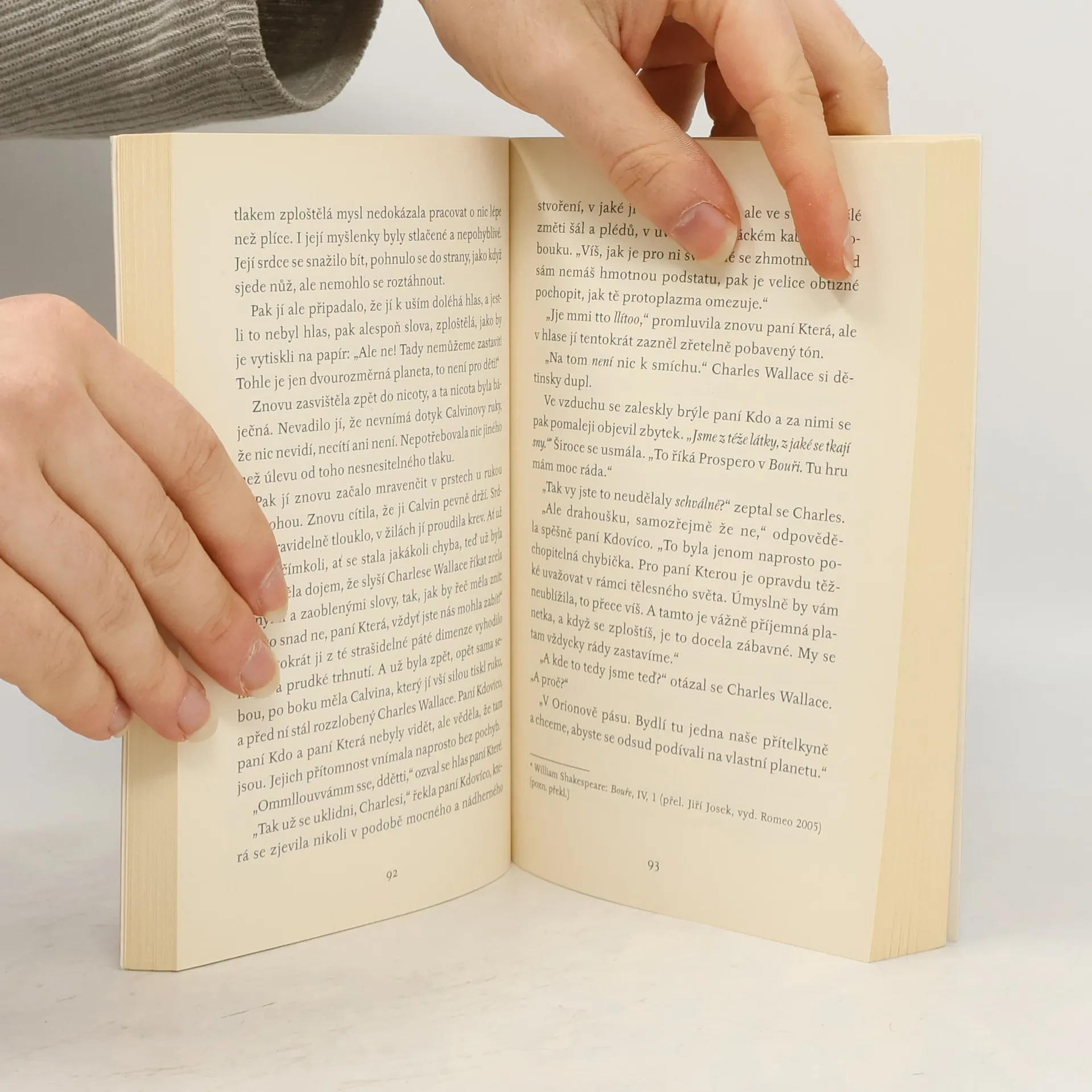 Třináctileté Meg Murryové se poslední dobou moc nevede. Připadá si nemožná, nehezká, ve škole se jí nedaří, nikam nezapadá. O jejím pětiletém bratru Charlesovi kolují ošklivé pomluvy, a ke všemu musí poslouchat vlezlé narážky na záhadné zmizení svého táty, talentovaného fyzika, který se pořád nevrací. Jedné temné bouřlivé noci ale do domu Murryových zavítá nečekaná, podivná návštěva – paní Kdovíco. Jak se ukáže, paní Kdovíco má ještě dvě stejně podivné přítelkyně, a všechny tři chtějí Meg a Charlesovi pomoct najít tátu. Aby se za ním ale obě děti dostaly, musí se vydat na nebezpečnou cestu napříč prostorem a časem a za pomoci svého kamaráda Calvina svést bitvu s temnotou, která postupně zahaluje celý vesmír. Madeleine L'Engle se podařilo stvořit mimořádný nadčasový příběh, který se stal opakovaně vydávanou klasikou žánru na pomezí sci-fi a fantasy pro mladé čtenáře. V roce 2018 uvádí společnost Walt Disney Pictures film natočený podle tohoto oceňovaného díla.