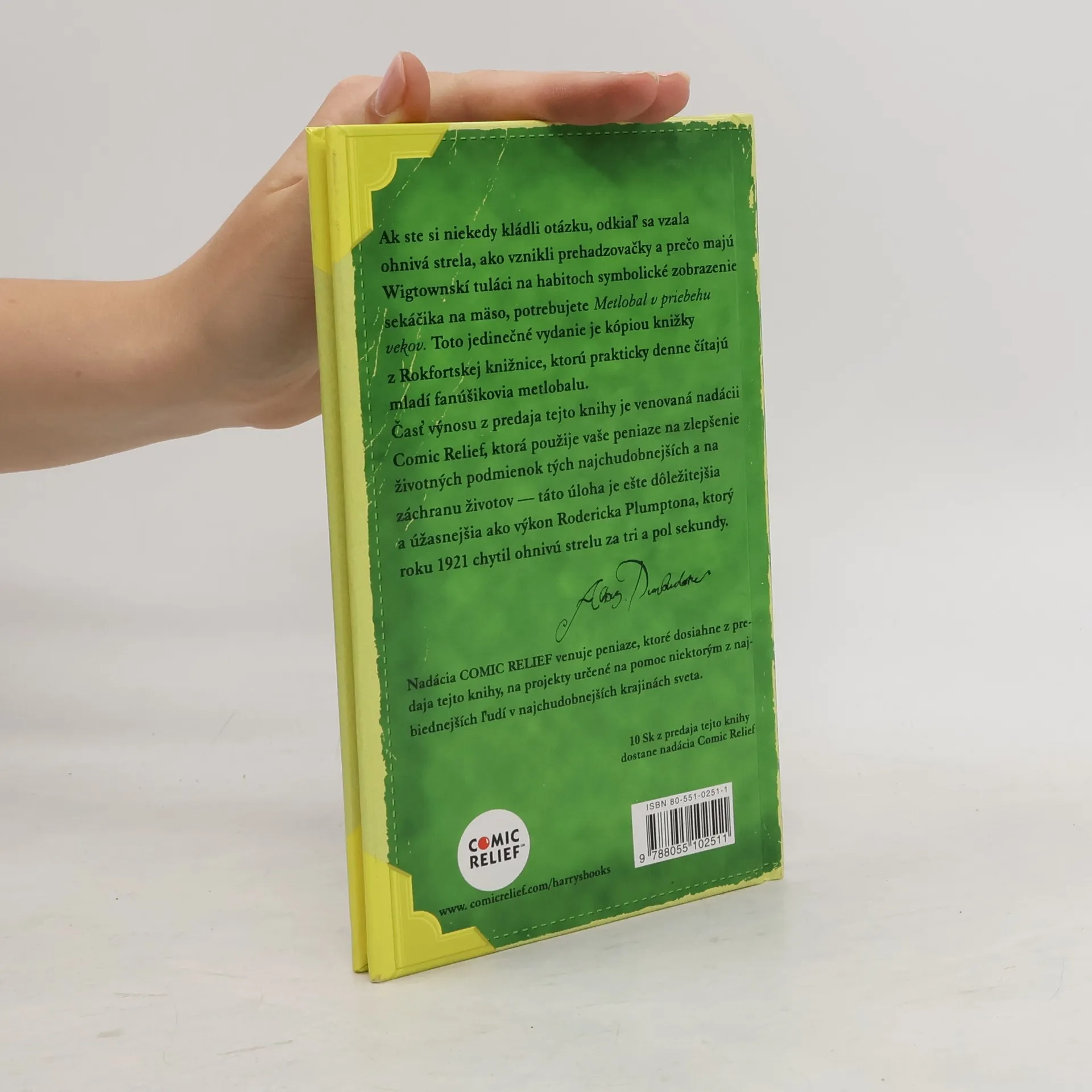 Toto jedinečné vydanie je kópiou knižky z Rokfordskej knižnice, ktorú prakticky denne čítajú mladí fanúšikovia metlolabu. Ak ste si niekedy kládli otázku, odkiaľ sa vzala ohnivá strela, ako vznikli prehadzovačky a prečo majú Wigtownskí tuláci na habitoch symbolické zobrazenie sekáčika na mäso, potrebujete túto knižku. Časť výnosu z predaja tejto knižky je venovaná nadácii Comic Relief, ktorá použije vaše peniaze na zlepšenie životných podmienok tých najchudobnejších a na záchranu životov - táto úloha je ešte dôležitejšia a úžasnejšia ako výkon RoderickaPlumptona, ktorý roku 1921 chytil ohnivú guľu za tri a pol sekundy. Upozornenie: Kniha je veľmi vhodná pre tých čitateľov, ktorí trpia úplne neškodnou závislosťou na čitaní príbehov o mladom čarodajníkovi Harrym Potterovi.