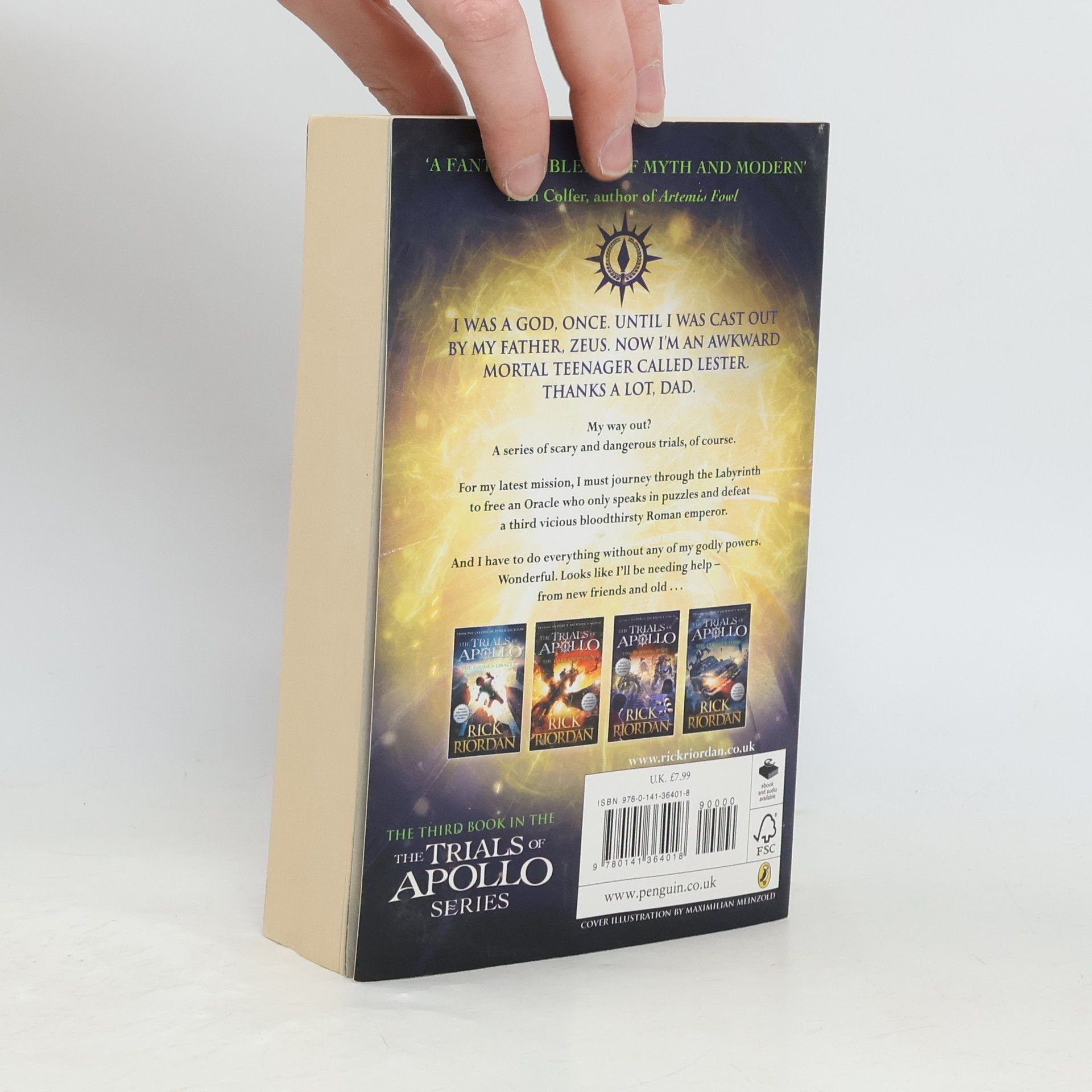 I WAS A GOD, ONCE. UNTIL I WAS CAST OUT BY MY FATHER, ZEUS. NOW I'M AN AWKWARD MORTAL TEENAGER CALLED LESTER. My way out? A series of scary and dangerous trials, of course. For my third mission, I must- Journey through the Labyrinth to free an Oracle who only speaks in puzzles. Which sounds easy. Then, defeat the most vicious of three very vicious Roman Emperors. Is that all? No, I have to do everything without any of my godly powers. Wonderful. Looks like I'll need all the help I can get - from new friends, and old . . .