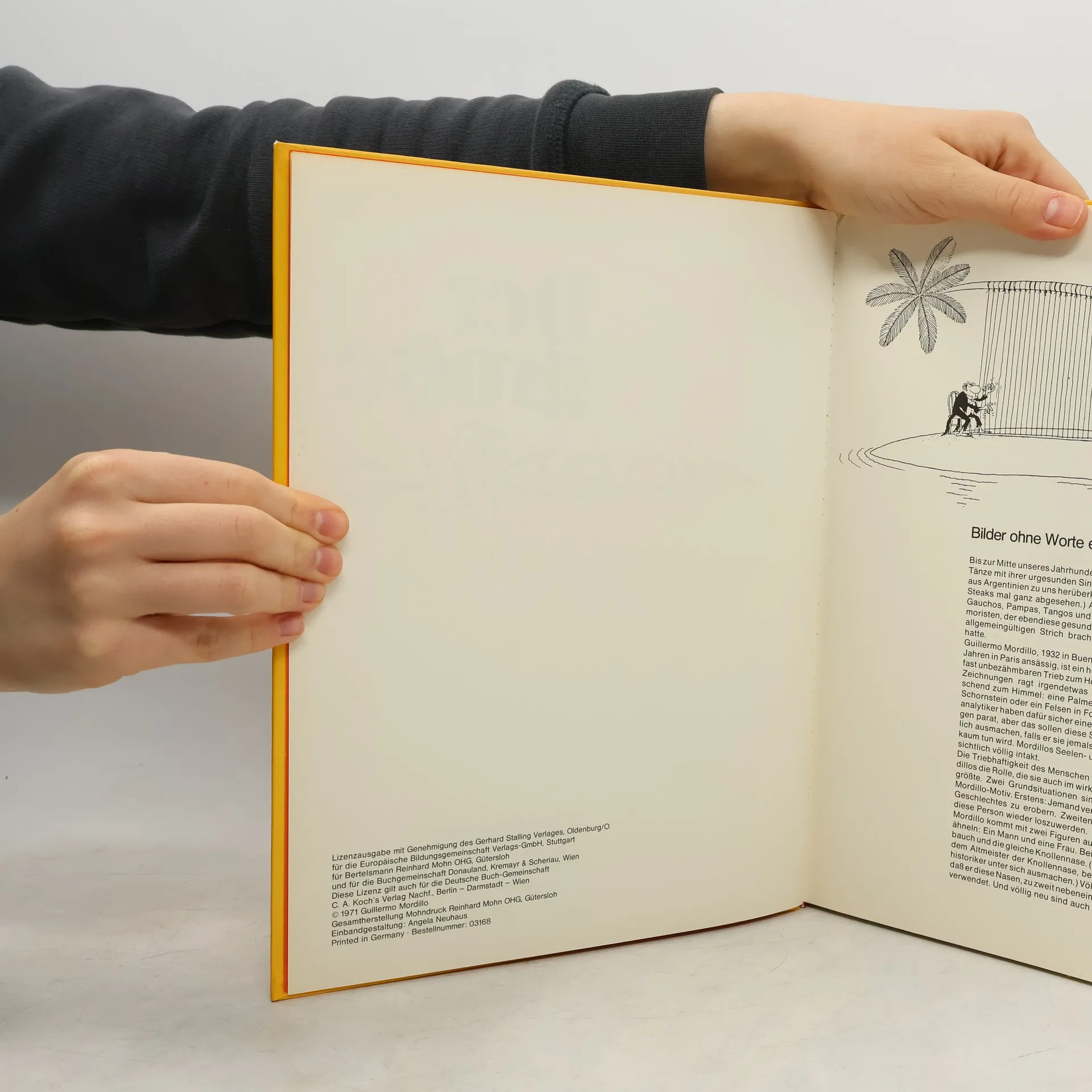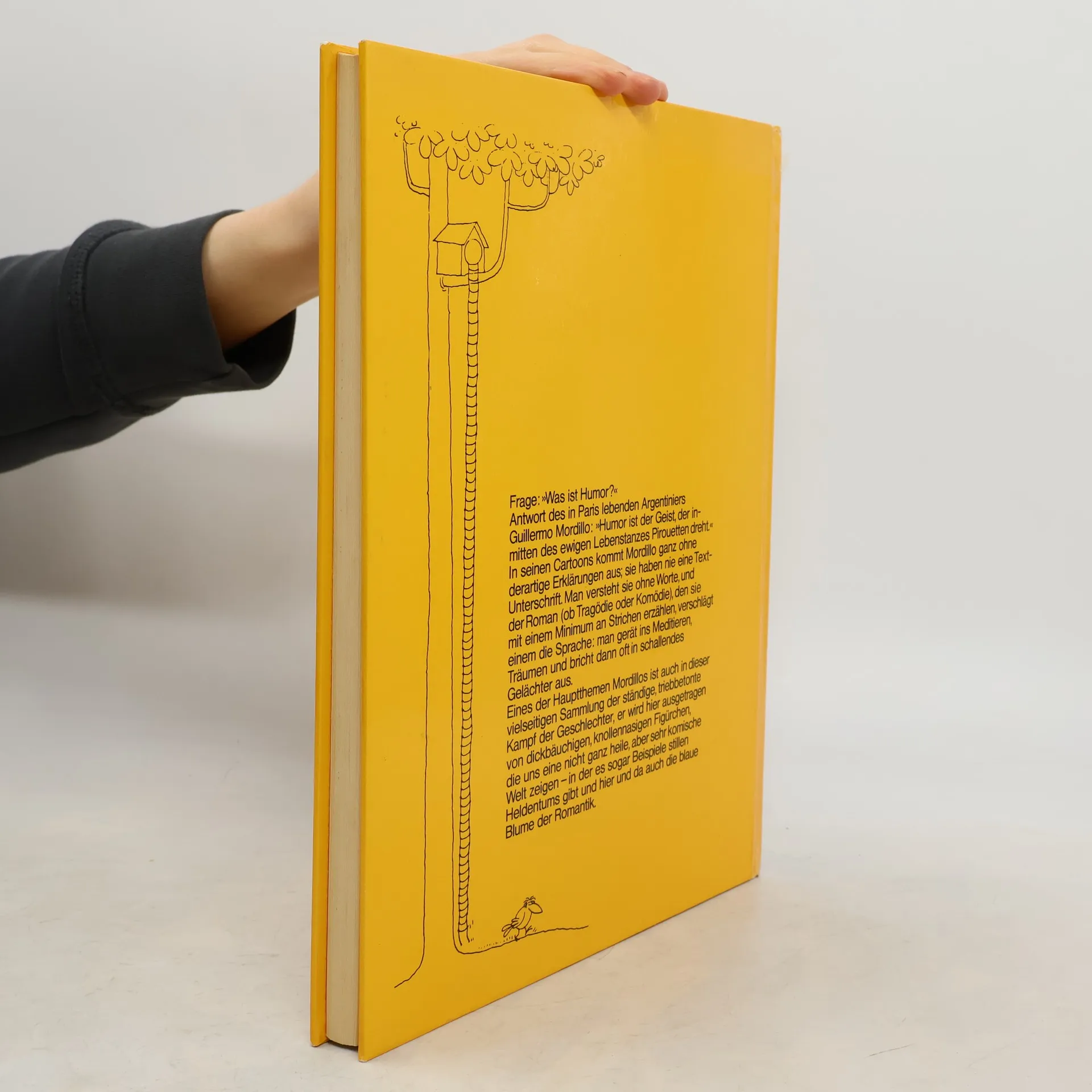 Frage: "Was ist Humor?" Antwort des in Paris lebenden Argentiniers Guillermo Mordillo: "Humor ist der Geist, der inmitten des ewigen Lebenstanzes Pirouetten dreht." In seinen Cartoons kommt Mordillo ganz ohne derartige Erklärungen aus; sie haben nie eine Text-Unterschrift. Man versteht sie ohne Worte, und der Roman (ob Tragödie oder Komödie), den sie mit einem Minimum an Strichen erzählen, verschlägt einem die Sprache: man gerät ins Meditieren, Träumen und bricht dann oft in schallendes Gelächter aus. Eines der Hauptthemen Mordillos ist auch in dieser vielseitigen Sammlung der ständige, triebbetonte Kampf der Geschlechter, er wird hier ausgetragen von dickbäuchigen, knollennasigen Figürchen, die uns eine nicht ganz heile, aber sehr komische Welt zeigen - in der es sogar Beispiele stillen Heldentums gibt und hier und da auch die blaue Blume der Romantik.